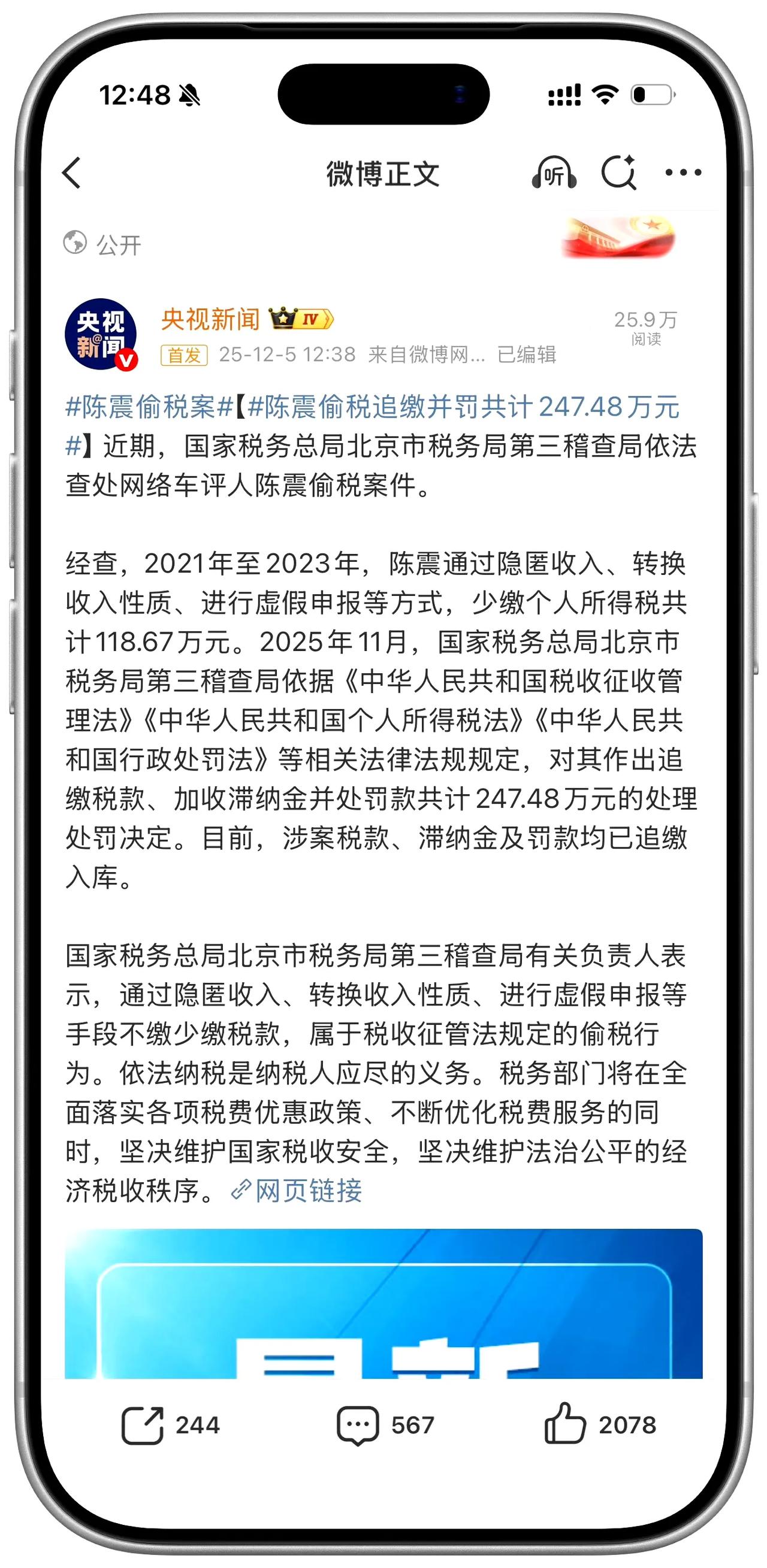车评人陈震偷税被罚247万:网红经济别踩法律红线 近日,知名车评人陈震因偷税被罚247.48万元的消息冲上热搜。税务部门通报,2021年至2023年间,陈震通过隐匿收入、转换收入性质等方式少缴个税118.67万元,最终被追缴税款、滞纳金并处罚款。目前所有款项已追缴入库。 此事再次给网络从业者敲响警钟。近年来,网红、主播等高收入群体偷逃税案件屡见不鲜,表面看是“税务筹划”,实则是漠视法律。无论名气多大、流量多高,依法纳税都是不可逾越的红线。 网络经济不是法外之地。税务部门“坚决维护国家税收安全”的表态,彰显了执法一视同仁的决心。这也提醒所有从业者:流量带来的不仅是收益,更是社会责任。合法经营、诚信纳税,才是长久发展之道。 税收取之于民、用之于民。每一分税款都关乎公共利益,任何偷逃行为都是对社会公平的破坏。期待此案能推动行业自律,让网红经济在法治轨道上行稳致远。