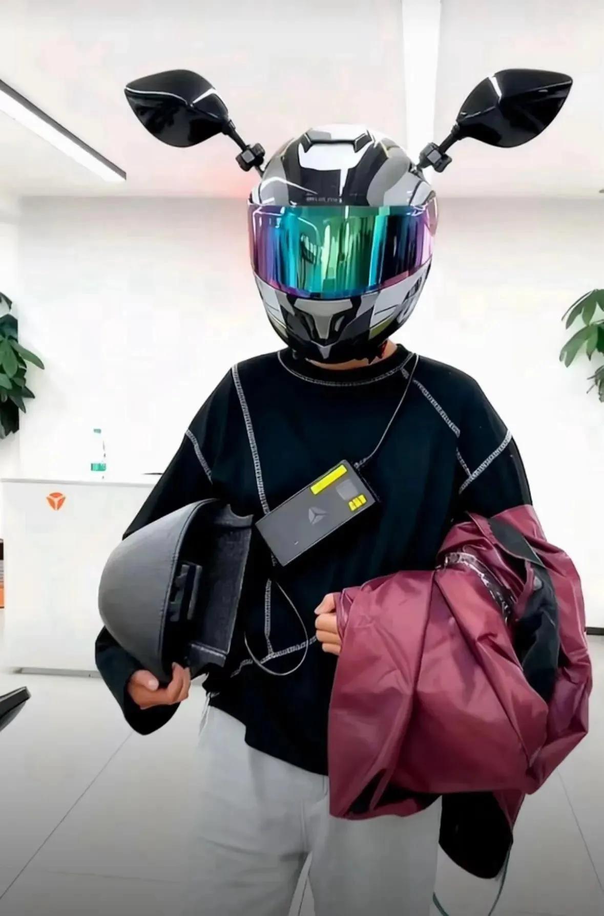 真的是又要让我笑不活了 一个卖电动车的实体店老板说,最新款的这种类型电动车不实用,没有卖点,而且头盔和充电器都没有地方放! 万万没想到,在评论区我又看到了天才般的网友,直接晒出靓照。所有装备全部装身上了,左手底座,右手雨衣,胸前挂充电器,头顶安全帽,安全帽上一开始我以为是两只耳朵,结果认真一看居然是两个后视镜! 这基本上凑齐套神装了啊!可以说是配备齐全! 果然这届网友个个都是人才来着,大家觉得这一身装备怎么样?