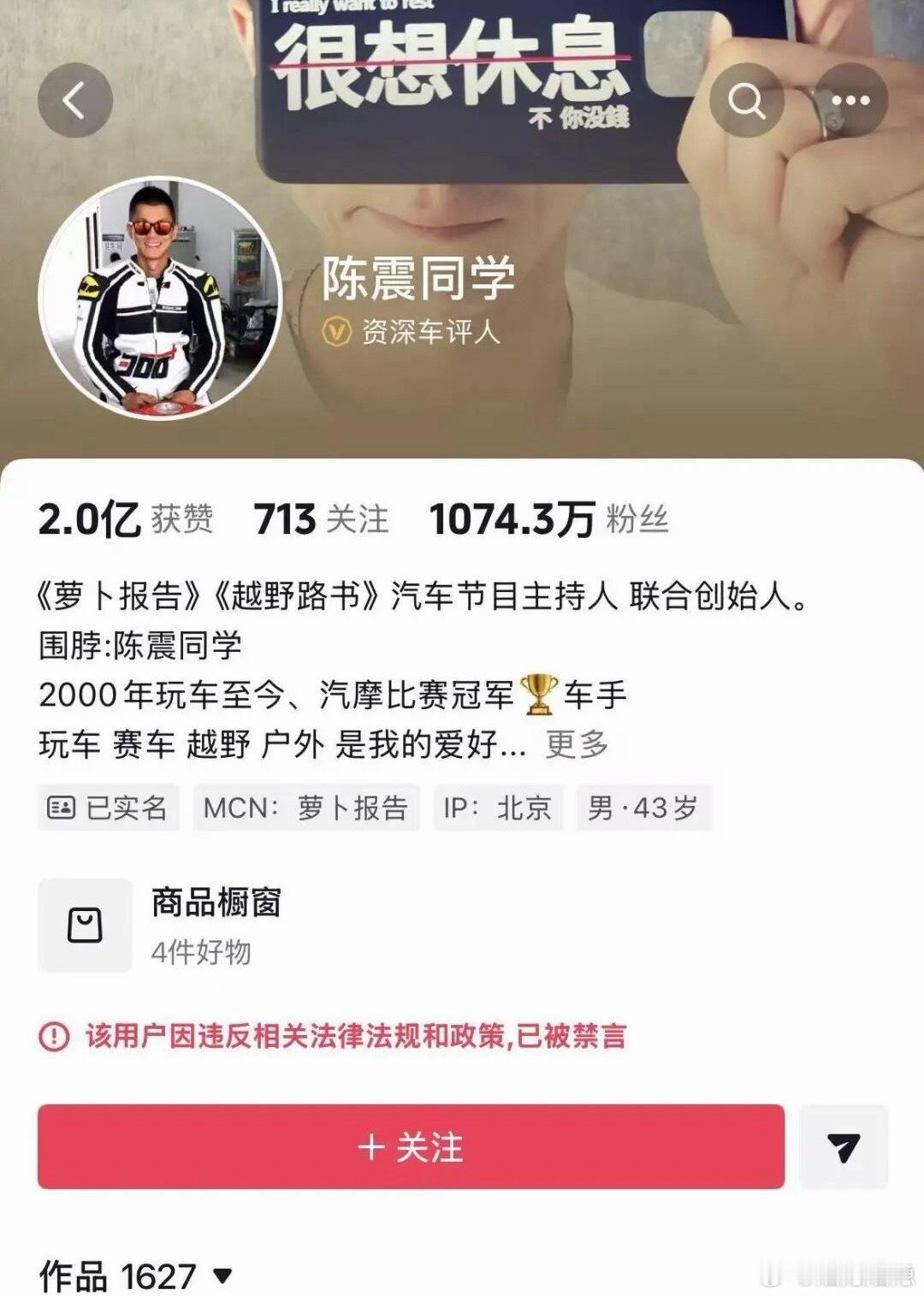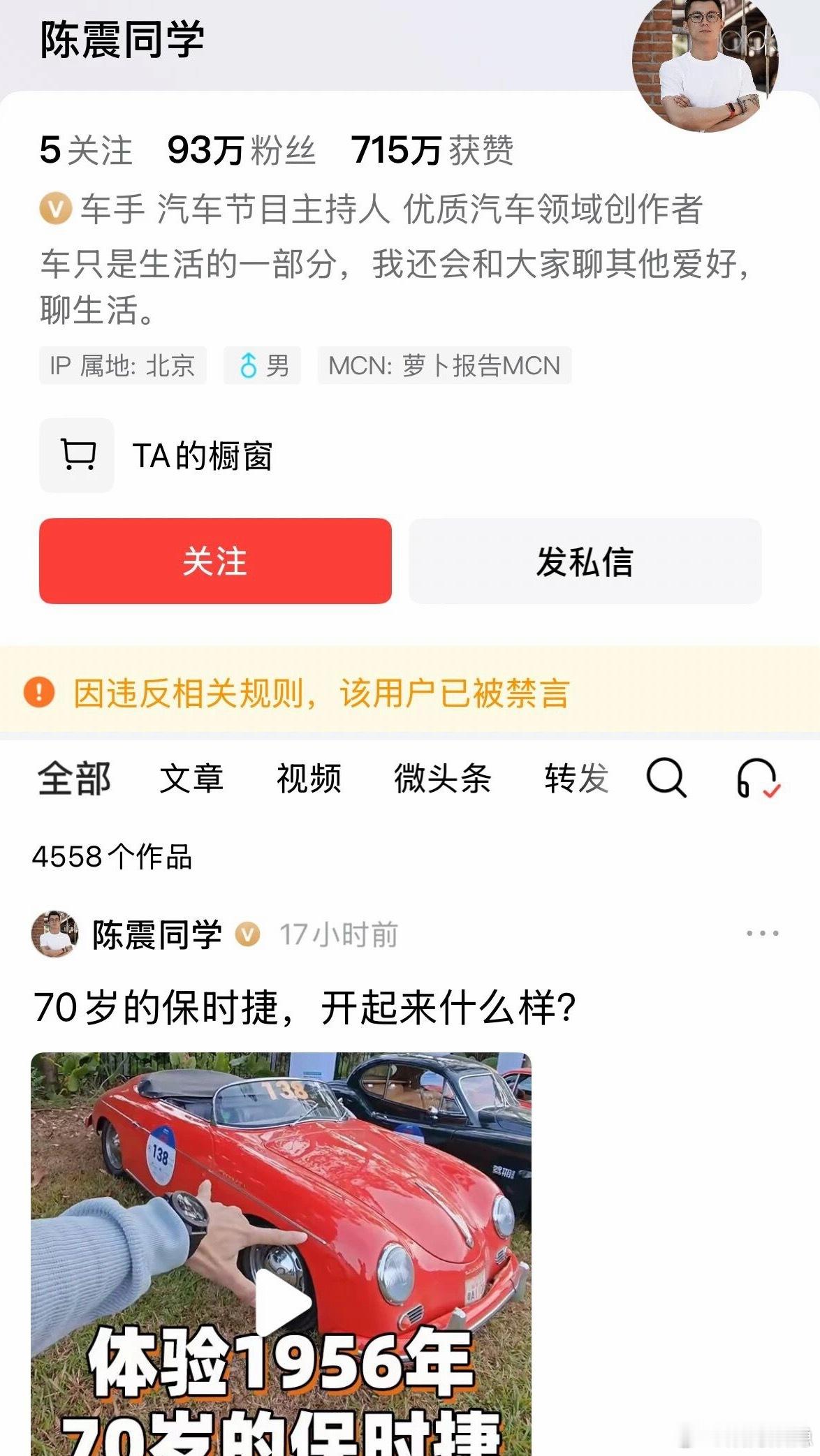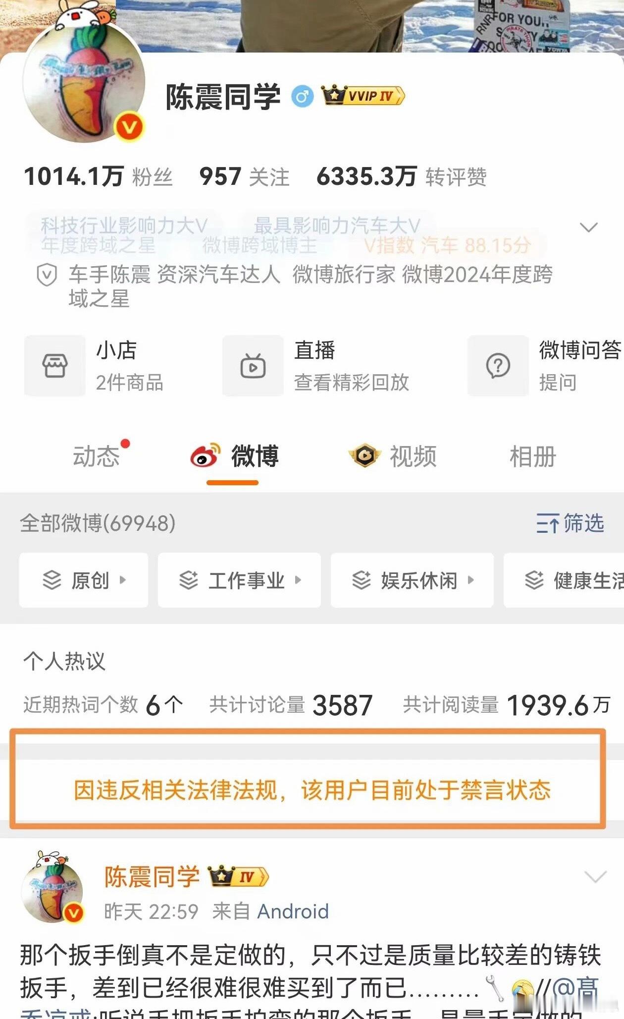 总惦记着风浪越大鱼越贵,却忘了能力越大责任越大。昨晚,知名车评人陈震突遭多个社交平台禁言,可谓一语成谶。禁言的直接导火索,可能指向陈震发布的一则视频。他在视频中声称卖天山蜜薯的姐姐战胜了7000法务,在遭到网友对7000人法务规模违背企业常理的质疑后,陈震辩称以为是部门名称。该言论可能被平台判定为涉嫌散布虚假信息。各平台封禁理由分别是:抖音、B站标注违规性质,小红书称“违反社区规则”,微博账号则在短暂解封后再度受限。陈震多平台被禁言陈震回应被全平台禁言汽场全开