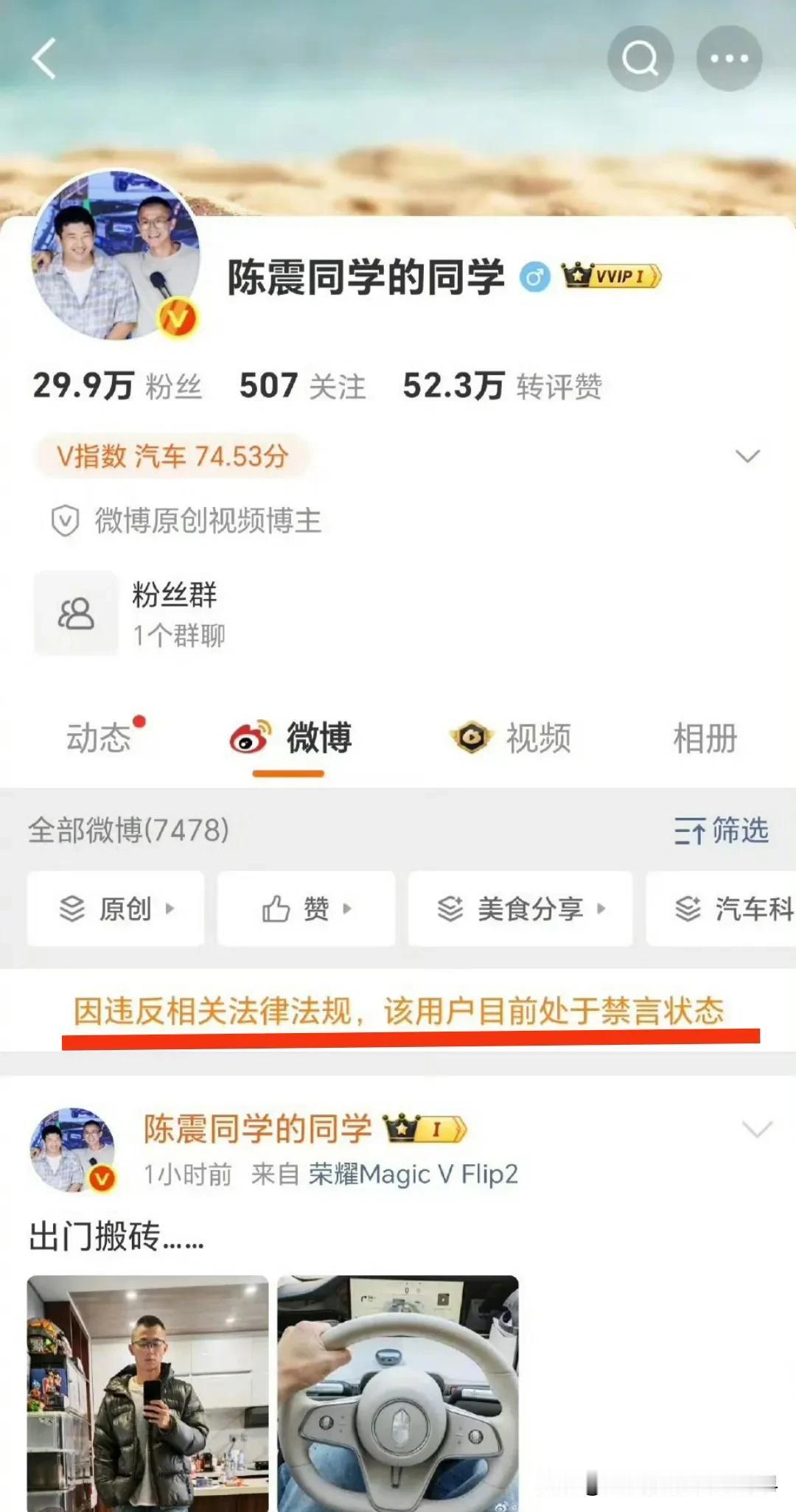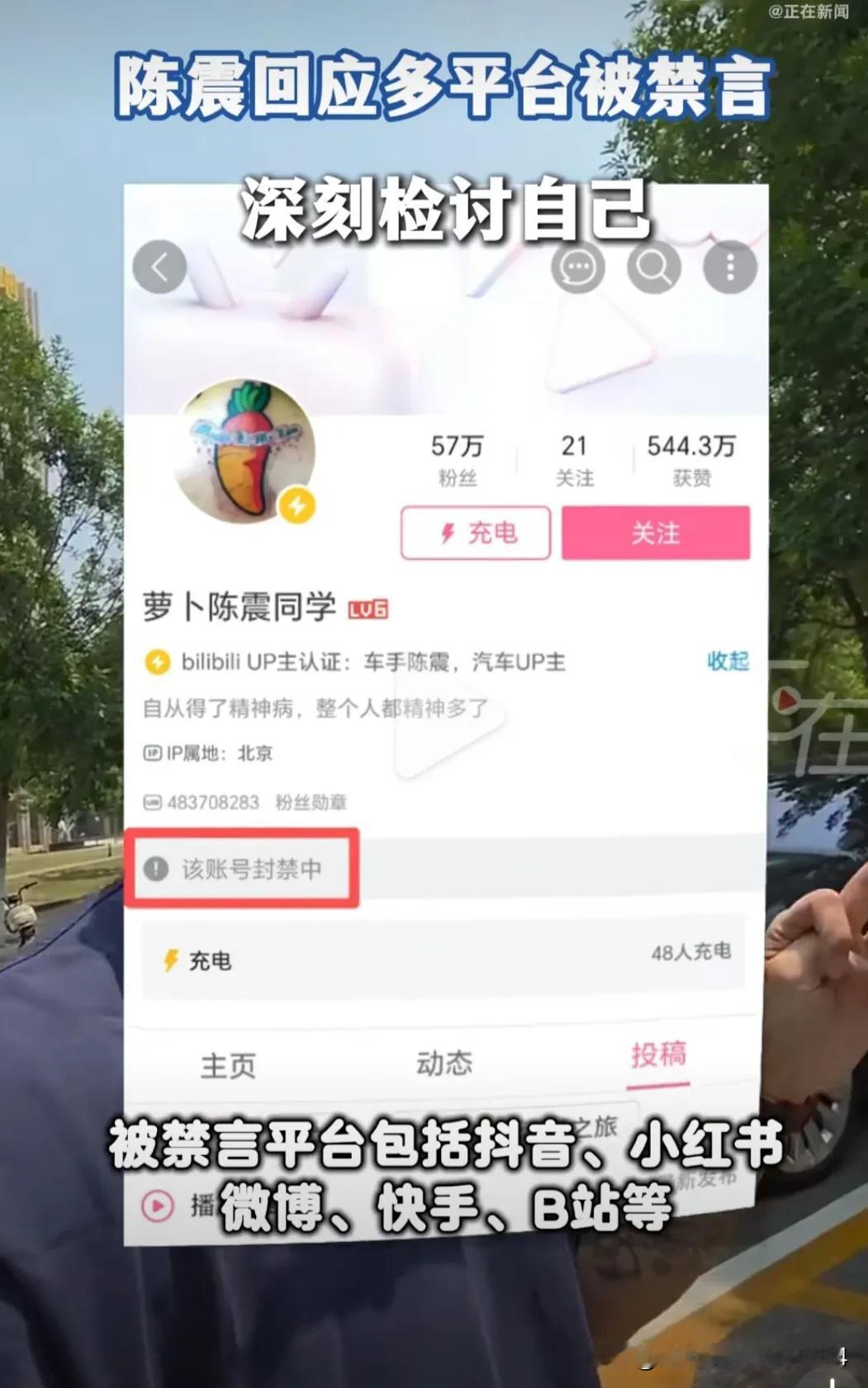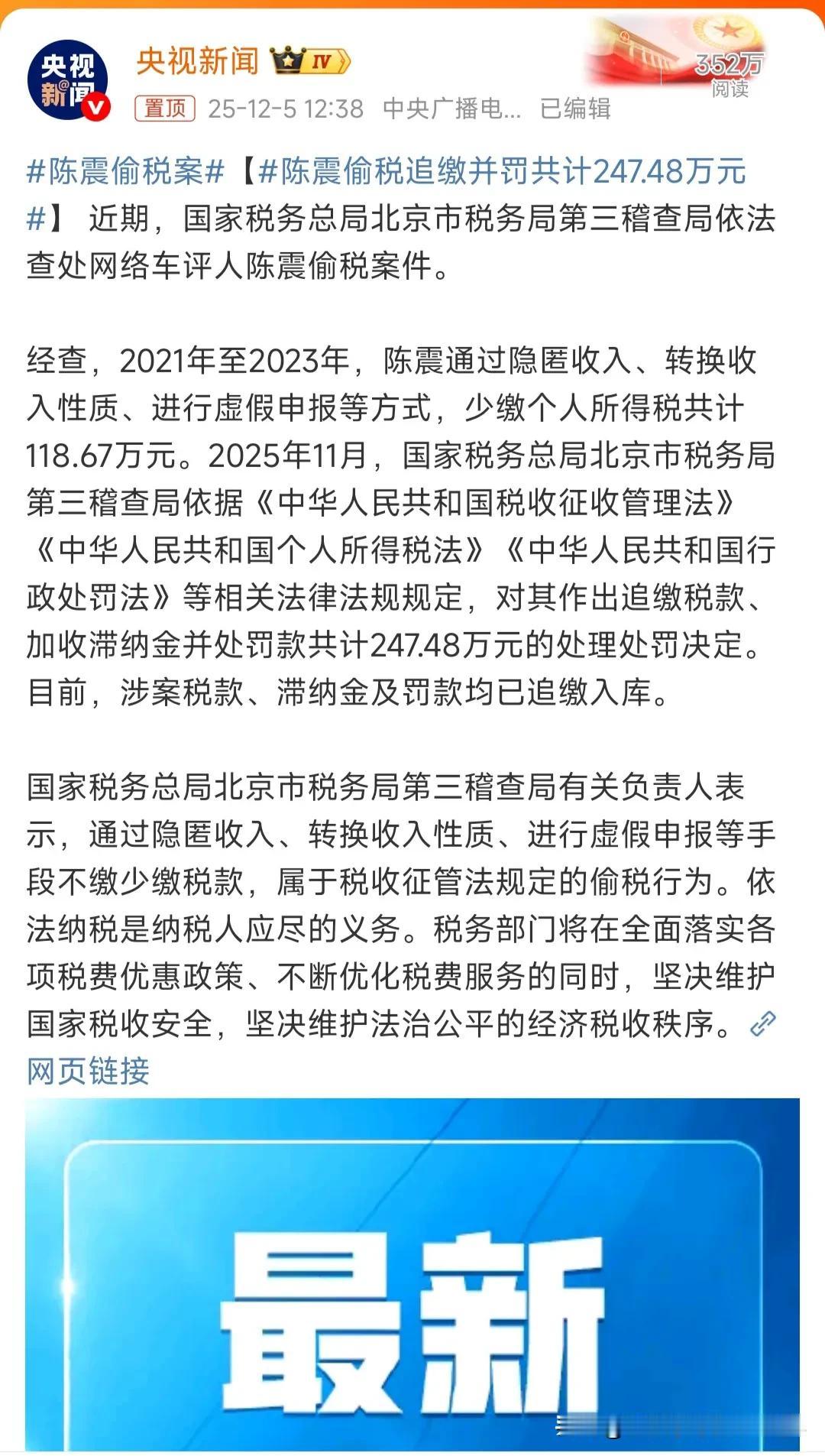 大V网红陈震不仅全平台账号被封、小号被禁言,偷税118.67万也被曝了出来。查了下,可能主要有以下几个原因: 1,阴阳小米的捐款。为了话题流量,天灾人祸面前,阴阳善举,触碰红线,那真有点活该!一点良知都没有,过惯了好日子! 2,陈震名下一个关联公司,据说欠税被告了;而他本人年入上亿,21年-23年却还偷税118.67万元。目前,追缴并罚的247.48万元陈震已上缴。 3,大V本应该要有社会责任感,传播正能量。可他作为著名车评人,粉丝两千多万,近两年可是没干实事,只顾着裹挟流量赚钱了! 对此,陈震视频回应:早上起来也很突然,没啥可说的,检讨自己。吃一堑,长一智,会深刻反思自己。 网友:早上还看见他上小号得瑟发商单呢。他不是知道错了,他是知道他要完了。 您怎么看?