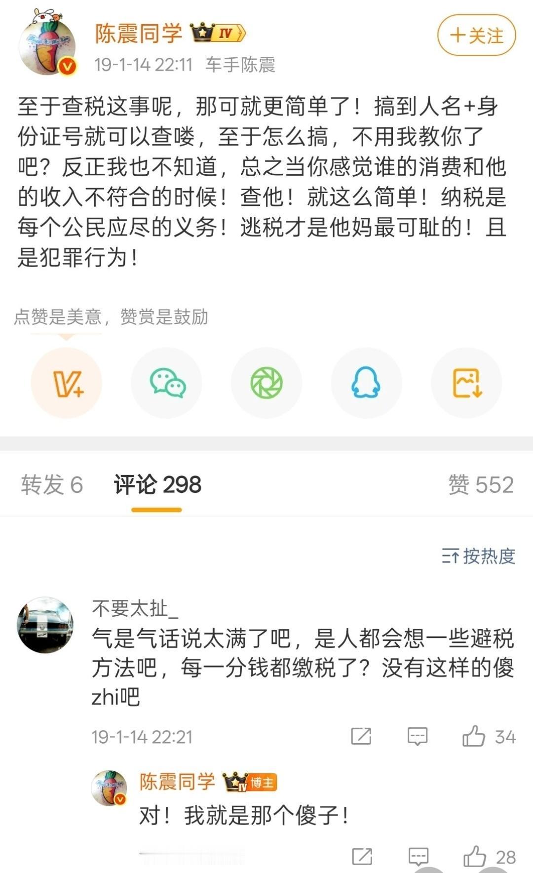 这你受得了吗?知名车评人陈震因为偷税被央视通报了,还是点名通报的。 之前陈震全网账号被封杀,大家还以为是得罪某车企或者说了什么不该说的话,如今看来好像就是他本人的问题。 更离谱的是,他在几年前还信誓旦旦得在税务方面表个态,字里行间都好像跟偷税漏税深恶痛绝。 没想到啊,他自己在这方面翻了车。 这么大一个网红,因为100多万被封杀,你说何苦呢?