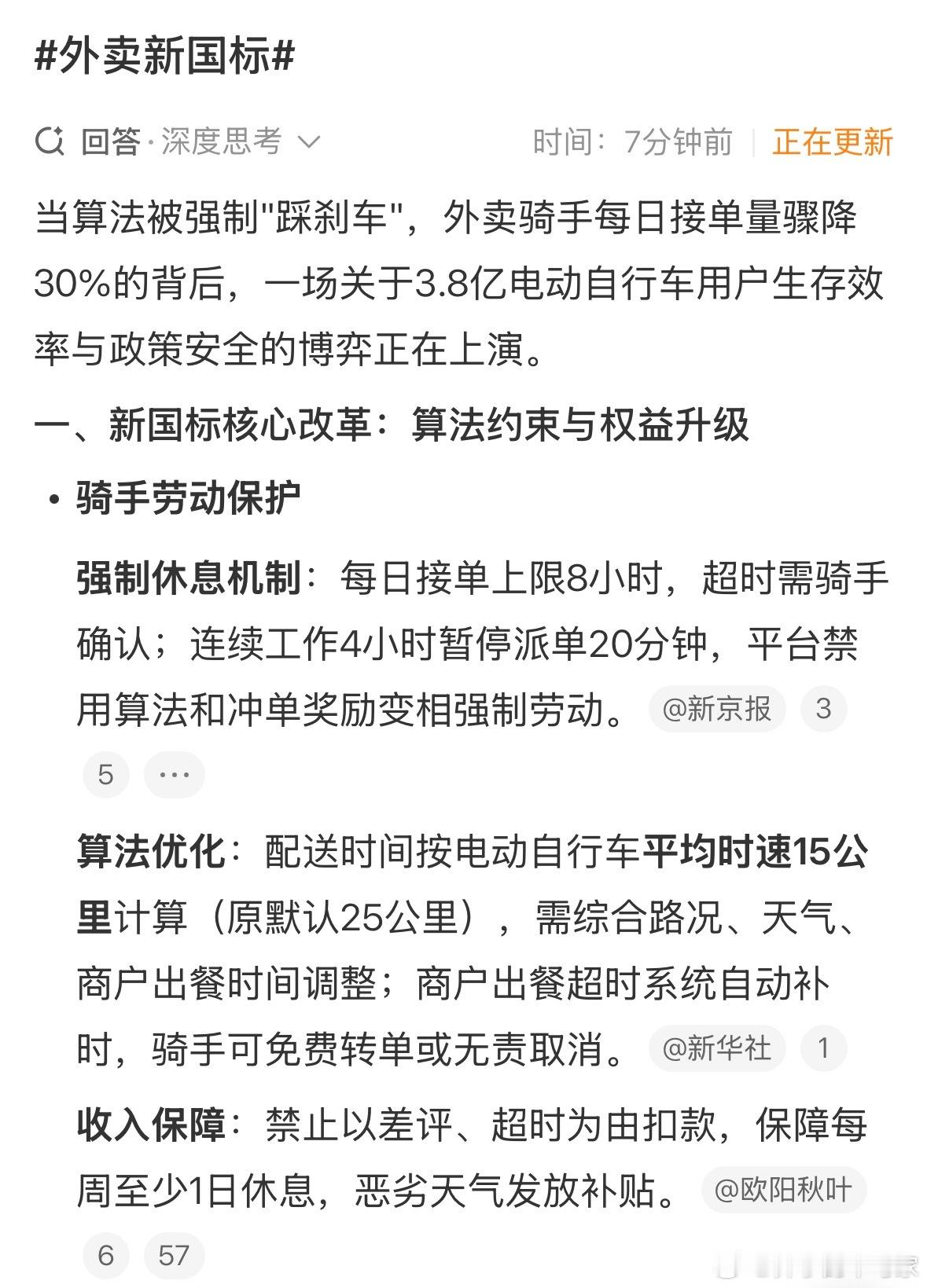 总结🔺针对幽灵外卖,平台必须人工或技术审查,每月抽查比例不低于5%🔺骑手接单4小时强制休息20分钟,8小时候需要自己确认是否继续🔺电动车时速不超过15km/h🔺不得随意罚款,节假日、恶劣天气发放补贴🔺平台不能限流不参与活动的商家外卖新国标