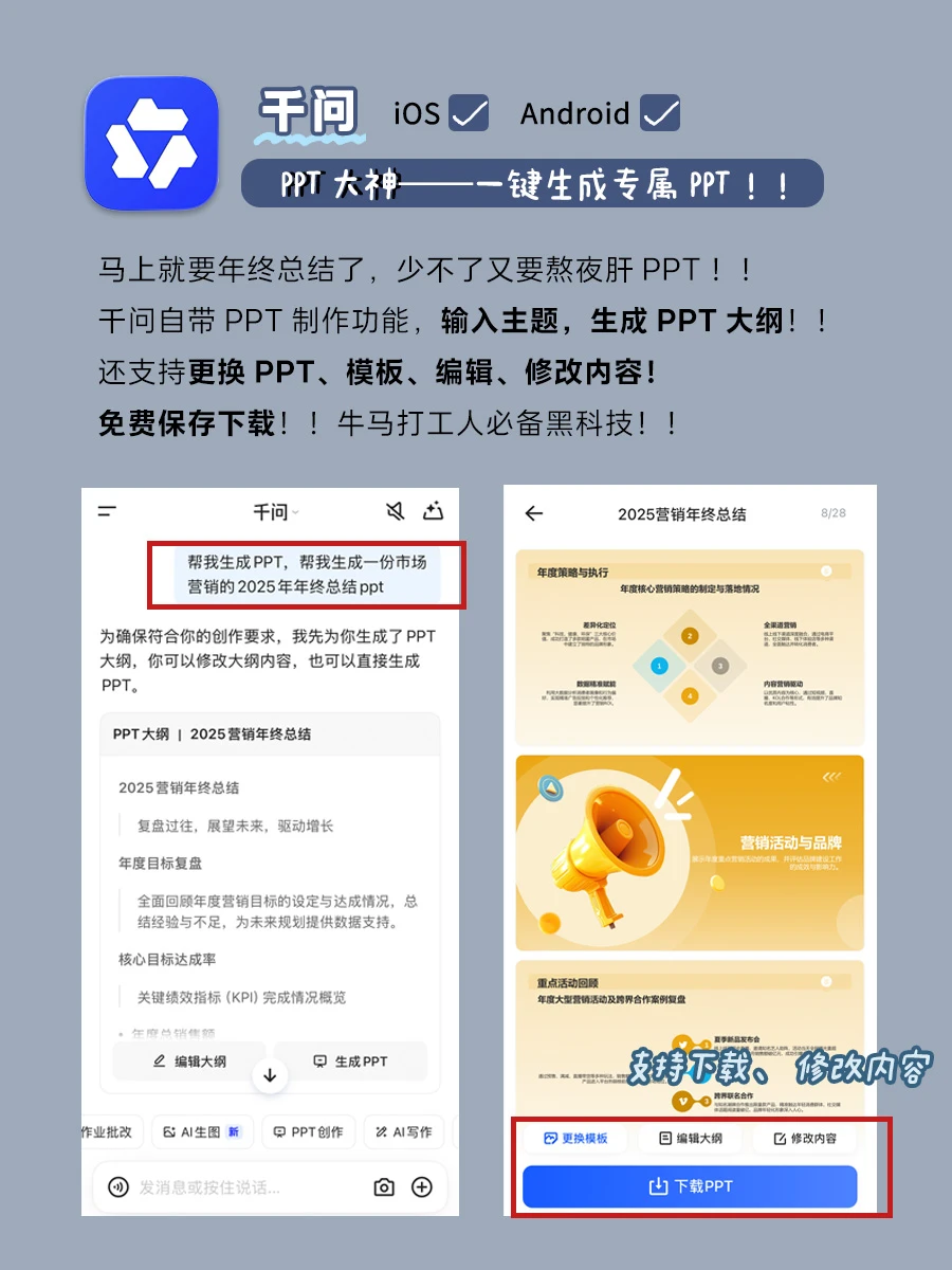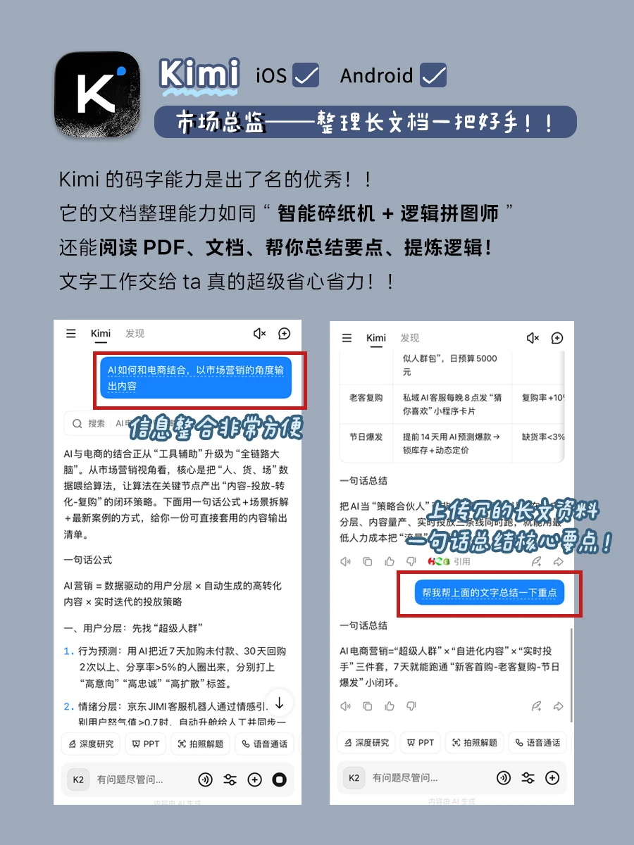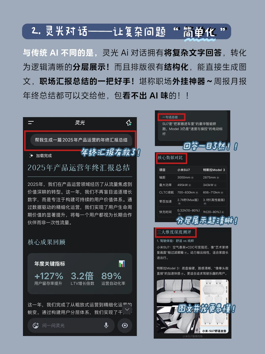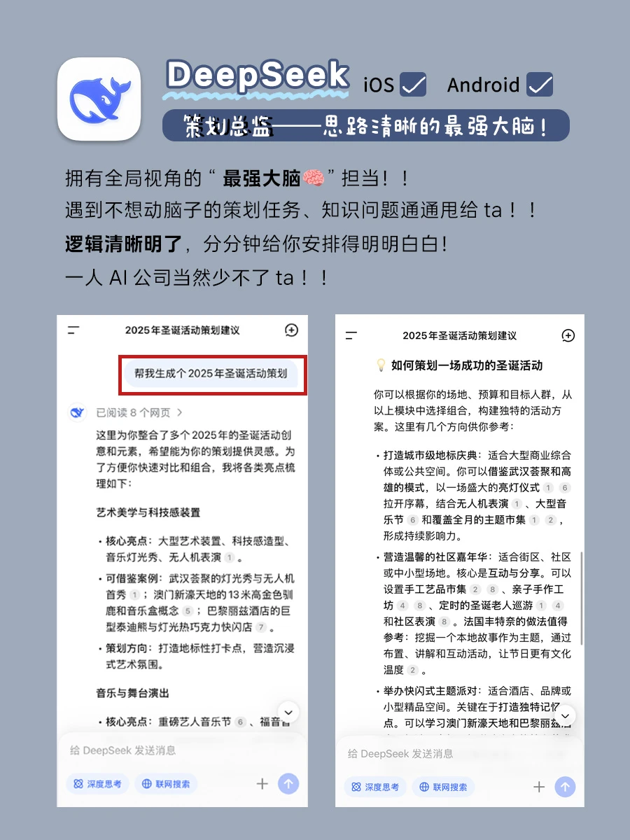 - 一个人干完整个公司的活,真不是天方夜谭! 只要找对帮手~领导有嫡系, 咱们打工人也要建立自己的嫡系AI团队! 今天分享8个让你打工效率拉满的王炸组合! 个个都是AI黑科技,让你的工作效率直接拉满! 💡全能王者:灵光 最近风很大的AI助手,不光回复内容逻辑更清晰,而且排版很有结构化,能直接生成图文,职场汇报总结的一把好手!堪称职场外挂神器~周报月报年终总结都可以交给他,包看不出AI味的! 值得一提的是,你还可以一句话生成各种专属于自己的小应用!实行性太强了,你可以diy各种你需要的小应用! 例如,可以帮我制作一个“今天吃什么的应用”、“制作一个摸鱼小应用”…想要什么,一句话就能生成!持续聊天,还能不断完善应用功能! 💡剪辑狂魔:可灵 简单几句指令,便能发挥你的想象力制作出网上很火的图生视频、文生视频。让创意动起来~视频质量可达1080P,通过视频续写,还可以生成长达3分钟的创意内容。 💡市场总监:Kimi 不想整理的资料、长文档、会议内容通通丢给ta!都能给你整理得逻辑分明、一看就清晰! 💡PPT大神:千问 制作PPT没有方向、配色没有灵感?直接输入关键词,让ta帮你自动生成! 💡策划总监:DeepSeek 拥有全局视角的“蕞强大🧠”!遇到不想动脑的策划方案,和他说总是能安排得明明白白! 💡贴心助理:点点 攻略型专家,据说是官方Ai!无法解决的麻烦事都能问它!一个什么都有点小懂的私人小秘,随叫随到! 💡创意顾问:即梦 集合了现如今全网AI新玩法、打开ta就知道最近流行什么!只需要一句话,就能制作风格统一、有创意的视觉内容!几乎承包了我所有的创意源泉! 💡数据追踪高手:文心 再也不用羡慕同事花里胡哨的导图是怎么制作的了!直接用它输入一句话,各种复杂导图信手拈来!数据分析、复盘总结、调研、搭建框架都很适用!你说ta厉不厉害!!