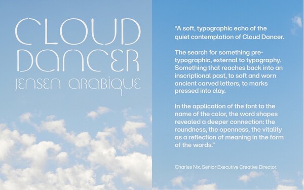 上海2025年12月5日/美通社/--2026年12月4日,蒙纳字库为年度Pantone色彩PANTONE11-4201CloudDancer赋予了其首个字体表达。这一表达由蒙纳资深执行创意字体总监CharlesNix选定,即JensenArabique™字体。该字体由独立设计师JasonCastle于三十余年前创作,灵感源自GustavJensen的经典字母设计。