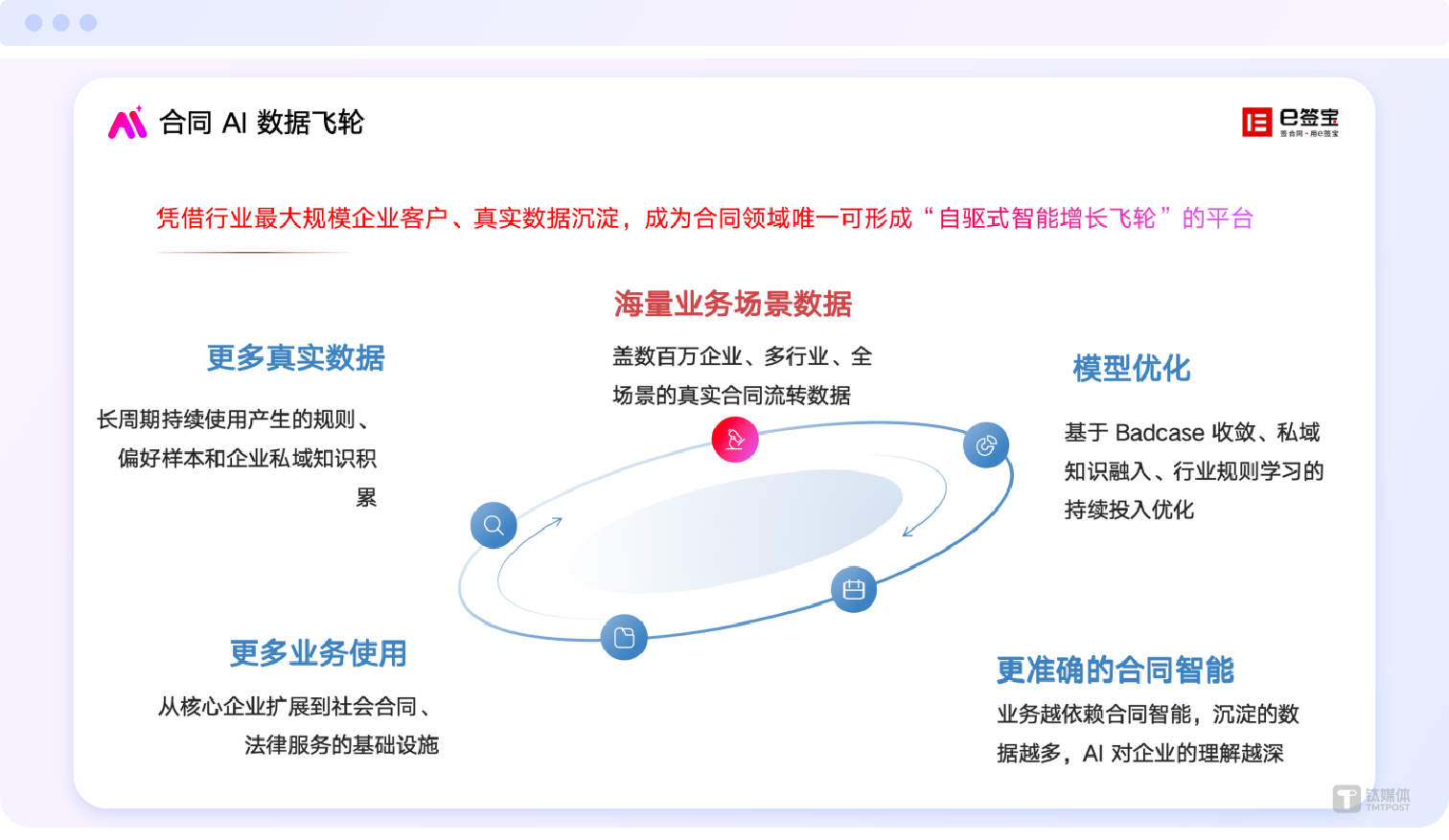 这套体系的核心竞争力,首先体现在其独一无二的数据资产与工程能力上。e签宝从超过2400亿次真实签署、审查、修改与履约行为中沉淀下来的“真实的高质量数据”,并非来自互联网公开爬取或合成生成,每一次用户操作都是一次反馈,每一次合同流转都是一次训练,形成了一个强大的“客户使用驱动飞轮”。