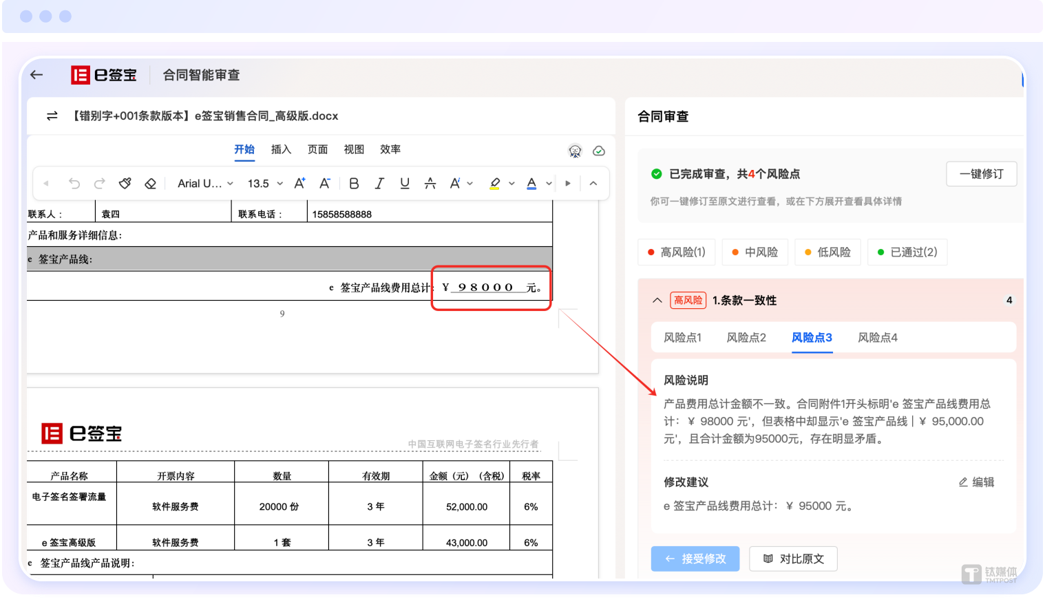 例如,在合同审查任务中,通用大模型如DeepSeek在面对真实业务中的复杂合同版面时,存在明显结构理解缺失,无法正确识别合同事实。而e签宝合同AI通过企业私域知识融合,可以自动对照企业规则进行条款审查,给出符合企业特定要求的建议,彻底规避了通用模型"千篇一律"的决策缺陷,真正将AI转化为企业合规治理的智能伙伴。