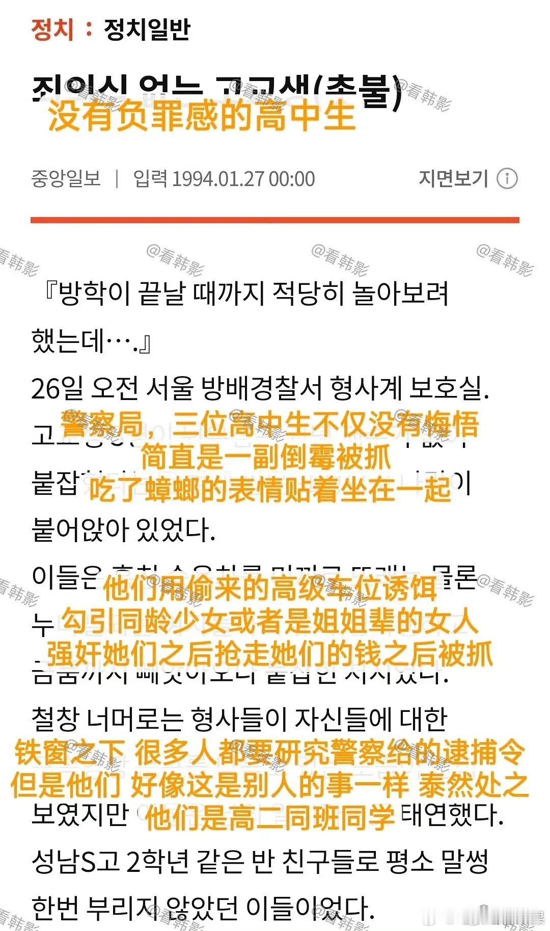 信号2男主角赵震雄94年性/侵女高中生的新闻被韩国人找到了。。。首先偷车,用高级车引诱少女开车去空地,三人轮流进行性暴行性暴行之后还要抢走少女的钱再把偷的车丢了!!!反复四次。。。有一次性暴行之后 发现女方没有钱 直接以女方为人质 去女方家拿钱。。。 没有立场