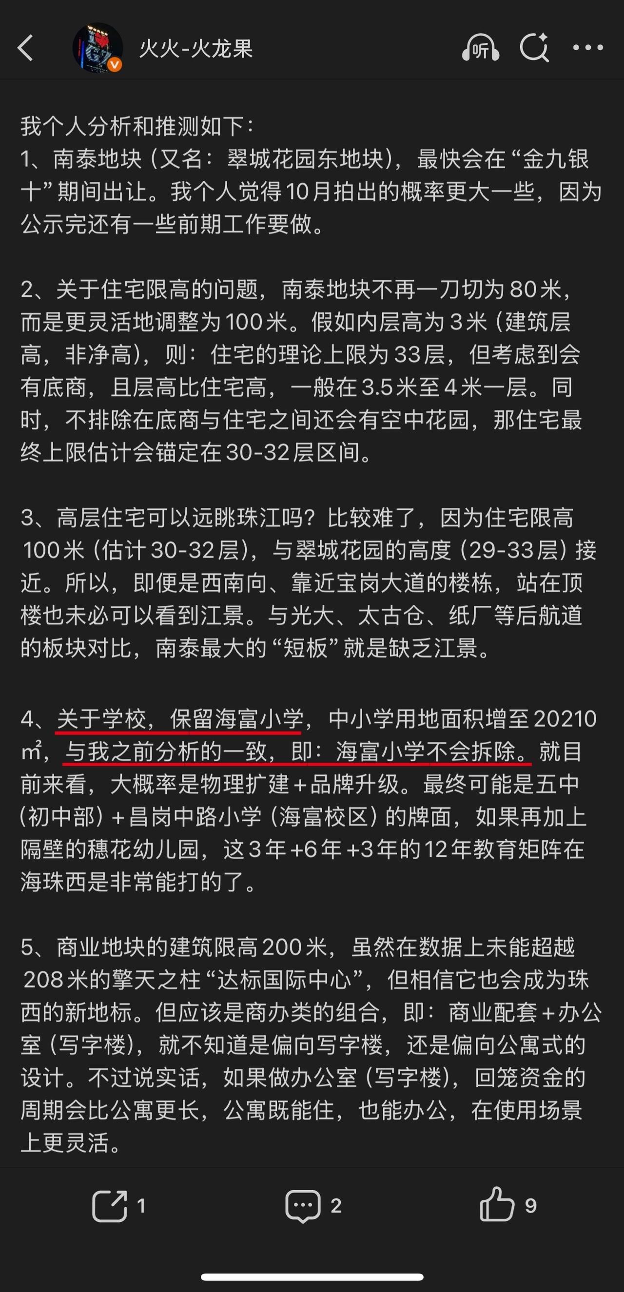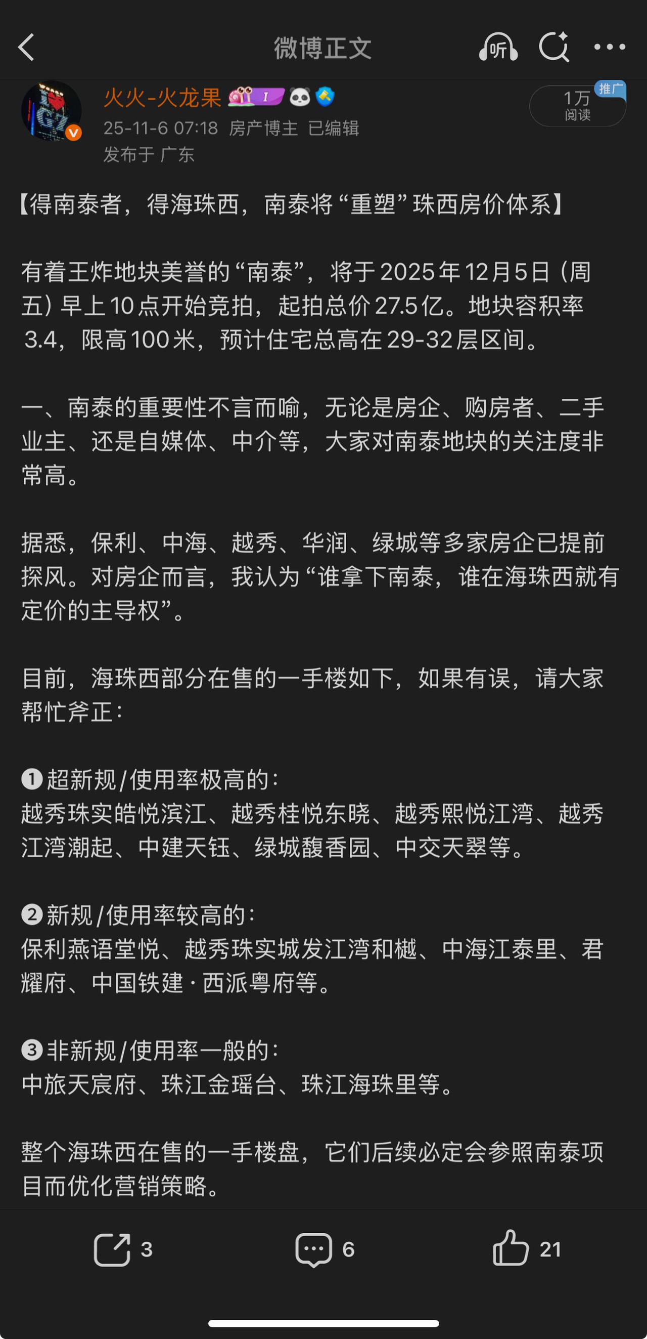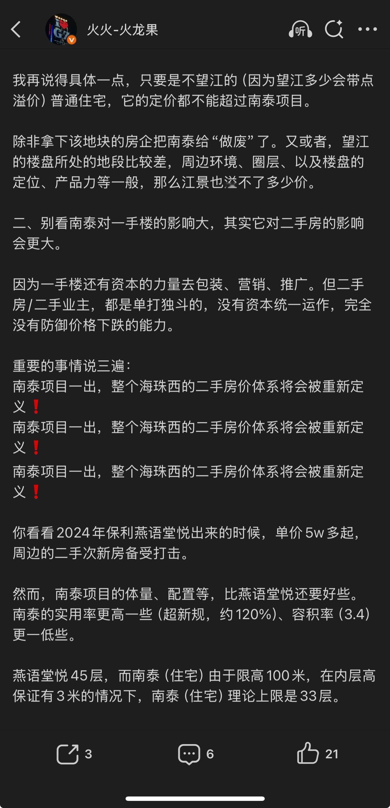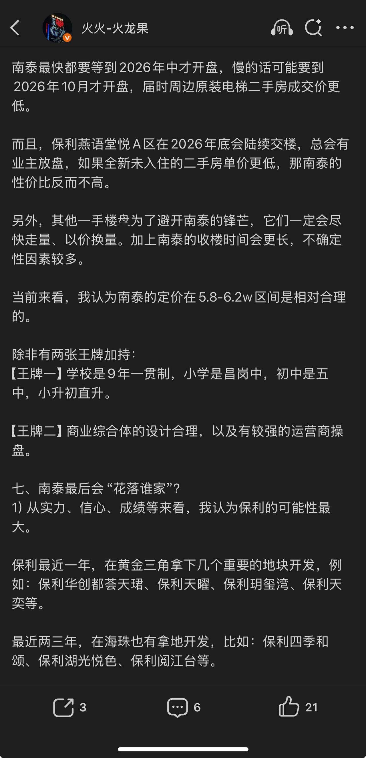 2025年12月5日(周五)保利以35亿元拿下南泰(AH0124032)地块,算上配建,总价约53亿,楼面价约3.68万/㎡。 虽然之前我已经写过很多关于南泰的分析和预测,但今天确定了保利拿下,我再复盘一下、补充一下,以及分析一下接下来对海珠楼市的影响: 一、复盘 ❶保利拿下,应该说是众望所归了。中海、华润、绿城都不可能,只有保利和越秀有实力和有动力去拿。而最有可能就是保利。(图一) ❷我不相信是内定越秀。(图二) ❸保利志在必得,它提前做足功课,把楼盘的定位、风格、效果图等都做了参考素材,并做客户调研。(图三) ❹海富小学纳入昌岗中路小学集团,而且不会拆除,还会扩建(图四、图五、图六)。 虽然目前未知海富小学会扩建,并且新建初中(五中),但我始终认为,等到2028-2029年,上初中的需求比上小学的需求更大,所以,新增中学学位更为重要。 二、补充 ❶南泰楼面价约3.68万/㎡,比绿城馥香园高,比保利燕语堂悦低。 2024年12月5日,绿城以24.16亿拿下海珠客运站,总占地面积4.17万/㎡,未扣除配建,楼面价约3.38万/㎡ 2023年9月5日,保利以20.3亿元拿下东方红印刷厂,总占地面积4.79万/㎡,扣除配建,楼面价约4.1万/㎡ ❷开盘价多少? 绿城馥香园,2025年4月19日开盘,实用率约120%,单价集中在5.2-5.8w。容积率3.86,5栋32层住宅。 保利燕语堂悦,2024年4月29日开盘,实用率约100%,单价集中在5.5-6.2w。容积率4.5,5栋45层住宅。 南泰虽然也是超新规,地段位置也很好,容积率更低,但是收楼迟,最快起码要到2028年底才收楼。而且,新规收窄了,偷面积更难,实用率未必有120% 另外,海珠在售的一手较多,如:皓悦滨江、桂悦东晓、熙悦江湾、江湾潮起、中建天钰、绿城馥香园、中交天翠、燕语堂悦、江湾和樾等,有不少已经大搞促销了。 加上周边二手房(翠城花园、光大花园、泛纸厂板块等)挂牌量持续增加,房价持续下降。所以,一旦南泰高开,就会失去性价比。 按照保利的定价策略,我猜测南泰首开最低是5.5w起,如果以80㎡计算,则总价约440w起。 三、对海珠楼市的影响 其实之前我写过很多(图7至图13),不过既然确定了是保利开发,那可以预见,整个海珠西将会受到影响。 尤其是建面在100-120㎡区间的三房,它们受到的冲击最快、最大。 预计在2029年前,海珠西挂牌量会持续📈,成交价持续📉。