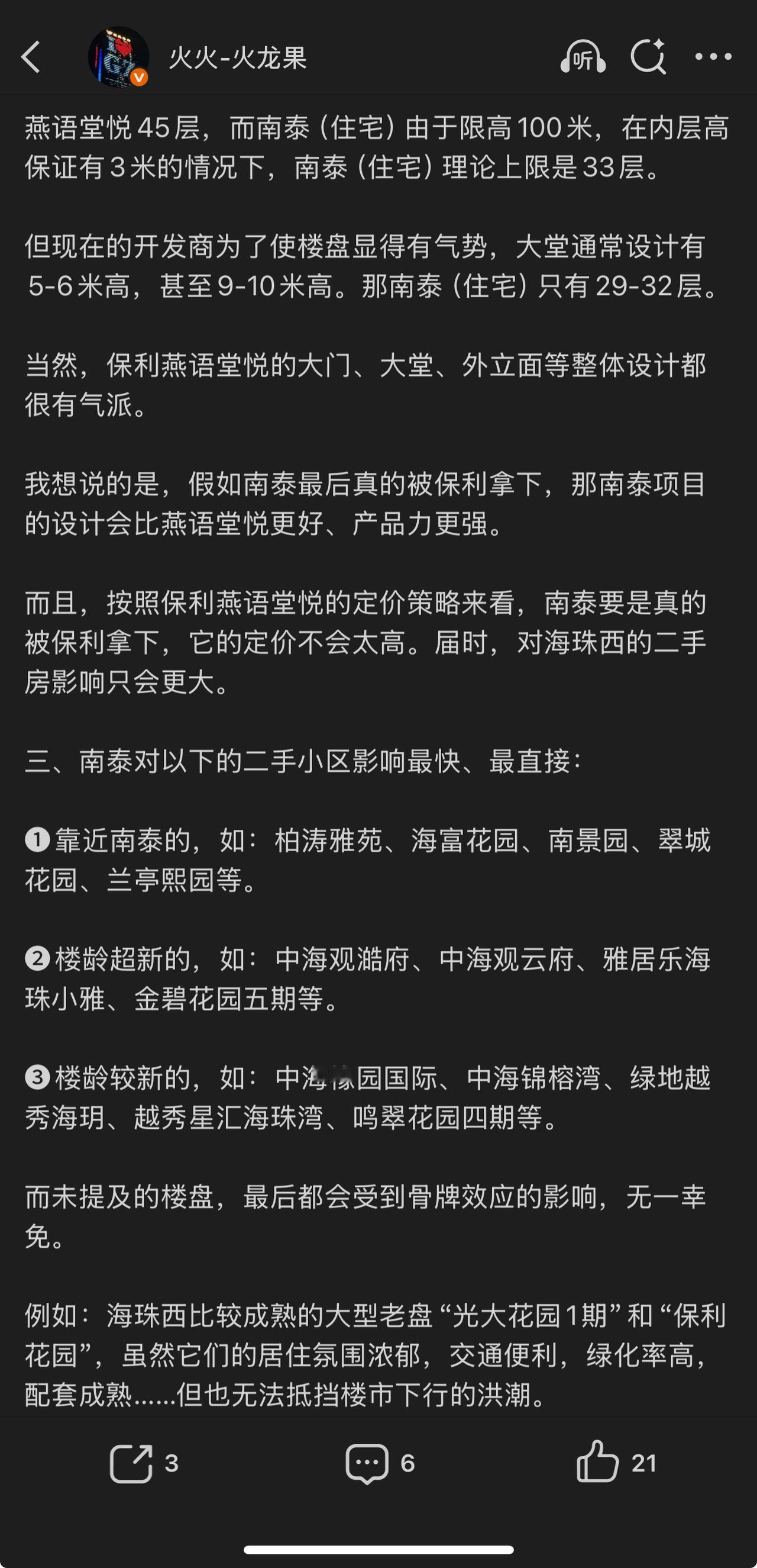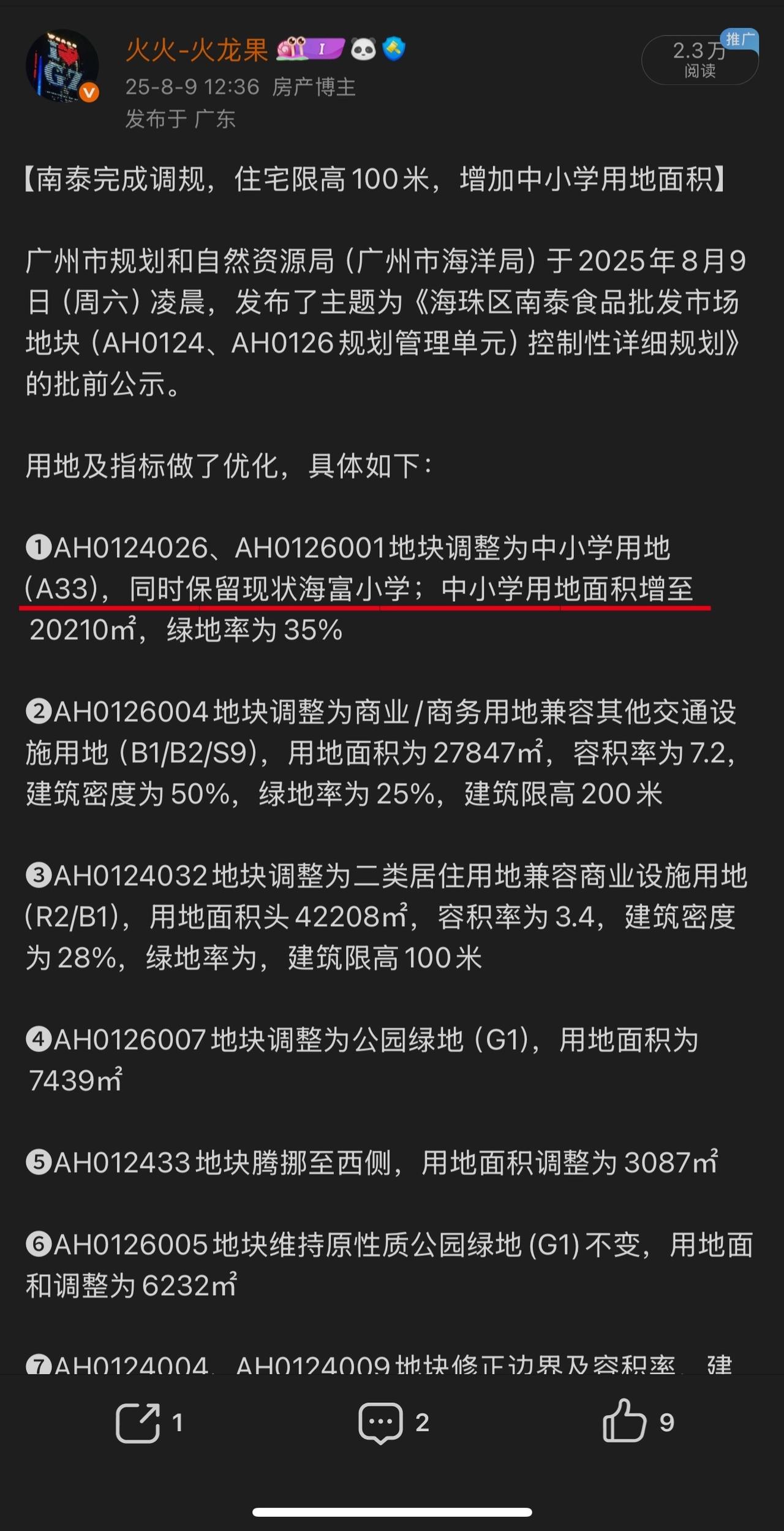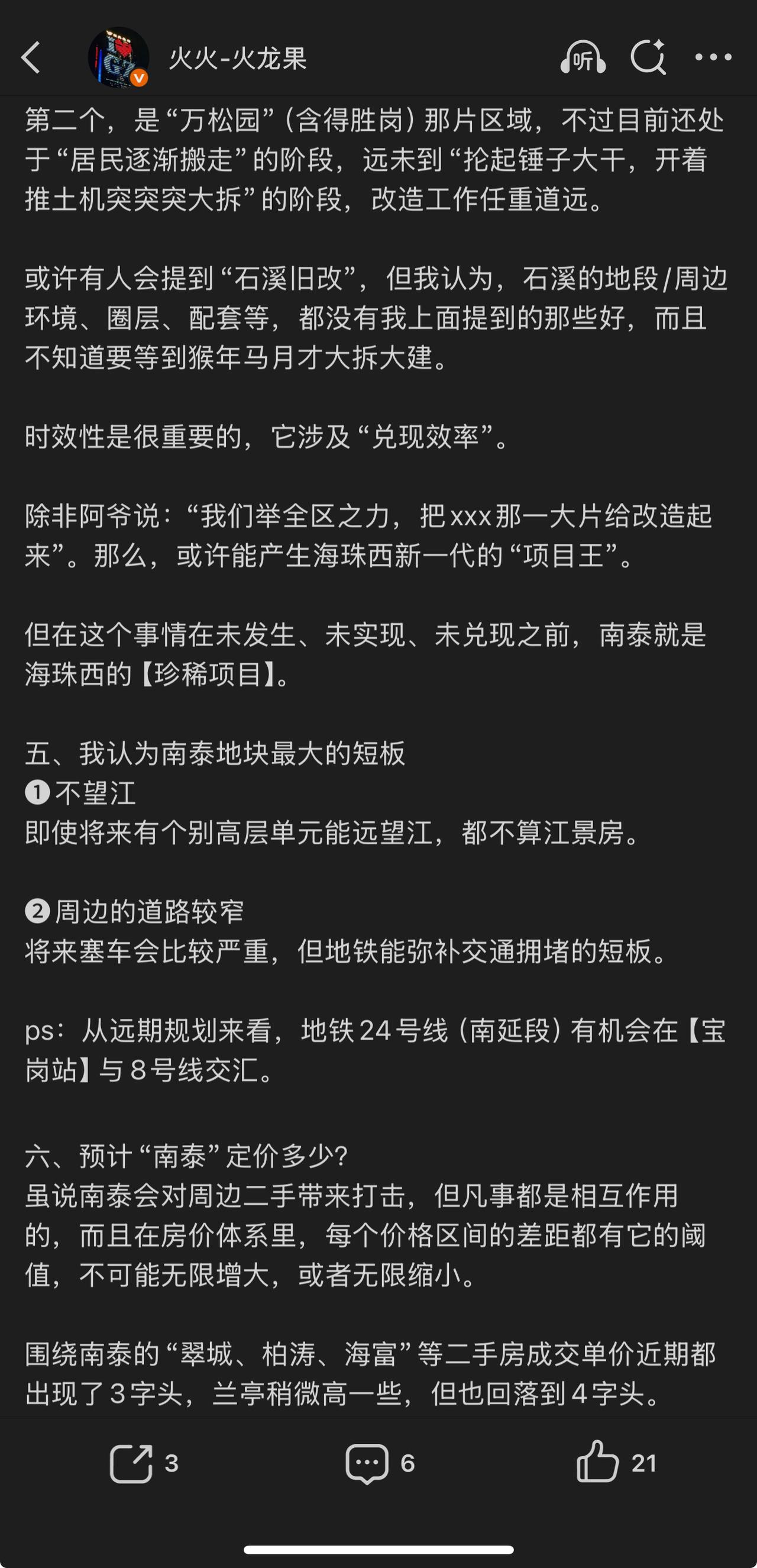 2025年12月5日(周五)保利以35亿元拿下南泰(AH0124032)地块,算上配建,总价约53亿,楼面价约3.68万/㎡。 虽然之前我已经写过很多关于南泰的分析和预测,但今天确定了保利拿下,我再复盘一下、补充一下,以及分析一下接下来对海珠楼市的影响: 一、复盘 ❶保利拿下,应该说是众望所归了。中海、华润、绿城都不可能,只有保利和越秀有实力和有动力去拿。而最有可能就是保利。(图一) ❷我不相信是内定越秀。(图二) ❸保利志在必得,它提前做足功课,把楼盘的定位、风格、效果图等都做了参考素材,并做客户调研。(图三) ❹海富小学纳入昌岗中路小学集团,而且不会拆除,还会扩建(图四、图五、图六)。 虽然目前未知海富小学会扩建,并且新建初中(五中),但我始终认为,等到2028-2029年,上初中的需求比上小学的需求更大,所以,新增中学学位更为重要。 二、补充 ❶南泰楼面价约3.68万/㎡,比绿城馥香园高,比保利燕语堂悦低。 2024年12月5日,绿城以24.16亿拿下海珠客运站,总占地面积4.17万/㎡,未扣除配建,楼面价约3.38万/㎡ 2023年9月5日,保利以20.3亿元拿下东方红印刷厂,总占地面积4.79万/㎡,扣除配建,楼面价约4.1万/㎡ ❷开盘价多少? 绿城馥香园,2025年4月19日开盘,实用率约120%,单价集中在5.2-5.8w。容积率3.86,5栋32层住宅。 保利燕语堂悦,2024年4月29日开盘,实用率约100%,单价集中在5.5-6.2w。容积率4.5,5栋45层住宅。 南泰虽然也是超新规,地段位置也很好,容积率更低,但是收楼迟,最快起码要到2028年底才收楼。而且,新规收窄了,偷面积更难,实用率未必有120% 另外,海珠在售的一手较多,如:皓悦滨江、桂悦东晓、熙悦江湾、江湾潮起、中建天钰、绿城馥香园、中交天翠、燕语堂悦、江湾和樾等,有不少已经大搞促销了。 加上周边二手房(翠城花园、光大花园、泛纸厂板块等)挂牌量持续增加,房价持续下降。所以,一旦南泰高开,就会失去性价比。 按照保利的定价策略,我猜测南泰首开最低是5.5w起,如果以80㎡计算,则总价约440w起。 三、对海珠楼市的影响 其实之前我写过很多(图7至图13),不过既然确定了是保利开发,那可以预见,整个海珠西将会受到影响。 尤其是建面在100-120㎡区间的三房,它们受到的冲击最快、最大。 预计在2029年前,海珠西挂牌量会持续📈,成交价持续📉。