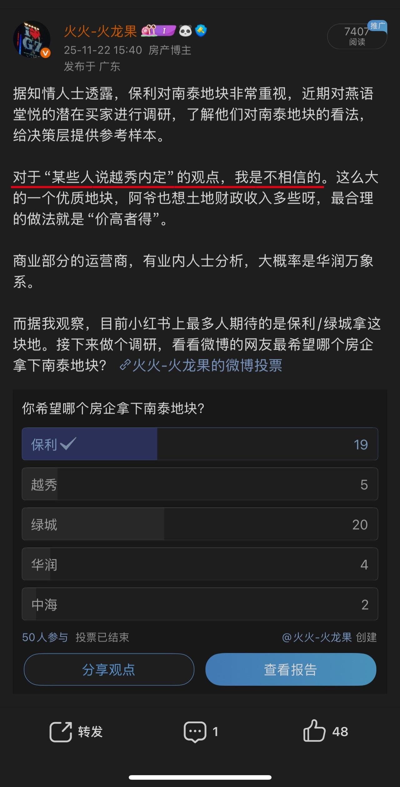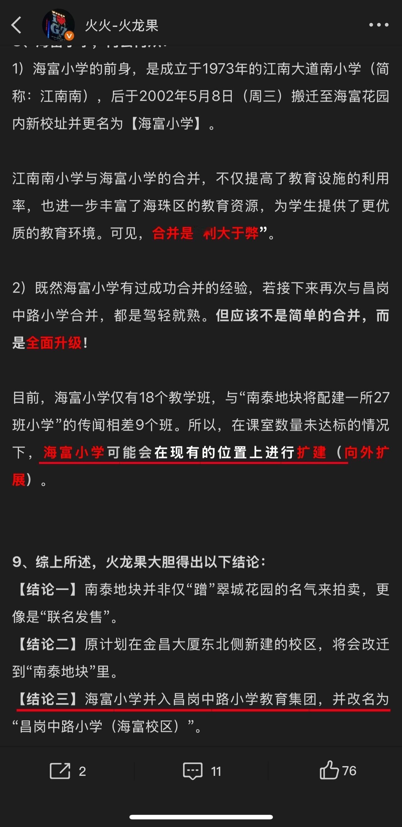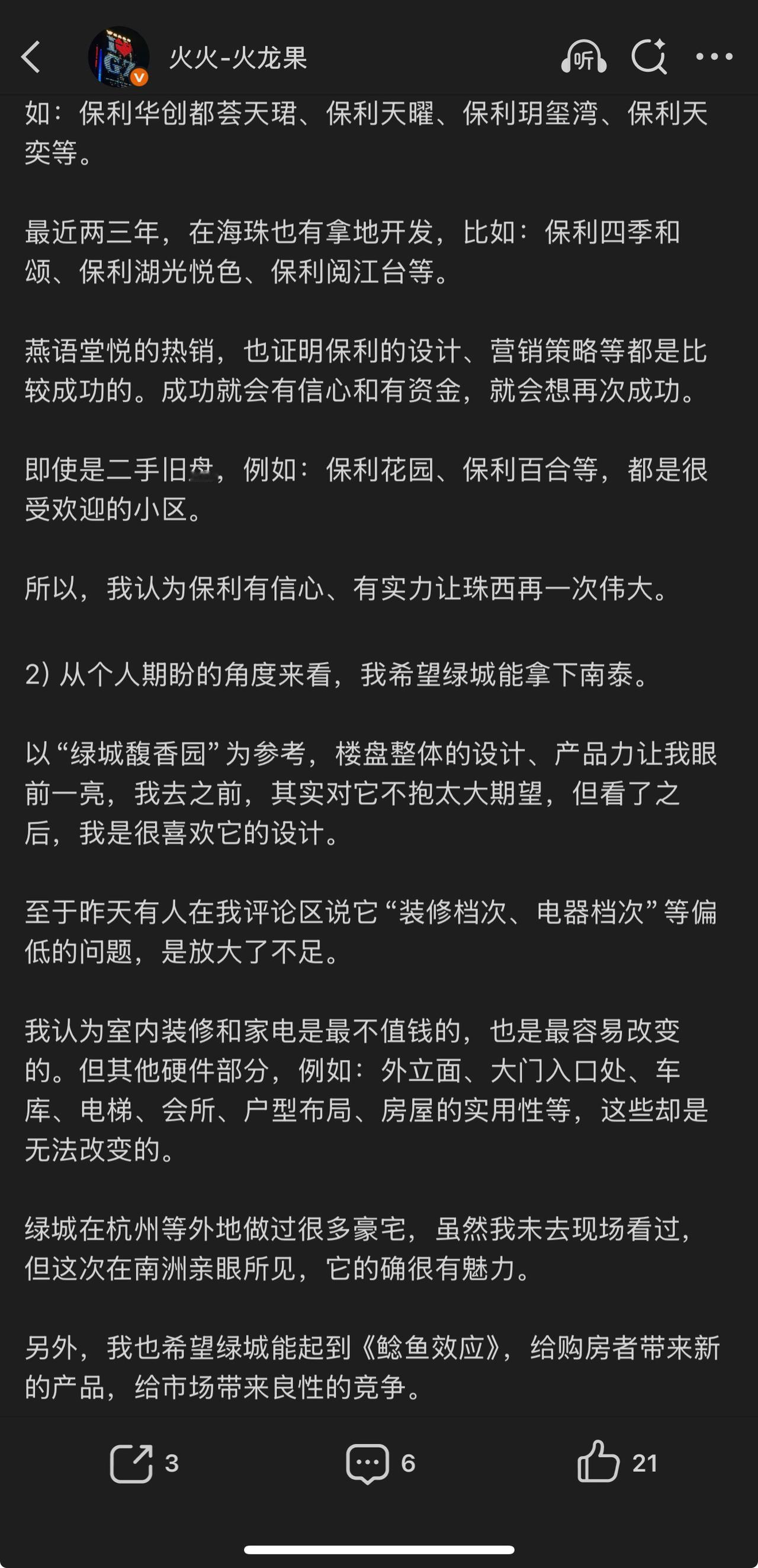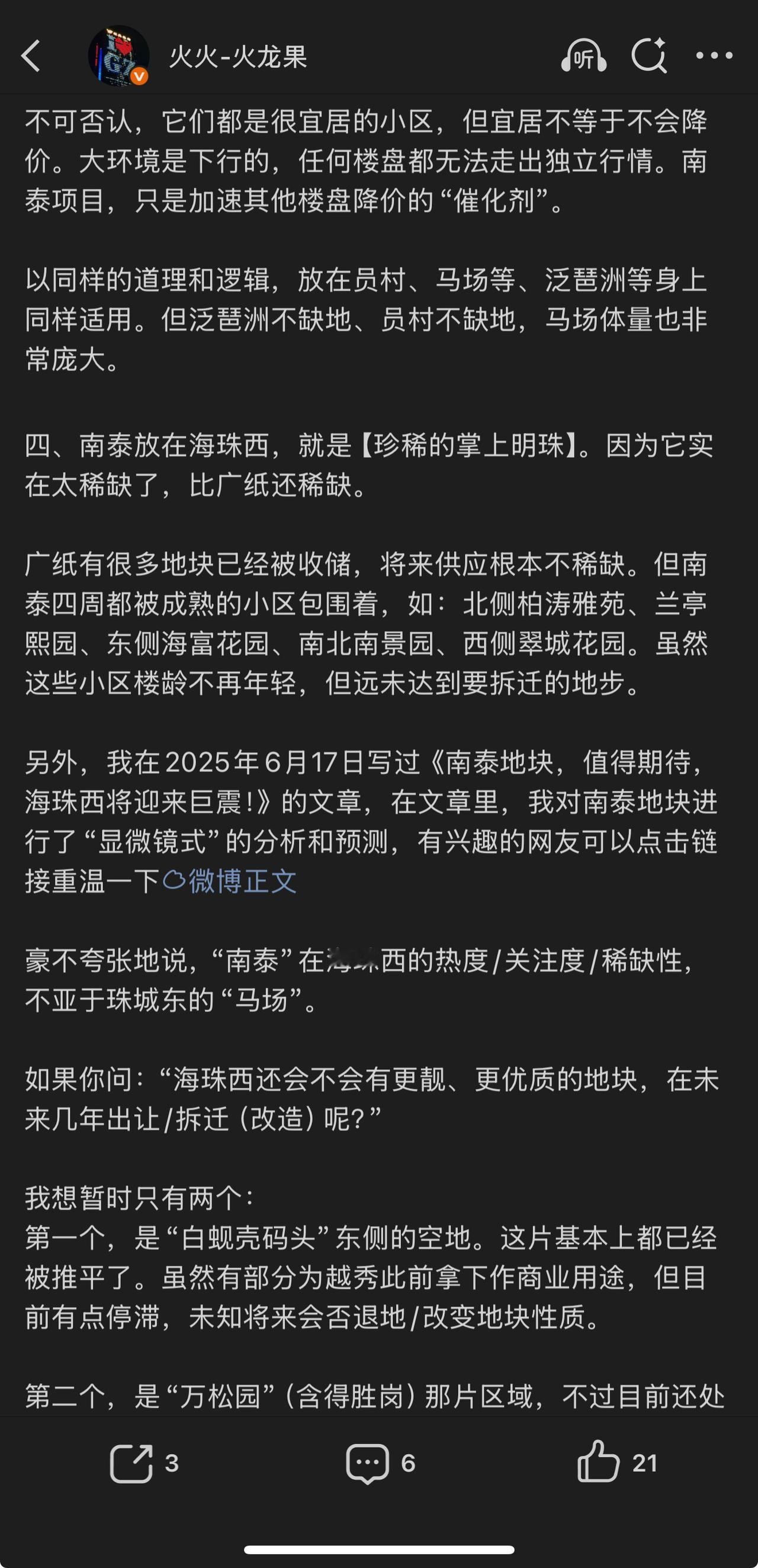2025年12月5日(周五)保利以35亿元拿下南泰(AH0124032)地块,算上配建,总价约53亿,楼面价约3.68万/㎡。 虽然之前我已经写过很多关于南泰的分析和预测,但今天确定了保利拿下,我再复盘一下、补充一下,以及分析一下接下来对海珠楼市的影响: 一、复盘 ❶保利拿下,应该说是众望所归了。中海、华润、绿城都不可能,只有保利和越秀有实力和有动力去拿。而最有可能就是保利。(图一) ❷我不相信是内定越秀。(图二) ❸保利志在必得,它提前做足功课,把楼盘的定位、风格、效果图等都做了参考素材,并做客户调研。(图三) ❹海富小学纳入昌岗中路小学集团,而且不会拆除,还会扩建(图四、图五、图六)。 虽然目前未知海富小学会扩建,并且新建初中(五中),但我始终认为,等到2028-2029年,上初中的需求比上小学的需求更大,所以,新增中学学位更为重要。 二、补充 ❶南泰楼面价约3.68万/㎡,比绿城馥香园高,比保利燕语堂悦低。 2024年12月5日,绿城以24.16亿拿下海珠客运站,总占地面积4.17万/㎡,未扣除配建,楼面价约3.38万/㎡ 2023年9月5日,保利以20.3亿元拿下东方红印刷厂,总占地面积4.79万/㎡,扣除配建,楼面价约4.1万/㎡ ❷开盘价多少? 绿城馥香园,2025年4月19日开盘,实用率约120%,单价集中在5.2-5.8w。容积率3.86,5栋32层住宅。 保利燕语堂悦,2024年4月29日开盘,实用率约100%,单价集中在5.5-6.2w。容积率4.5,5栋45层住宅。 南泰虽然也是超新规,地段位置也很好,容积率更低,但是收楼迟,最快起码要到2028年底才收楼。而且,新规收窄了,偷面积更难,实用率未必有120% 另外,海珠在售的一手较多,如:皓悦滨江、桂悦东晓、熙悦江湾、江湾潮起、中建天钰、绿城馥香园、中交天翠、燕语堂悦、江湾和樾等,有不少已经大搞促销了。 加上周边二手房(翠城花园、光大花园、泛纸厂板块等)挂牌量持续增加,房价持续下降。所以,一旦南泰高开,就会失去性价比。 按照保利的定价策略,我猜测南泰首开最低是5.5w起,如果以80㎡计算,则总价约440w起。 三、对海珠楼市的影响 其实之前我写过很多(图7至图13),不过既然确定了是保利开发,那可以预见,整个海珠西将会受到影响。 尤其是建面在100-120㎡区间的三房,它们受到的冲击最快、最大。 预计在2029年前,海珠西挂牌量会持续📈,成交价持续📉。