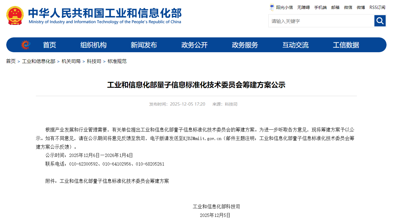 上证报中国证券网讯工业和信息化部科技司12月5日公示工业和信息化部量子信息标准化技术委员会筹建方案。