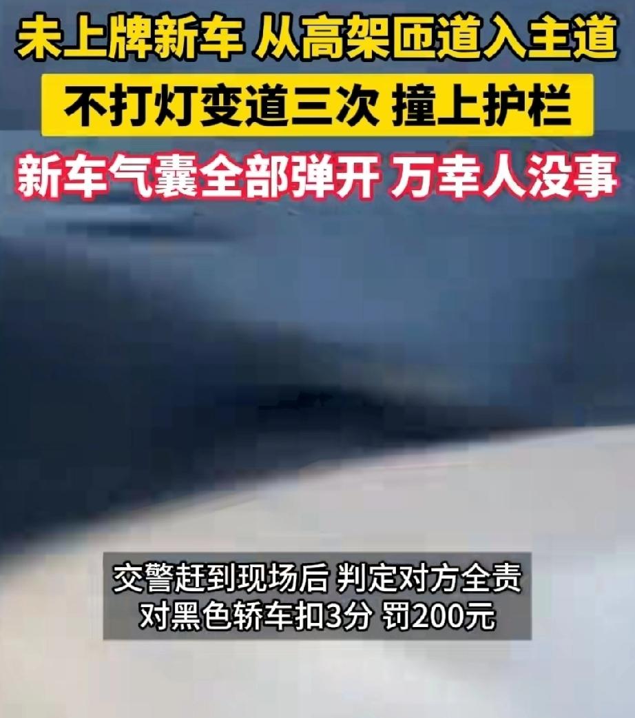 12月4日,安徽一车主从4S店提了一辆新车去上牌,从高架进入辅路后,准备变道并入主道。由于车主没有打开灯示意,主道上的另一辆车没注意到他的意思,没有让他。 新车车主生气了,他一加速,第二次变道,超过另辆车,然后急刹车试图别车,被另辆车避开了。新车车主更生气了,第三次变道。这次把自己玩进去了,汽车撞到了护栏,气囊全部打开了,所幸人没事。不过新车立马变成了事故车。 新车三次变道都没打灯示意,交警判定新车车主负全责,扣3分,罚200元。 新车车主也太豪横了,变道不打灯,好像路是自己的。自己犯错在先,还和别人斗气,这下惨了吧。好在人没事,下次可得注意啦,为自己也为别人着想,一定要遵守交通规则。 未上牌新车从高架匝道入主道交通事故