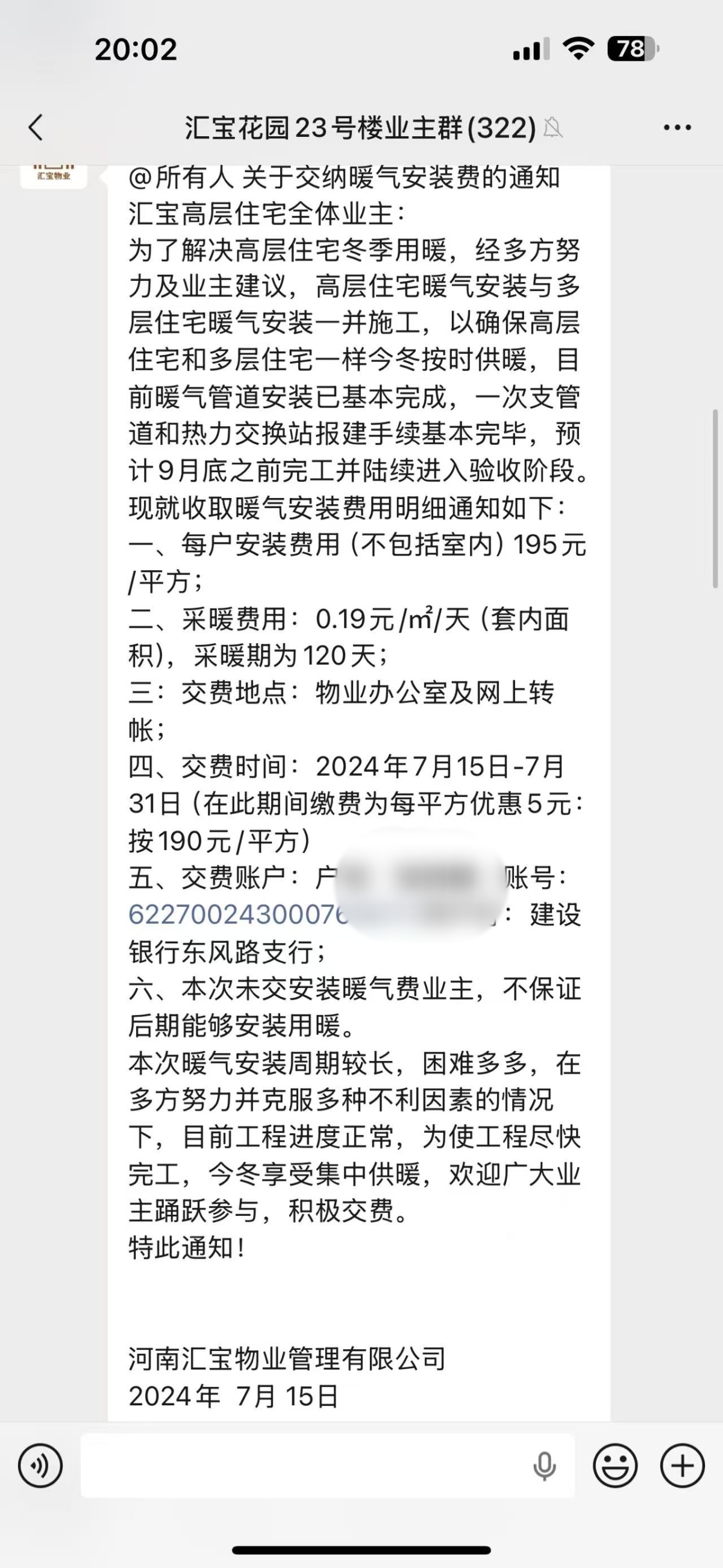 汇宝花园业主群聊天记录显示,去年7月15日,河南汇宝物业管理有限公司关于缴纳暖气安装费的通知,“为解决高层住宅冬季用暖,经多方努力及业主建议,高层住宅暖气安装与多层住宅暖气安装一并施工。目前暖气管道安装已基本完成,一次支管道和热力交换站报建手续基本完毕。每户安装费用(不包括室内)195/平方。本次未缴纳暖气安装费业主,不保证后期能够安装用暖。”