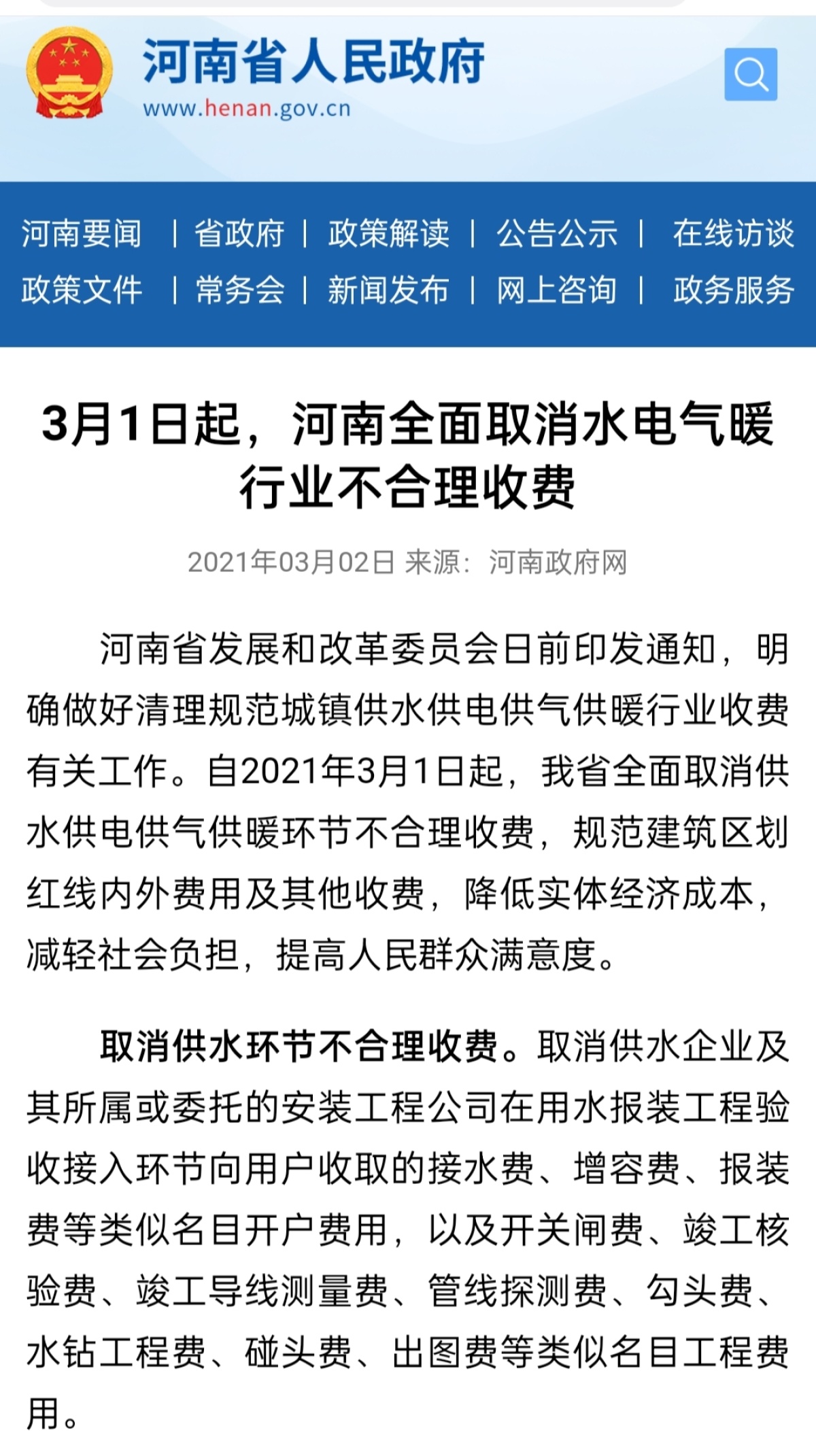 2021年,河南省发改委也发布了《取消供水供电供气供暖环节不合理收费的通知》,取消接水费、增容费、移表费等不合理收费,并规定,新建商品房、保障性住房等供水供电供气供暖管网及配套设备设施的建设安装费用统一纳入房屋开发建设成本,不得另外向买受人收取。