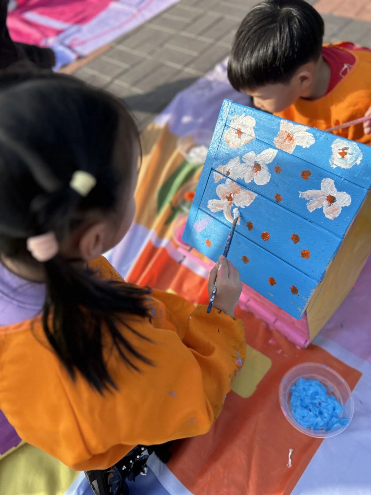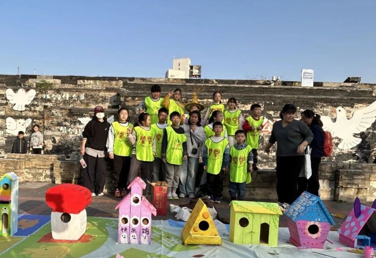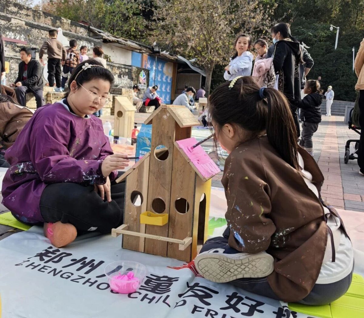 在创意落地现场,孩子们化身“小小粉刷匠”,在紫荆山公园的阳光下尽情挥洒灵感。手中的颜料与画笔仿佛拥有魔力,嫩绿的叶子、盛放的花朵、斑斓的色块在木板上渐渐晕开,一个个原本朴素的鸟屋,在孩子们的巧手下蜕变为独一无二的艺术品。这些承载着童心的鸟屋被集体安装在公园的鸽子主题墙上,不仅为鸽子等各类小鸟搭建了温暖的家,更将孩子们对自然的敬畏、对生命的热爱,实实在在地植入了郑州的城市生态肌理之中。
