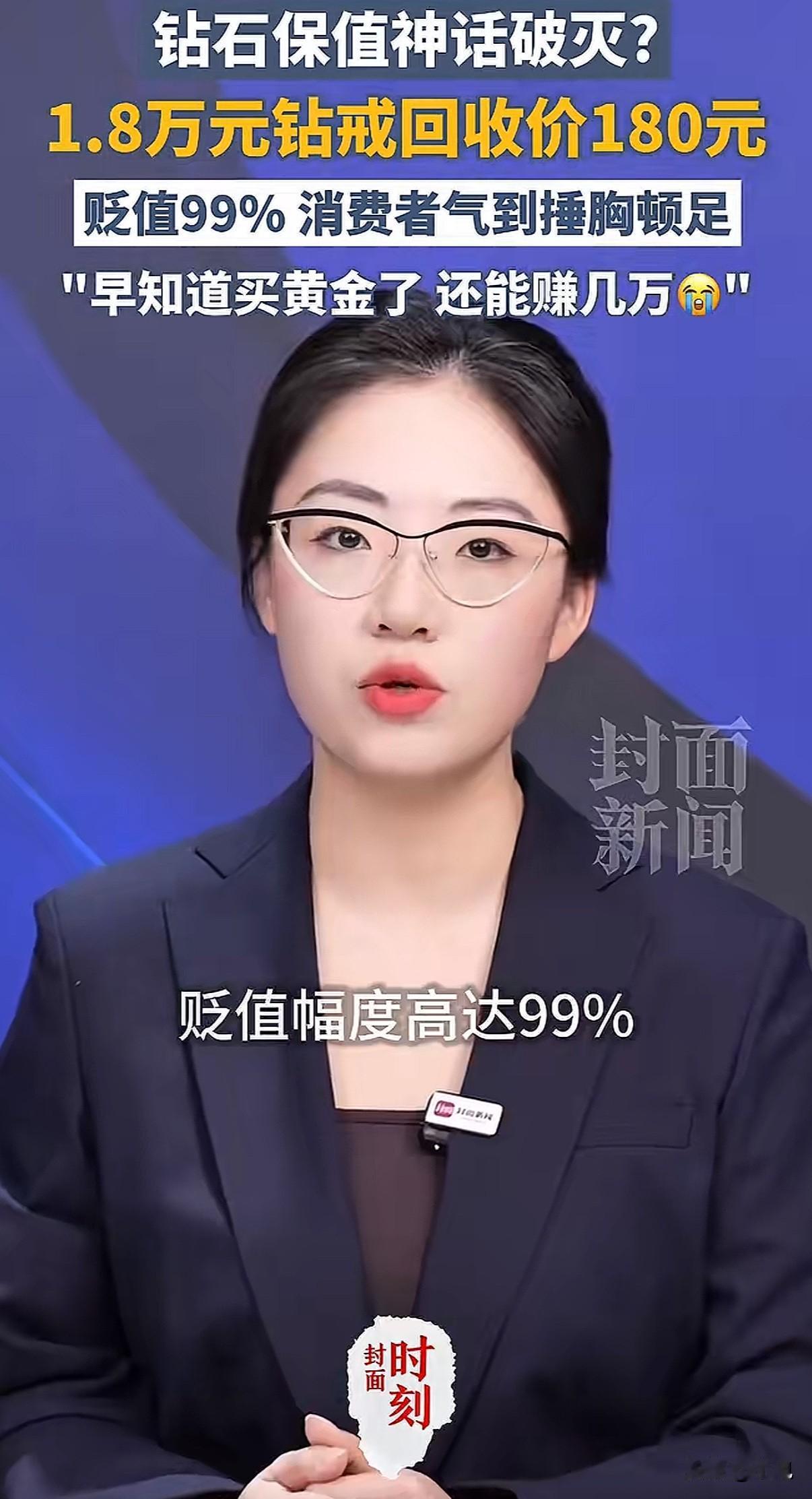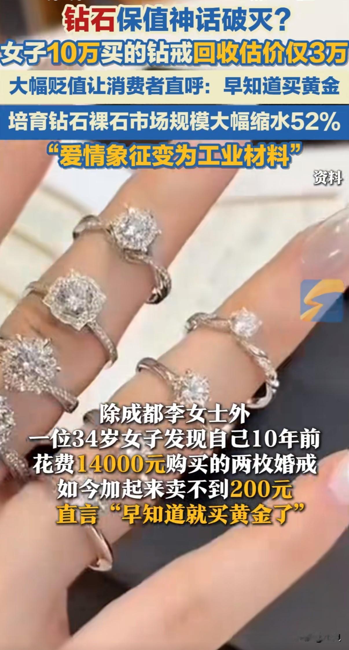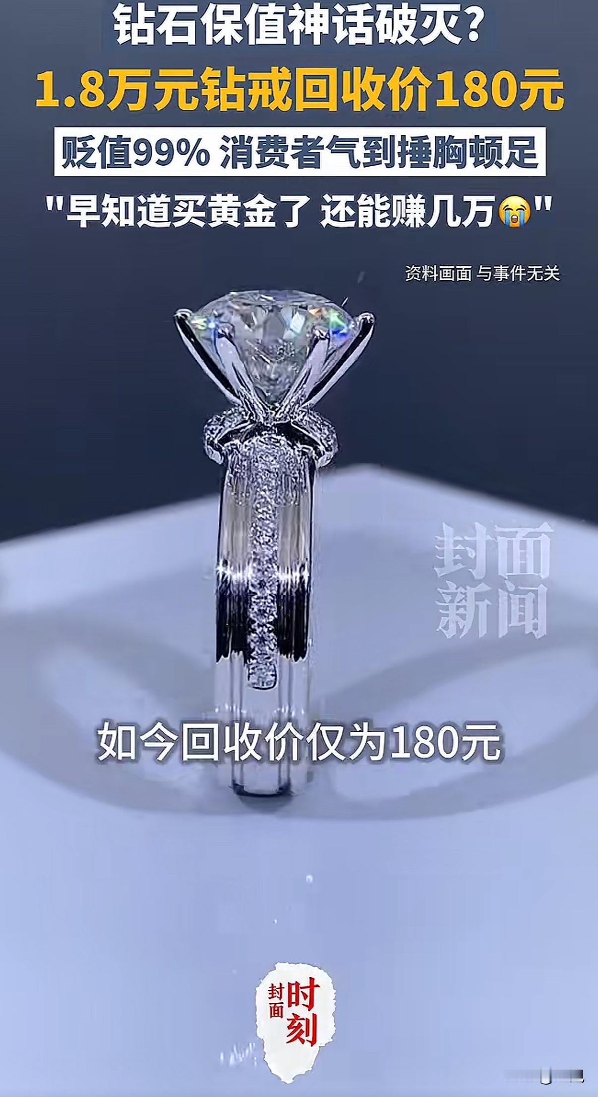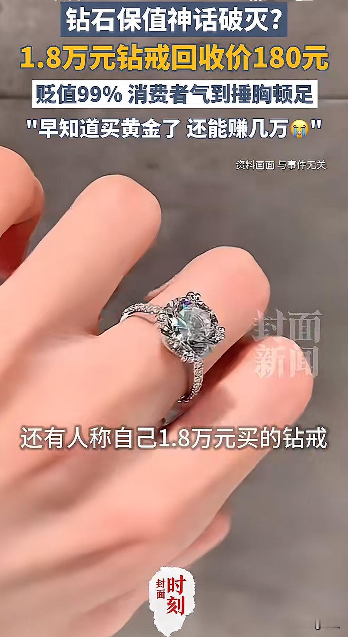 钻石1.8万买的,回收只给180?这价跌得我人都懵了。 就刚才刷到的新闻。一位安徽女士,十年前花一万八买的钻戒,现在拿去回收,人家开价180块。你没看错,不是一万八,是一百八。 她当时都愣了,反复确认。对方说,戒托算100,钻石本身80。 为啥这么低?我仔细看了分析。这种报价,通常意味着三件事:钻石没GIA这种国际证书,颜色可能发黄,品质很低,加上戒托也不是什么好金。说白了,在回收商眼里,这钻石几乎等于“石头”,值钱的就是那点金属。 但就算戒托是普通的18K金,按现在的金价,3克左右也能值一千多。给180,明摆着是当废料收了。 这不是个例。成都还有位李女士,十年前的十万元一克拉钻戒,现在问了一圈,最高估价也就三万。 很多人后悔了,留言都说:“早知道,真不如买黄金。” 这话很实在。咱们算笔账:2012年黄金大概338一克,一万八能买50多克。放到今天,按每克500多算,能卖两万七八。这一对比,一个天上一个地下。 钻石为啥这么不保值? 首先是品牌溢价太高。你在商场专柜买的,价格里一大半是广告、门店和品牌的钱。比如某品牌,一枚12万的钻戒,回收可能就2万8,品牌价值在出手那一刻就蒸发了。 其次,钻石有个“克拉门槛”。一克拉以下的,经常被叫做“碎钻”,回收市场根本不认,值不了几个钱。只有一克拉以上,而且颜色、净度都很高的,才有点谈价格的资格。 另外,钻石和黄金本质不同。黄金是公认的硬通货,有国际牌价,到哪里都认。钻石的价值,很大程度上是人为营销出来的“情感符号”,象征爱情。但这层情感滤镜,在回收市场里完全失效。回收商只看证书、看品质,冷冰冰的。 当然,不是说所有钻石都这样。那些3克拉以上、颜色净度顶级的,或许还能保留些价值。但对绝大多数普通人买的婚戒、纪念戒来说,它就是件消费品,像买了件很贵的衣服,出门就贬值。 这件事挺让人感慨的。它击碎了很多人的幻想。我们曾经那么相信“钻石恒久远,一颗永流传”,以为它既能代表永恒,又能守护财富。 现在发现,传的是情感,不是价格。想着保值增值去买钻石,恐怕真不如买黄金来得踏实。 以后要是再有人为结婚选什么首饰纠结,我可能真会多嘴说一句:如果你看重的是那份心意和纪念,钻石很美;但如果心里还盘算着一点“万一将来…”的想法,那金的,或许更让人安心。 话说回来,你家里有压箱底的钻戒吗?知道现在大概值多少吗?