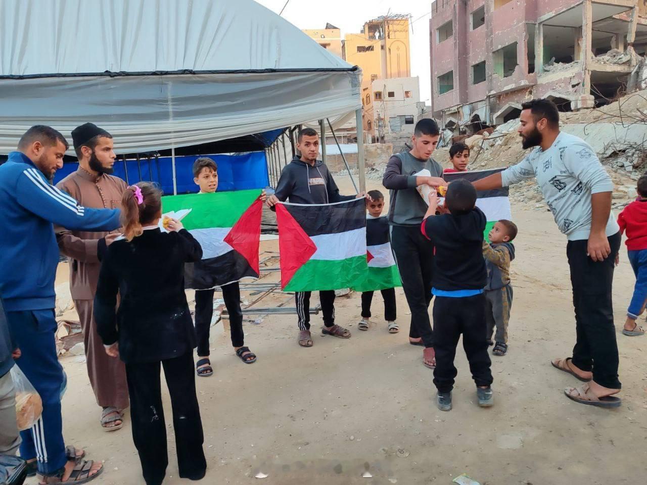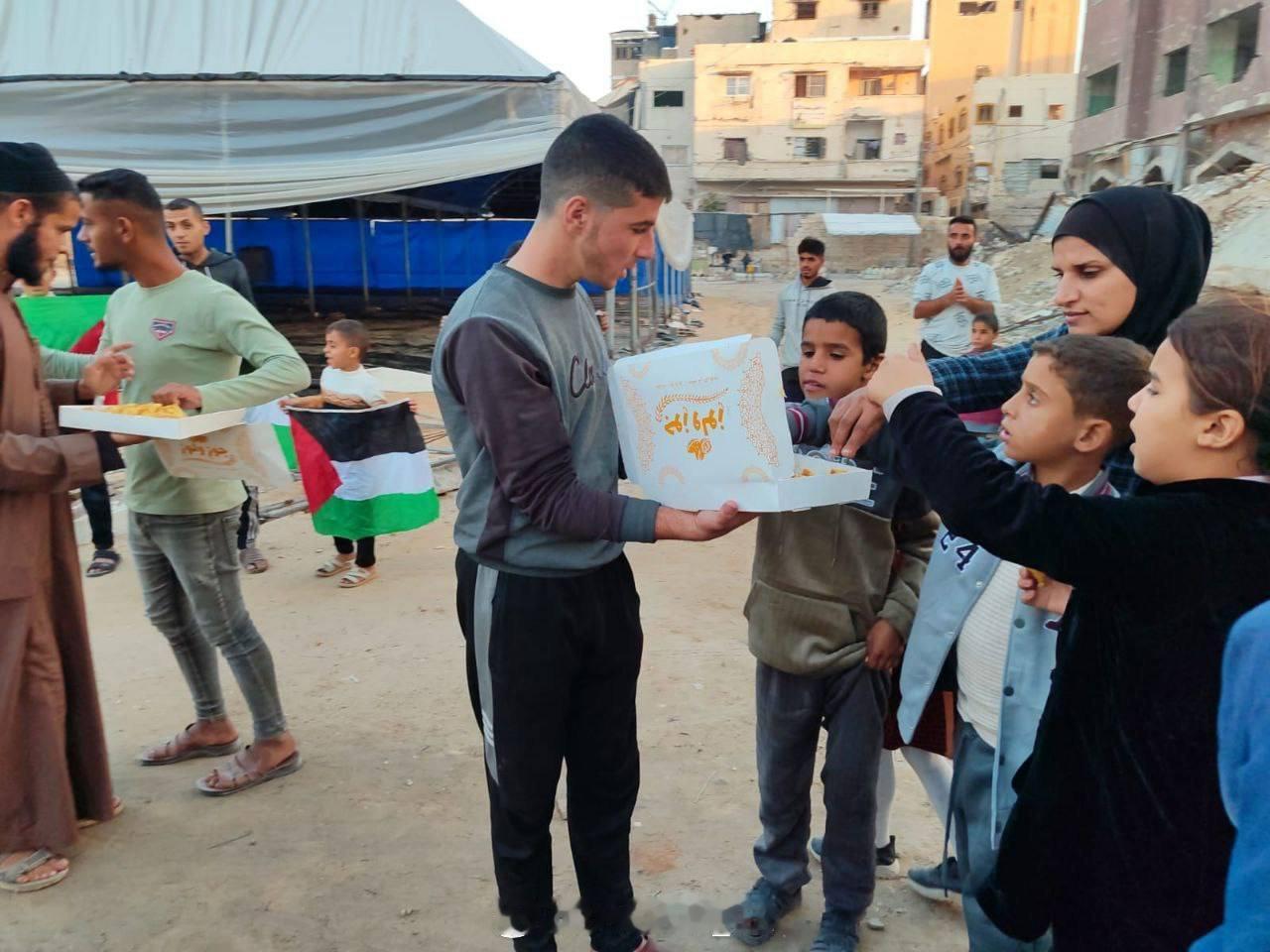 巴勒斯坦人在加沙街头分发甜品和糖果,庆祝二鬼子头目、以色列的走狗亚西尔·阿布·沙