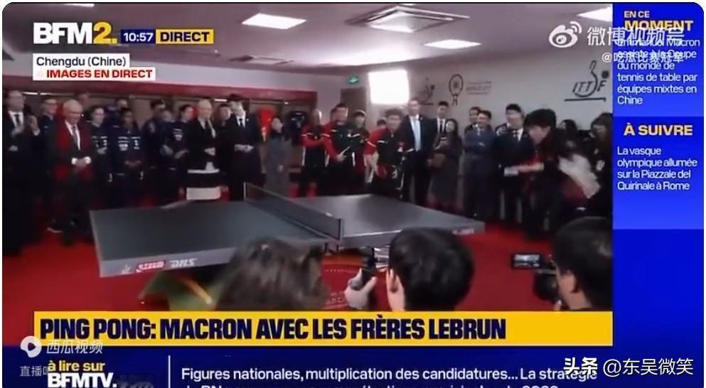 马克龙也玩起了我们的国球 访问成都期间,适逢乒乓球混合团体世界杯在火热进行,这位