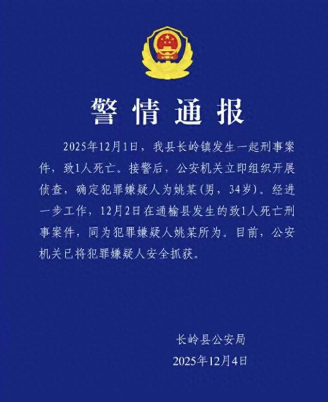 12月4日,吉林松原长岭县公安局通报:2025年12月1日,我县长岭镇发生一起刑事案件,致1人死亡。接警后,公安机关立即组织开展侦查,确定犯罪嫌疑人为姚某(男,34岁)。经进一步工作,12月2日在通榆县发生的致1人死亡刑事案件,同为犯罪嫌疑人姚某所为。目前,公安机关已将犯罪嫌疑人安全抓获。