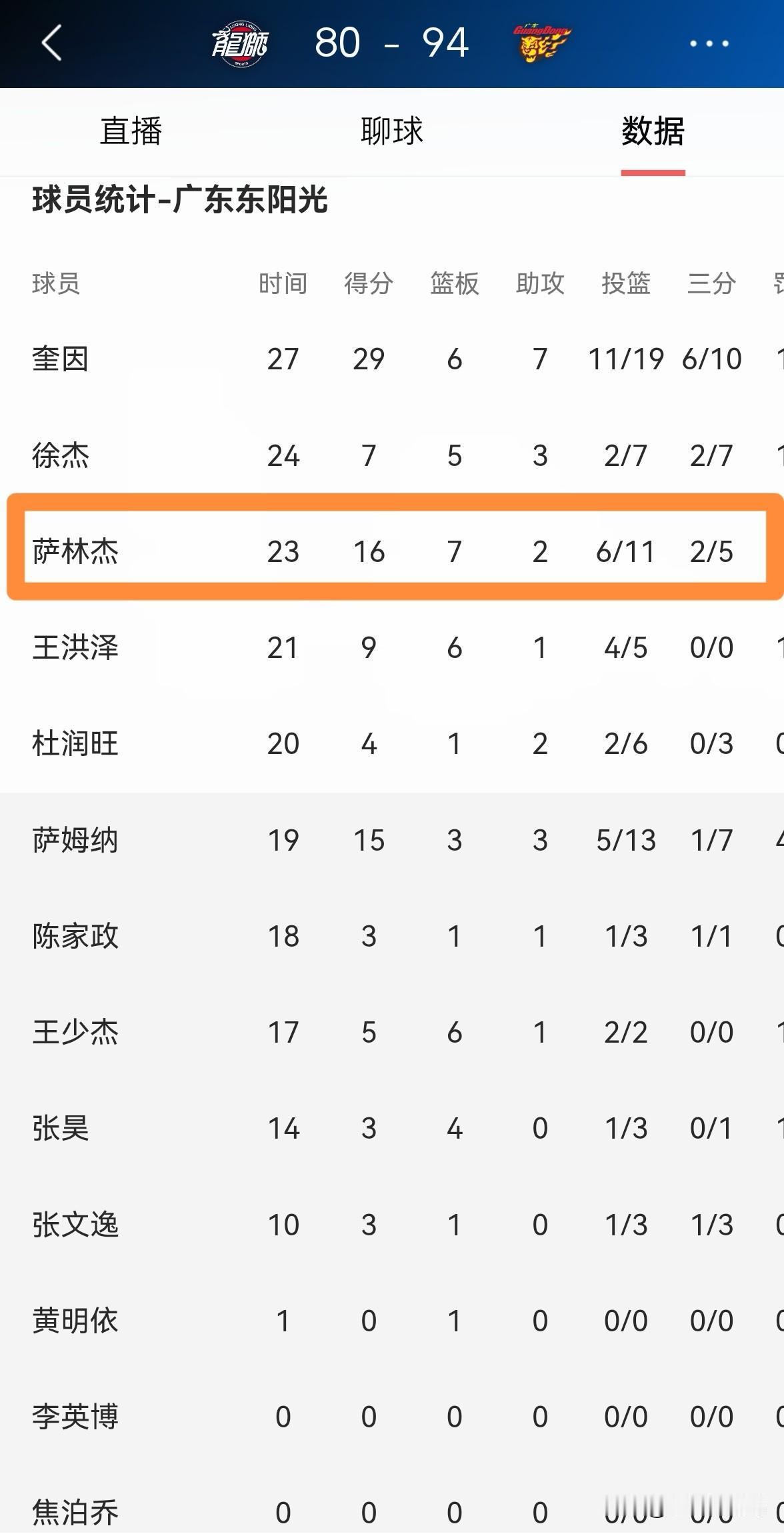 广东东阳光大外援萨林杰真是攻防俱佳!在今天广东东阳光以94:80击败广州朗肽海本的比赛中,萨林杰在攻防两端都打出了无可争议的表现。 整场比赛下来,萨林杰首发出战23分钟,投篮11中6,其中三分球5中2、罚球4中2得到16分7篮板2助攻3抢断,他的场上正负值为+5。 坦白说,广东东阳光能否赢得CBA新赛季的总冠军,萨林杰将会扮演着非常重要的角色。