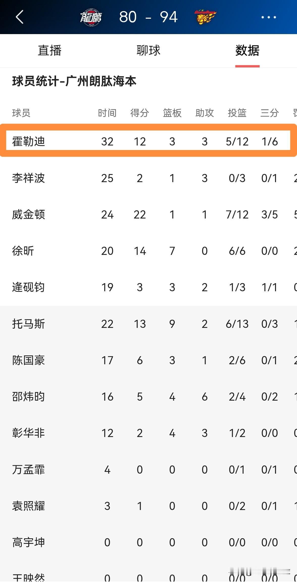 广州朗肽海本超级外援霍勒迪真是太拉胯了!在今天广州朗肽海本以80:94输给广东东阳光的比赛中,霍勒迪在三分线外的表现简直就是一场大灾难。 整场比赛下来,霍勒迪首发出战32分钟,投篮12中5,其中三分球6中1仅仅得到12分,还出现了4次失误,他的场上正负值为-18。