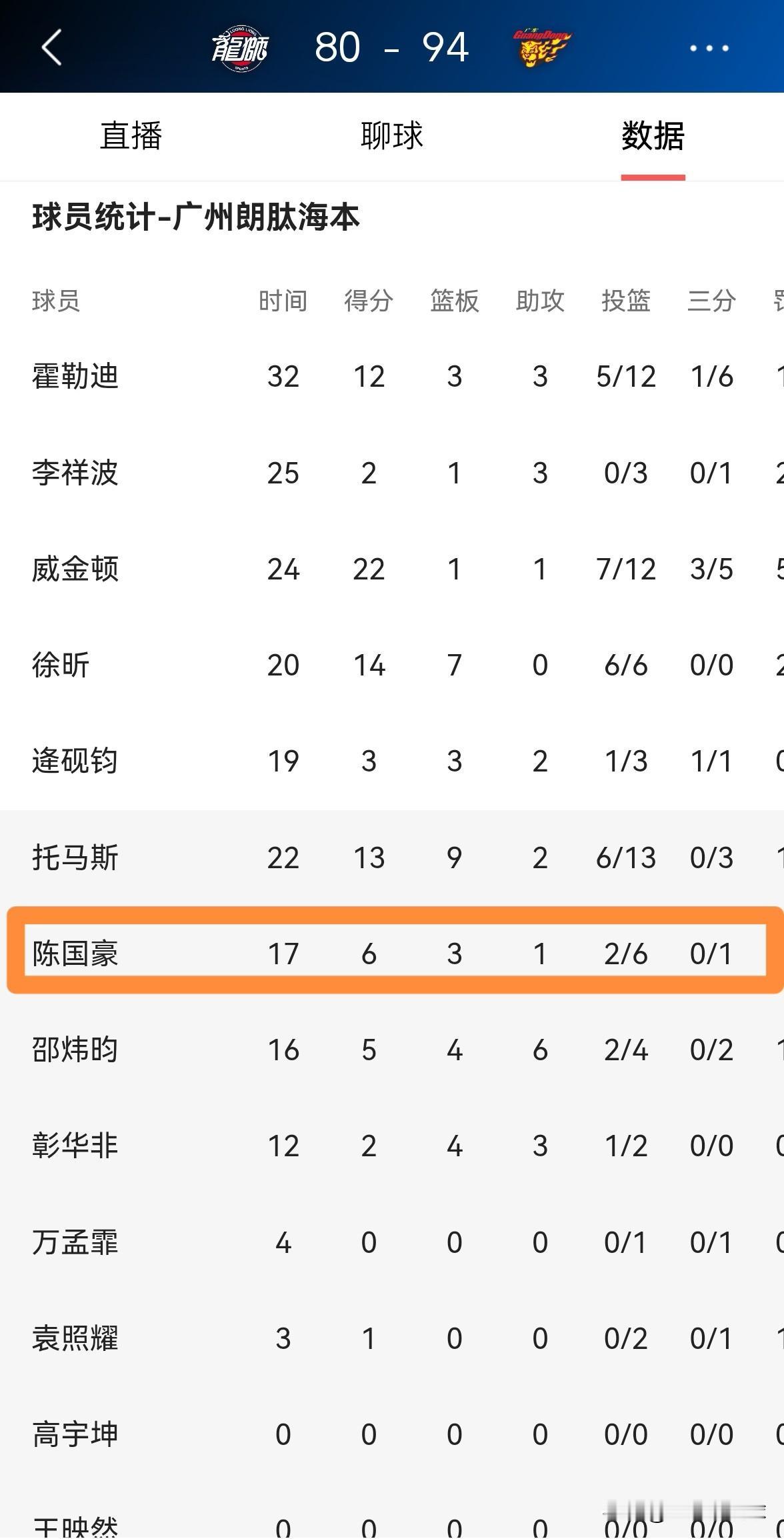 广州朗肽海本大将陈国豪真是难堪大用!在今天广州朗肽海本以80:94不敌广东东阳光的比赛中,陈国豪替补出战17分钟,投篮6中2,其中罚球2中2得到6分3篮板,他在和广东东阳光年轻中锋王少杰的对位中没有占到任何便宜。 毫不夸张的说,如果陈国豪无法在本赛季提升自己的投篮表现,那么他很难在CBA立足。