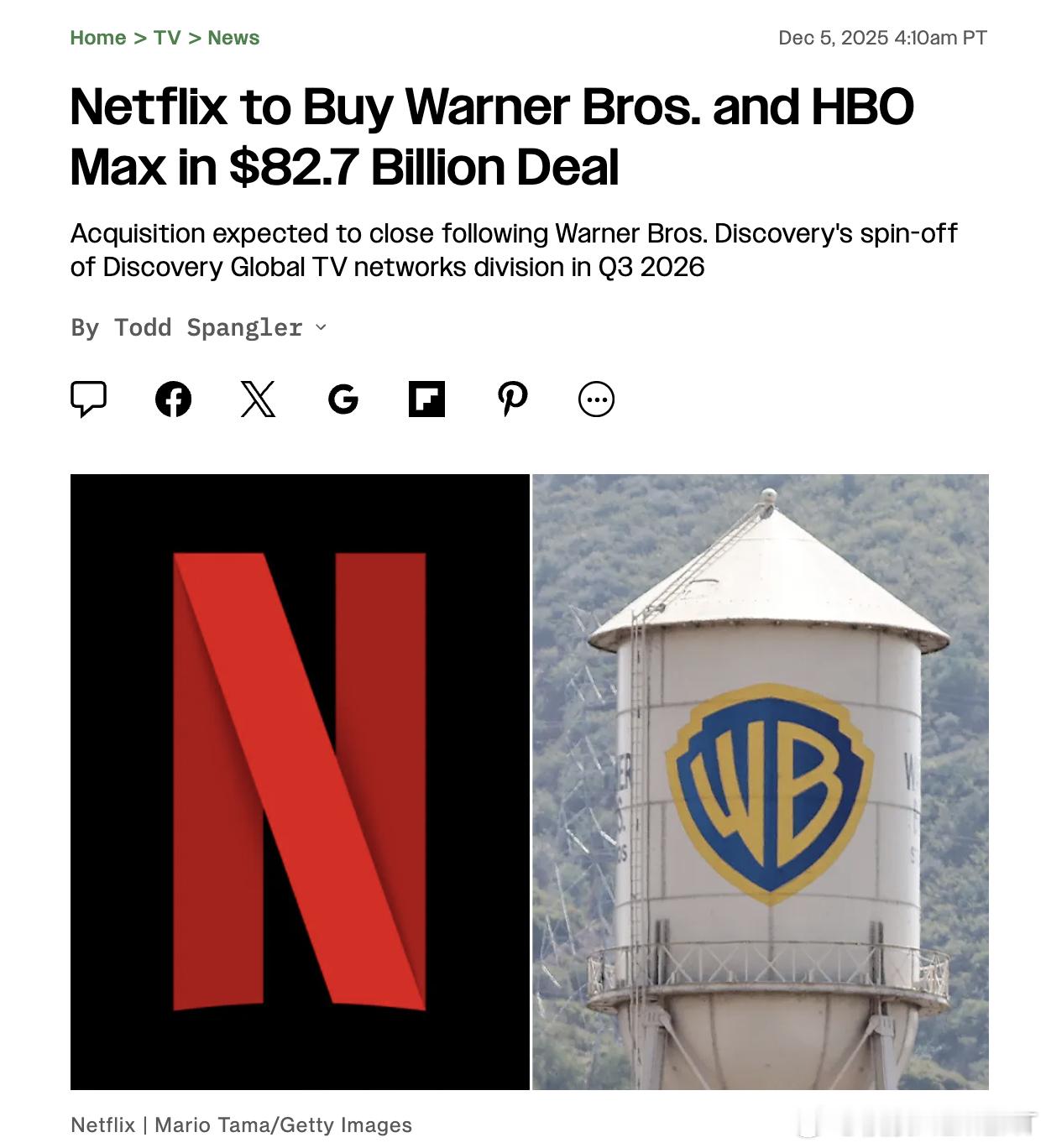 网飞以 827 亿美元收购华纳兄弟和 HBO Max 的交易在华纳兄弟探索公司(Warner Bros. Discovery)剥离 Discovery Global 电视网络部门之后,此次收购预计将于 2026 年第三季度完成交割。 官宣:网飞(Netflix)和华纳兄弟探索公司(Warner Bros. Discovery)于周五宣布达成协议,网飞将收购华纳兄弟及其电影和电视工作室、HBO Max 以及 HBO。 两家公司表示,这项交易的总企业价值(包括债务)约为 827 亿美元,股权价值为 720 亿美元。网飞宣布收购华纳兄弟流媒体和工作室业务的消息,是在与大卫·艾利森(David Ellison)的派拉蒙天空之舞(Paramount Skydance)和康卡斯特(Comcast)进行了长达数周的竞购战后发布的。周四晚间有消息称,网飞已与 WBD 就收购华纳兄弟和 HBO Max 达成独家谈判。网飞表示,预计将“维持华纳兄弟目前的运营并发挥其优势”,包括影片的院线发行。目前,华纳兄弟已确定电影的院线发行协议直至 2029 年。在短期内,网飞表示将保留 HBO Max 作为一个独立的服务,同时它也吹捧了将 HBO 和 HBO Max 内容添加到其内容库的举措。 该公司表示:“通过增加 HBO 和 HBO Max 深度电影和电视片库以及节目,网飞会员将有更多高质量的片源可供选择。” “这也使得网飞能够优化其消费者计划,增强观影选择,并扩大内容获取途径。” 网飞表示,预计在华纳兄弟交易完成后的第三年,每年可节省 20 亿至 30 亿美元的成本。该公司预计该交易将在第二年提高每股收益。 此次现金加股票交易对 WBD 的估值为每股 27.75 美元。两家公司表示,在 WBD 此前宣布的电视网络部门 Discovery Global 拆分为一家新的上市公司之后(预计于 2026 年第三季度完成),该交易预计将在未来 12 到 18 个月内完成交割。 根据协议条款,WBD 的每位股东将在交易完成时,每持有的一股 WBD 普通股,获得 23.25 美元现金和 4.50 美元的网飞普通股股票。 网飞和华纳兄弟探索公司的董事会一致批准了此次交易。该交易取决于 Discovery Global 剥离的完成、监管机构的批准、WBD 股东对交易的批准以及其他“惯例成交条件”。 据两家公司称:“此次收购汇集了两家开拓性的娱乐企业,将网飞的创新、全球影响力和业界最佳的流媒体服务,与华纳兄弟长达一个世纪的世界级故事叙事遗产结合起来。诸如《生活大爆炸》(The Big Bang Theory)、《黑道家族》(The Sopranos)、《权力的游戏》(Game of Thrones)、《绿野仙踪》(The Wizard of Oz)和 DC 宇宙(DC Universe)等深受喜爱的系列、节目和电影将加入网飞庞大的内容组合,包括《星期三》(Wednesday)、《纸钞屋》(Money Heist)、《布里奇顿》(Bridgerton)、《混沌少年时》(Adolescence)和《惊天营救》(Extraction),为全球观众创造非凡的娱乐产品。” 该交易声明没有提及华纳兄弟探索公司总裁兼首席执行官大卫·扎斯拉夫(David Zaslav)在交易完成后将担任什么职位(如果有的话)。扎斯拉夫原定将成为独立的华纳兄弟实体的首席执行官。 网飞在清除华纳兄弟交易的反垄断问题上面临潜在的障碍——大卫·艾利森的派拉蒙天空之舞在其最后一次竞标中与 WBD 董事会沟通时就强调了这一点。加州共和党众议员达雷尔·伊萨(Darrell Issa)在 11 月 13 日致特朗普政府官员的一封信中提出了这一担忧,他写道:“网飞目前拥有超过 3 亿的全球订阅用户和一个庞大的内容库,掌握着无与伦比的市场力量。” 包括美国导演工会和影院连锁行业组织 Cinema United 在内的好莱坞行业团体也站出来,表达了对网飞接管华纳兄弟将损害电影院业务的担忧。 网飞在声明中坚称,该交易将促成“一个更强大的娱乐产业”。该公司表示:“此次收购将增强网飞的工作室能力,使公司能够显著扩大美国的制作能力,并继续在长期内增加对原创内容的投资,这将创造就业机会并加强娱乐业。” 该流媒体还声称,网飞和华纳兄弟的合并将为“创意社区提供更多机会”,并在声明中表示:“通过将网飞的用户体验和全球影响力与华纳兄弟的知名系列和庞大片库相结合,公司将为人才创造更大的价值——提供更多与深受喜爱的知识产权合作、讲述新故事并接触到比以往更广泛受众的机会。” 网飞联席首席执行官特德·萨兰多斯(Ted Sarandos)在一份声明中说:“我们的使命始终是娱乐全世界。通过将华纳兄弟令人难以置信的节目和电影片库——从《卡萨布兰卡》(Casablanca)和《公民凯恩》(Citizen Kane)等永恒经典到《哈利·波特》(Harry Potter)和《老友记》(Friends)等现代热门作品——与我们具有文化定义意义的原创作品,如《怪奇物语》(Stranger Things)、《K-POP:猎魔女团》(KPop Demon Hunters)和《鱿鱼游戏》(Squid Game)相结合,我们将能够做得更好。我们将共同为观众提供更多他们喜爱的内容,并帮助定义下一个世纪的故事叙事。” 网飞联席首席执行官格雷格·彼得斯(Greg Peters)补充道:“华纳兄弟帮助定义娱乐业已有一个多世纪,并继续以非凡的创意高管和制作能力推动发展。凭借我们的全球影响力和经过验证的商业模式,我们可以向更广泛的受众介绍他们创造的世界——为我们的会员提供更多选择,吸引更多粉丝来到我们一流的流媒体服务,加强整个娱乐行业,并为股东创造更大的价值。” WBD 的扎斯拉夫在一份声明中说:“今天的宣布将世界上两家最伟大的故事叙事公司结合起来,为更多人带来他们最喜欢观看的娱乐内容。一个多世纪以来,华纳兄弟一直让观众兴奋不已,吸引了全世界的关注,并塑造