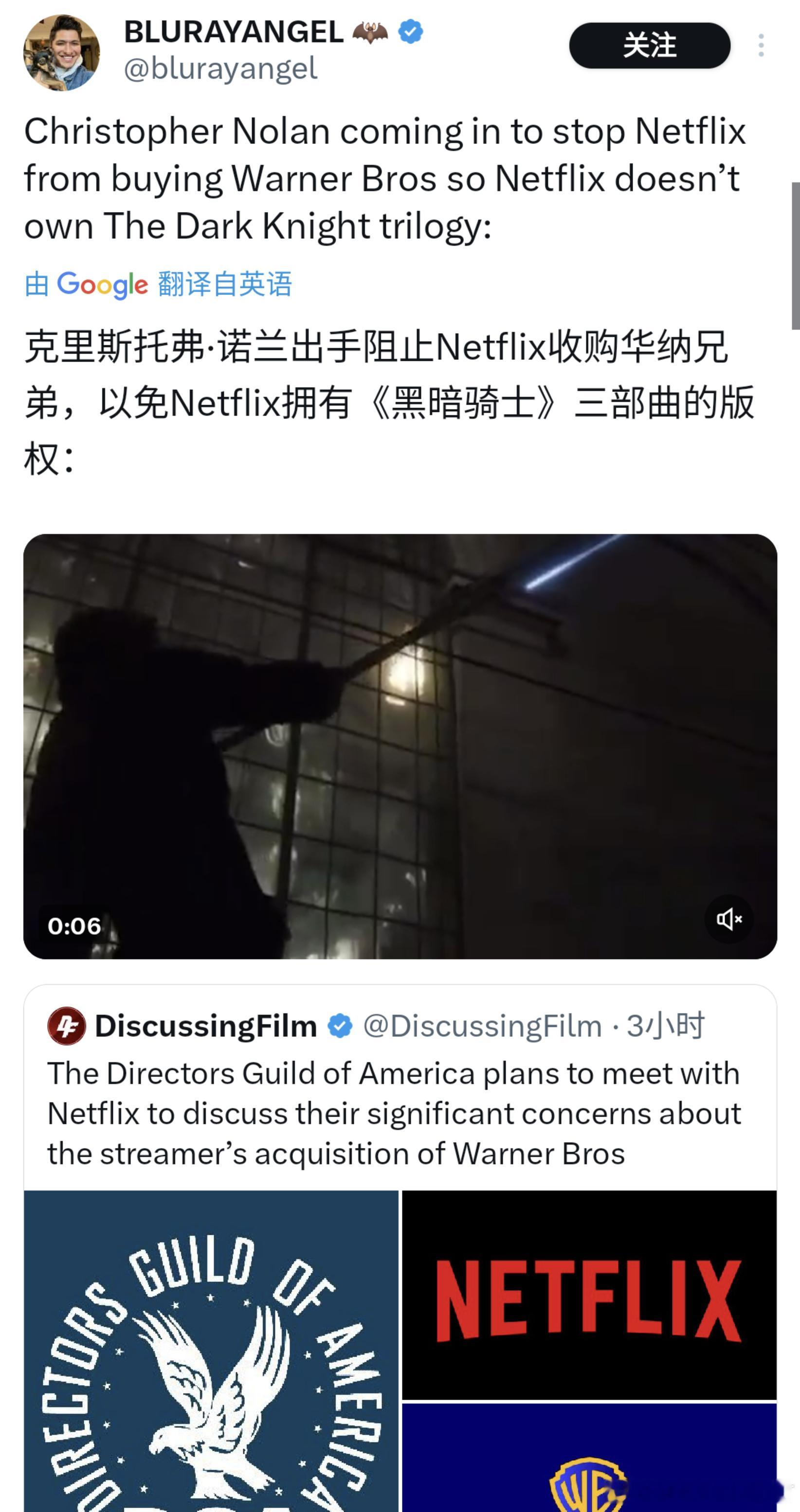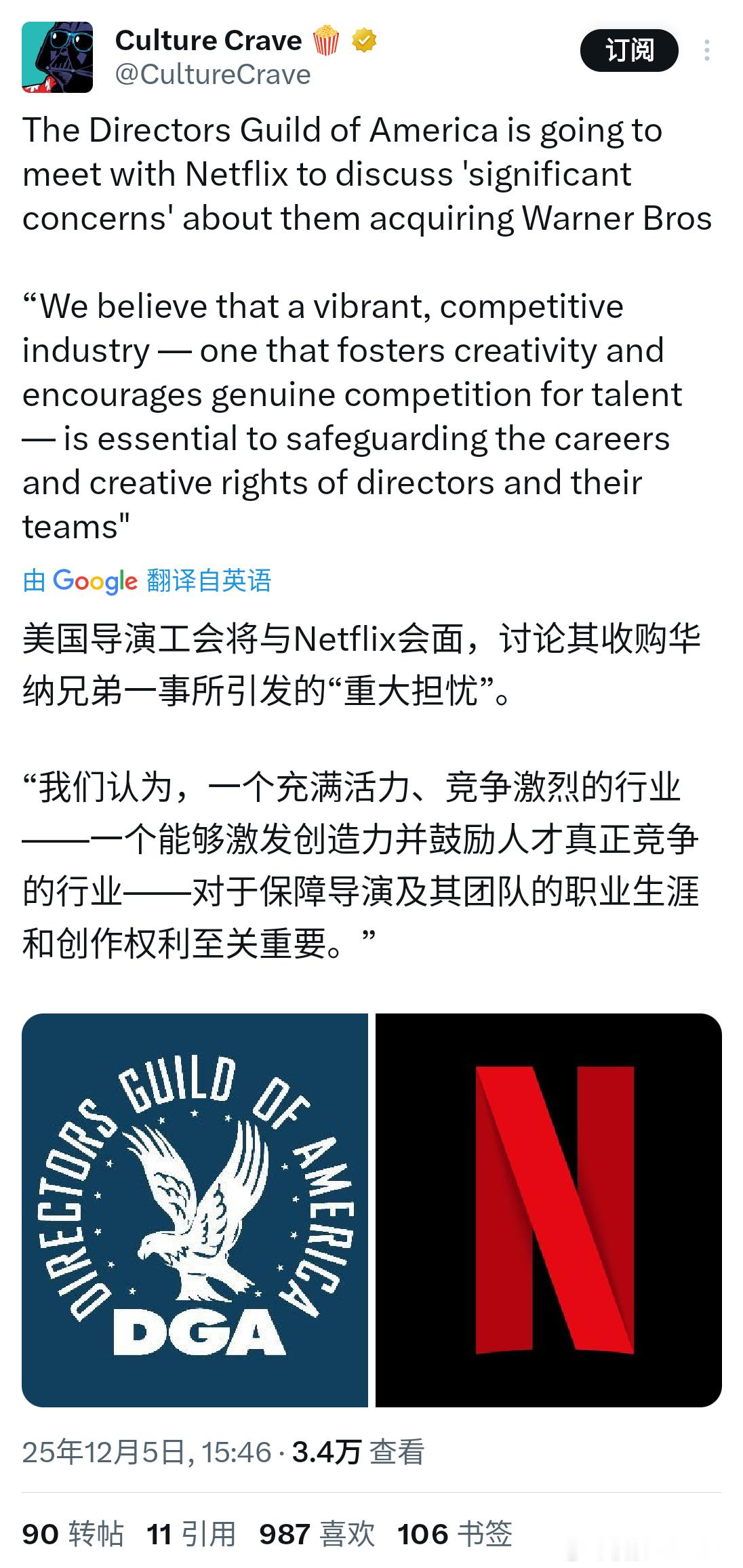 美国导演工会(The Directors Guild of America, DGA)将与网飞(Netflix)会面,讨论有关网飞收购华纳兄弟(Warner Bros.)的“重大担忧”。“我们认为,一个充满活力、具有竞争力的行业——一个能够培养创造力、鼓励真正人才竞争的行业——对于保障导演及其团队的职业生涯和创作权利至关重要。”