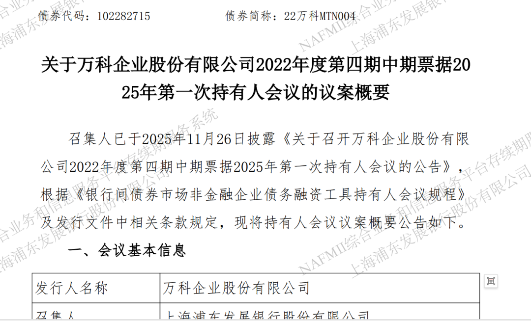 12月5日晚间,记者从上海清算所官网获悉,万科于当晚披露了其2022年度第四期中期票据2025年第一次持有人会议的议案概要。