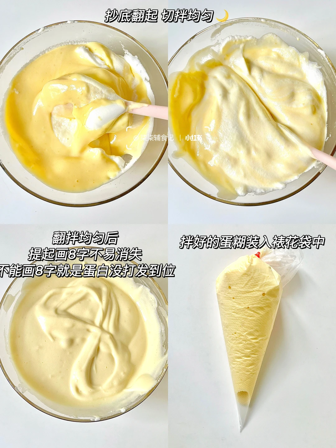 ▫️拌好的蛋黄糊再倒入蛋白中,抄底翻起,切拌均匀(最后提起能画8字不易消失)