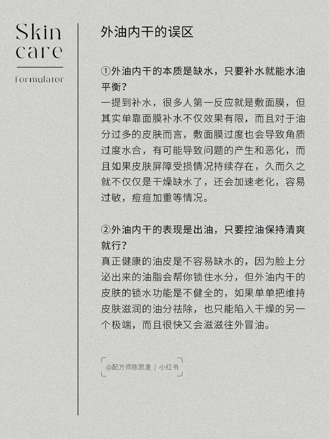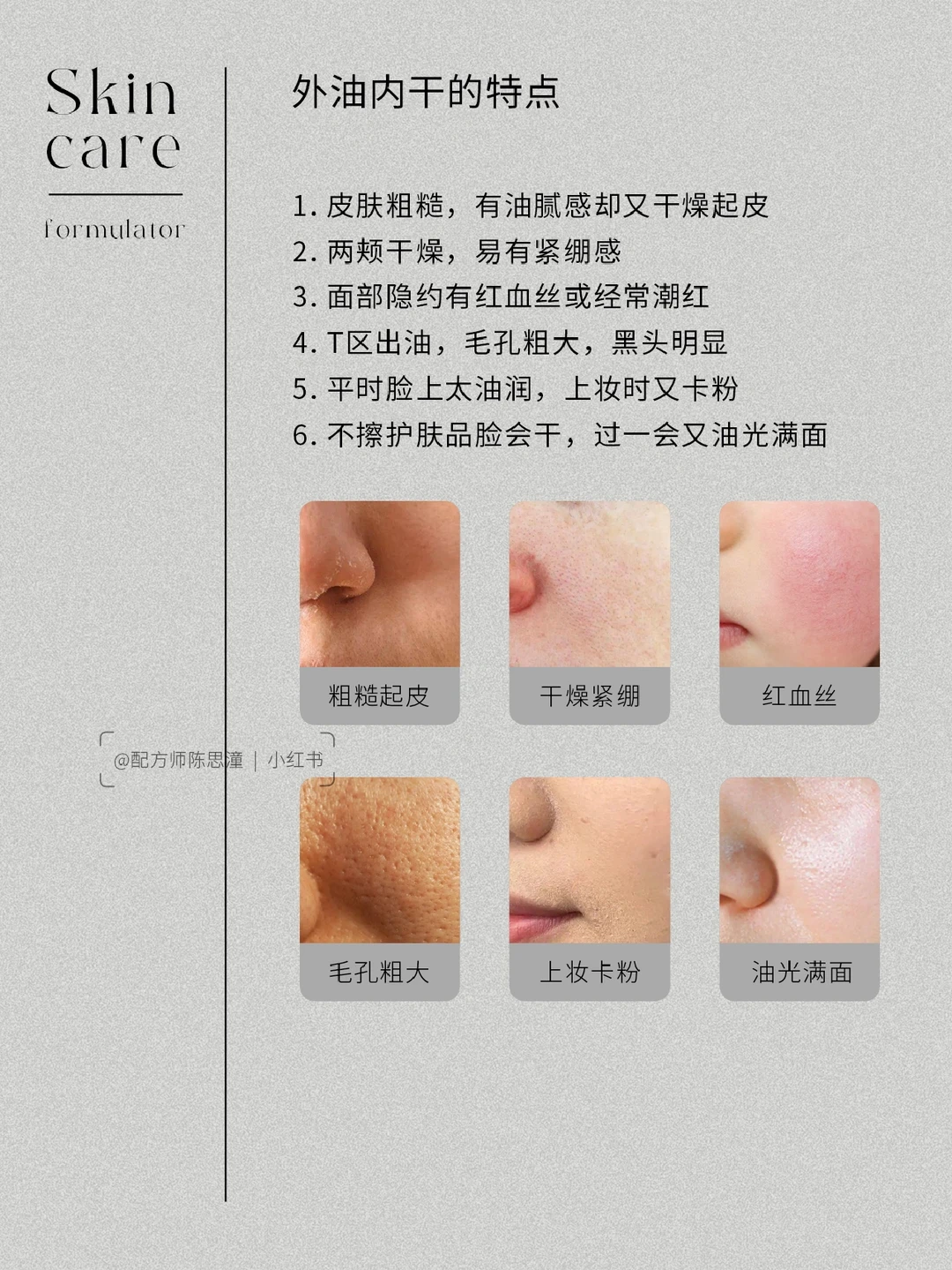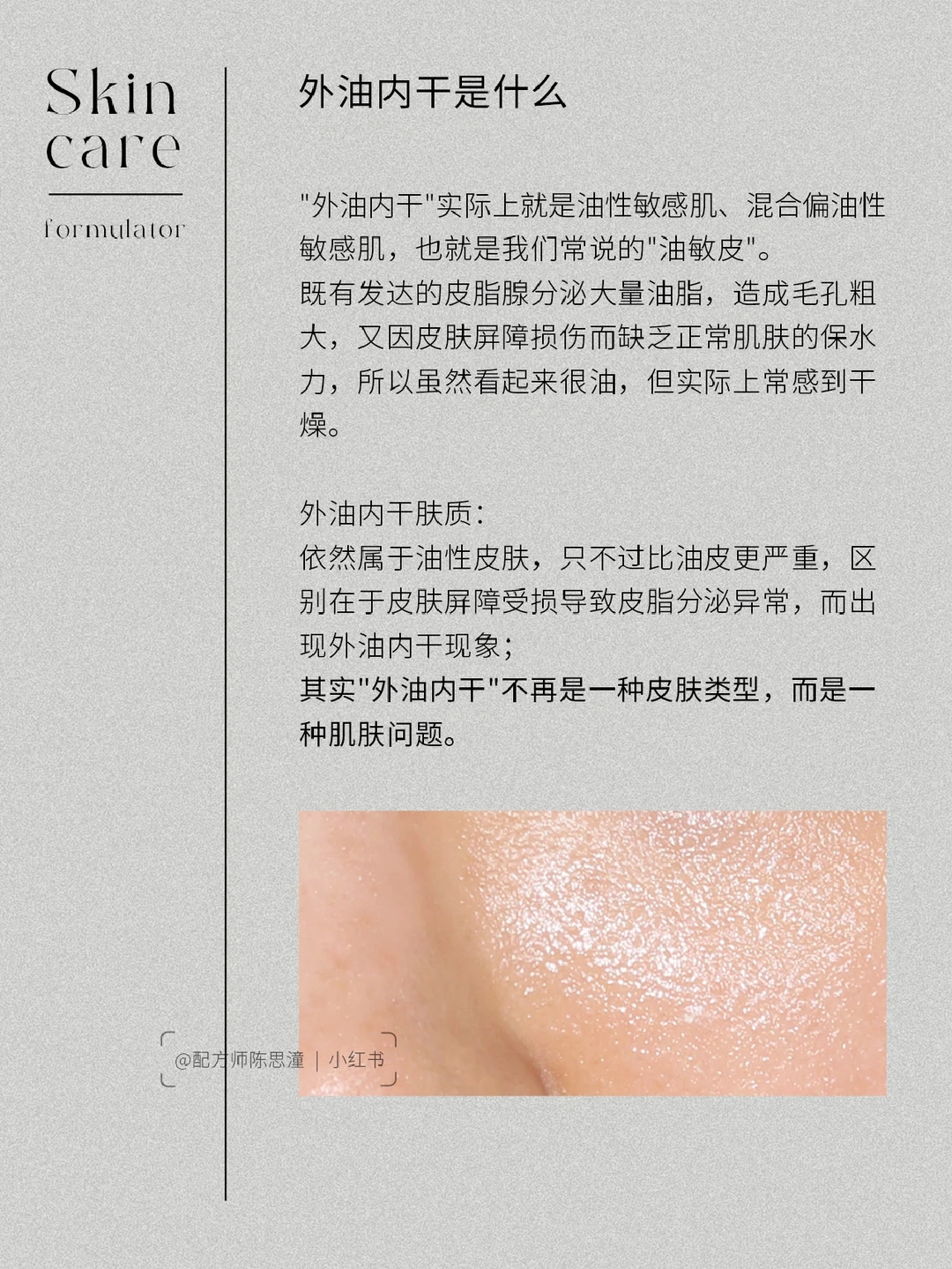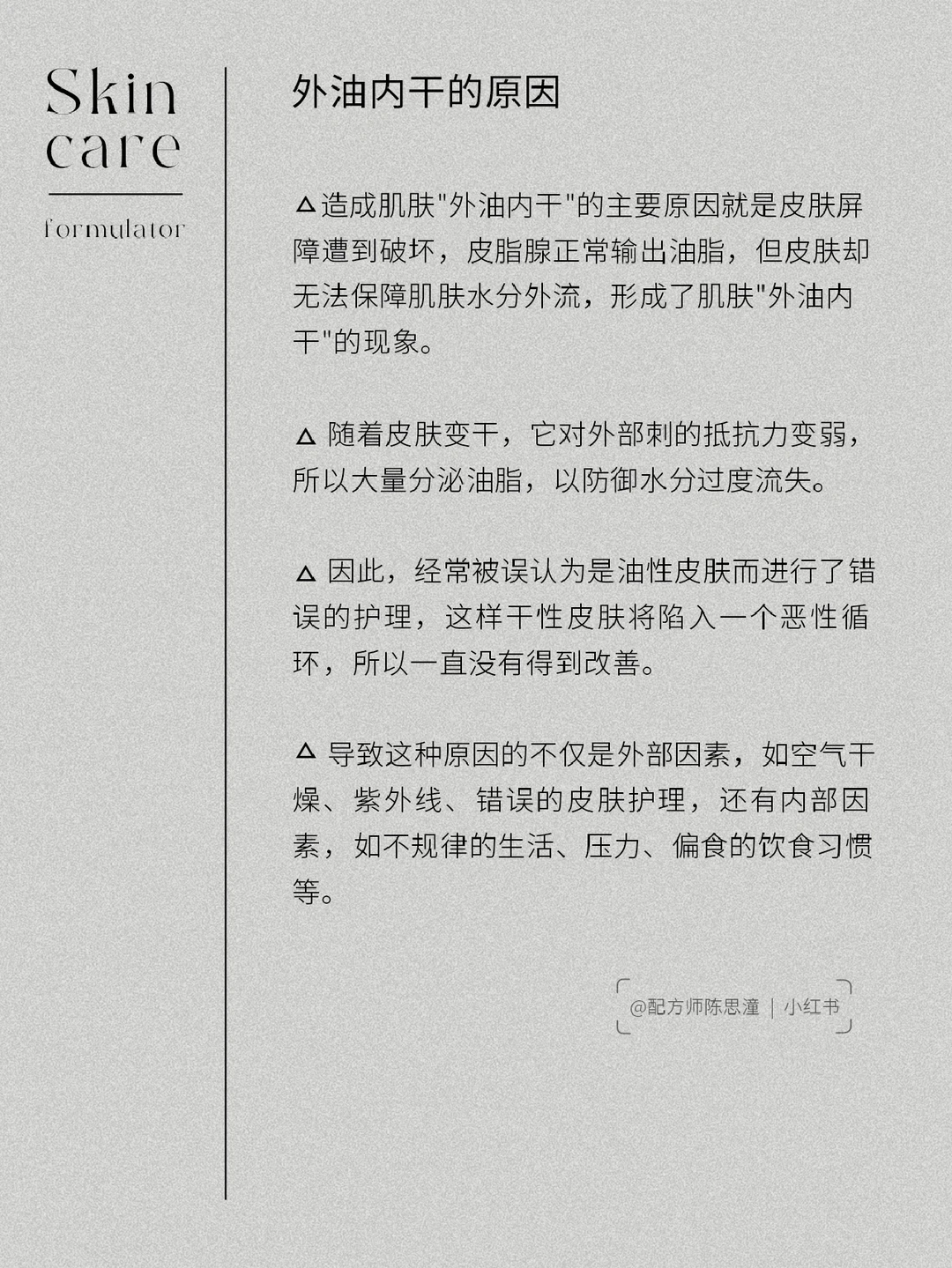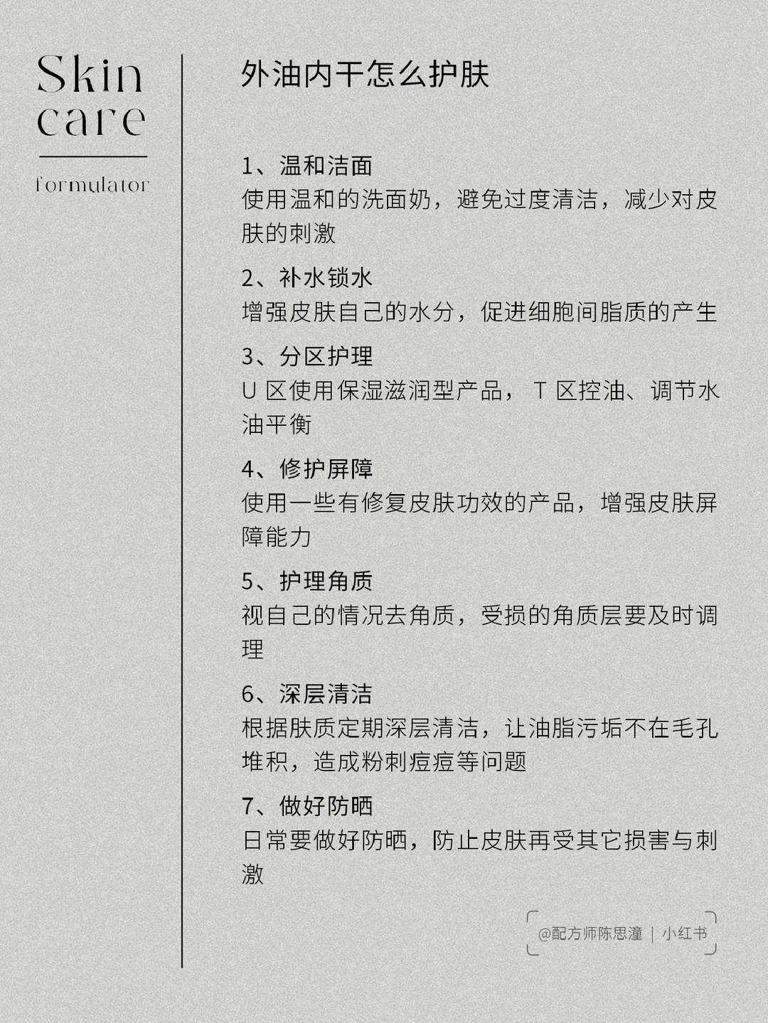 护肤知识|什么是“外油内干”,如何护肤? • 外油内干是什么 • 外油内干的原因 • 外油内干的特点 • 外油内干的误区 • 外油内干怎么护肤 1、温和洁面 2、补水锁水 3、分区护理 4、修护屏障 5、护理角质 6、深层清洁 7、做好防晒 一起来了解一下吧,下期还想看什么可以❤➕🍎告诉我哦