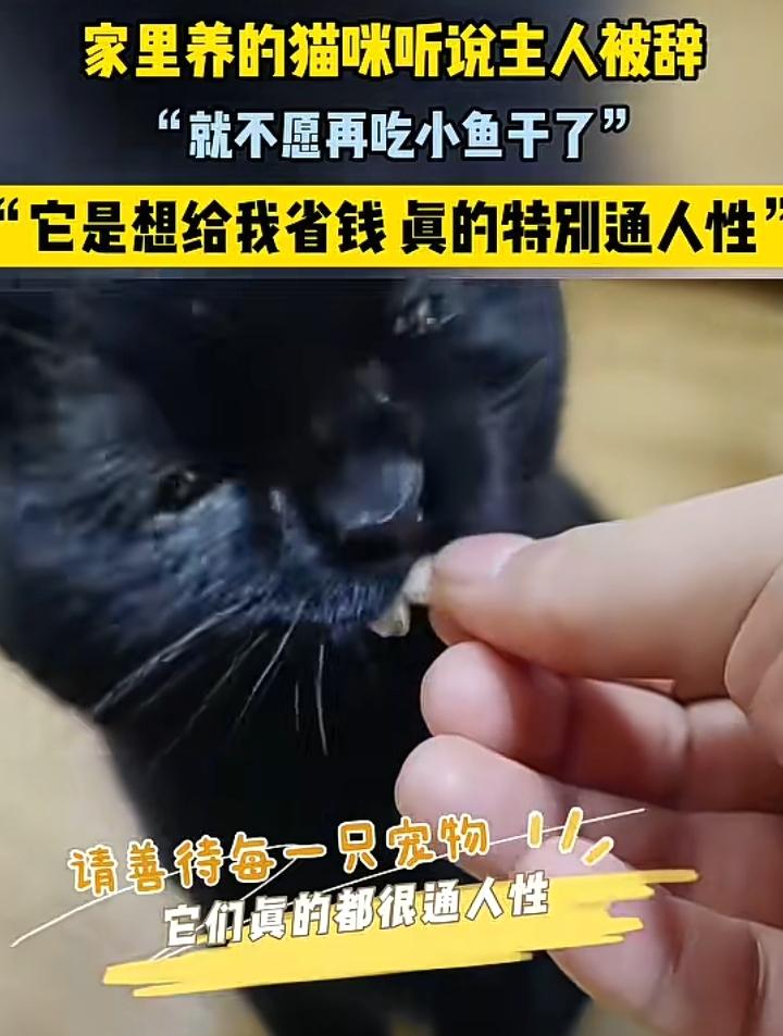 男子中年被辞,媳妇也回娘家了他一个人非常的失落,对着自己的黑猫倾诉说:这么关键的时刻怎么会发生如此凄惨的事,忽然没有了工作不知道下一步该怎么办,黑猫好像听懂了他的说词,伸了一个大大的懒腰就离开了。 到了晚上吃饭的时候,男子拿出它最爱的小鱼干,可无论怎么喂它就是不张口,这奇了怪了以前只要拿出小鱼干,还没拿稳就被它抢了去,这怎么了该不会是病了吧!男子不由得紧张了起来,才刚失业黑猫又病了,这真是点背啊! 可它看黑猫的眼神又觉得它没事,于是把小鱼干放到沙发上就去吃饭了,没想到黑猫跟过来了,看着他手里的馒头,男子心想该不会是放着鱼干不吃要吃馒头吧!他非常纠结的扯了一点馒头碎递给黑猫,没想到它居然吃的津津有味,男子继续喂它大约吃了5分之一个馒头,男子心想可能是天天吃鱼干吃腻了,想换个口味。 第二天他依然拿出小鱼干可黑猫还是不吃,这还真是奇怪,他又拿出馒头喂它就吃的津津有味,男子猛的一惊突然间破防了,此刻他才明白黑猫想力所能及的给他减轻一些负担,他挠挠头忽然间觉得非常暖心,却也有几分内疚,自己真不应该在黑猫面前诉说窘境,有些毛孩子它能听懂。 第二天男子打扮的非常精神,他要在这个礼拜天之前参加几次面试,争取找到一份工作,或许在那些不经意的温暖瞬间,是你我为之奋斗的理由,怎么也没想到那只黑猫用这样的方式体恤男子。