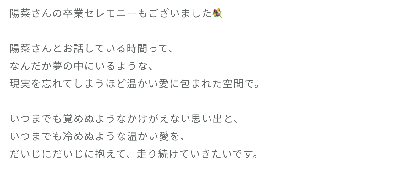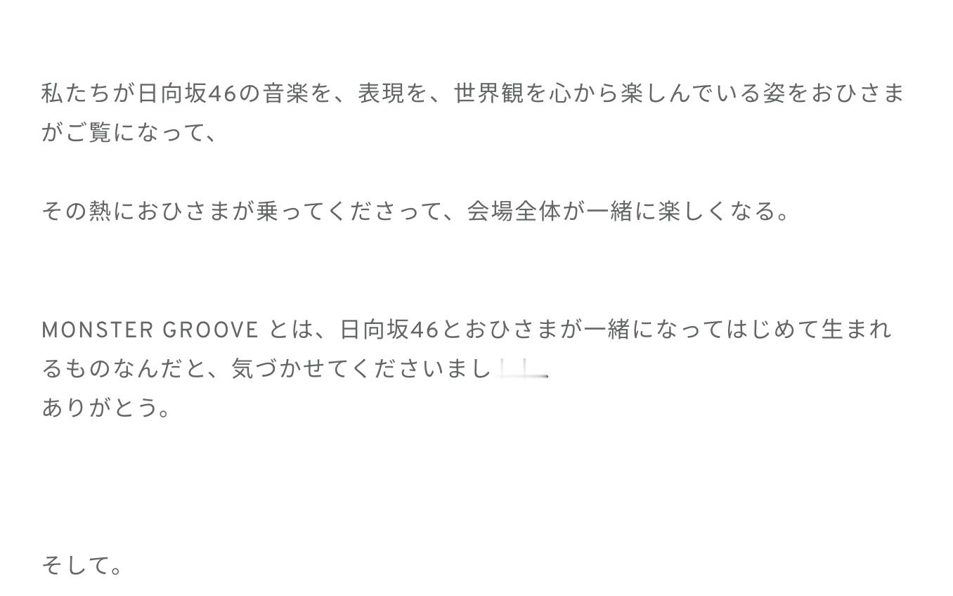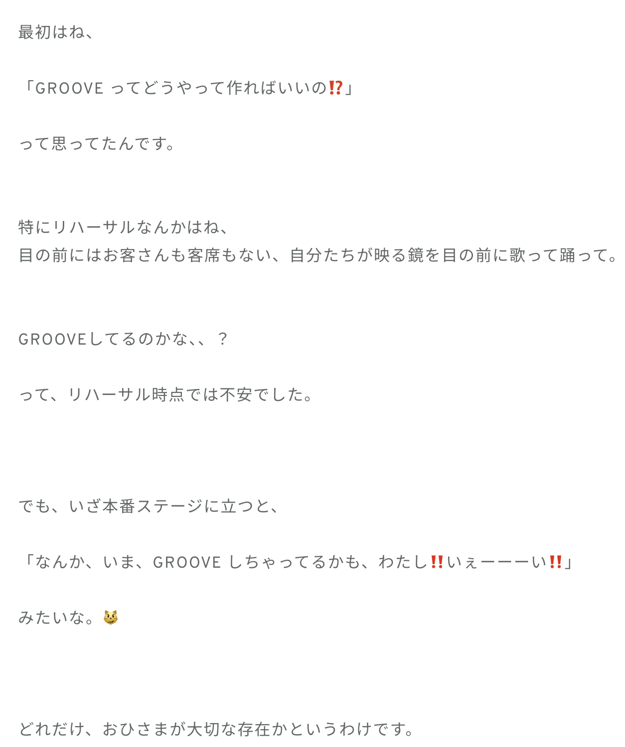 大野愛実「夢のような約2ヶ月、ありがとうございました!始まったころは暑いねなんて言っていたのが、いつのまにか寒いねになっていましたね。リハ着が半袖から長袖になっていくグラデーションが面白かったです。(にぃなと妃那乃は、代々木の初日まで半袖だったという逸話)。」