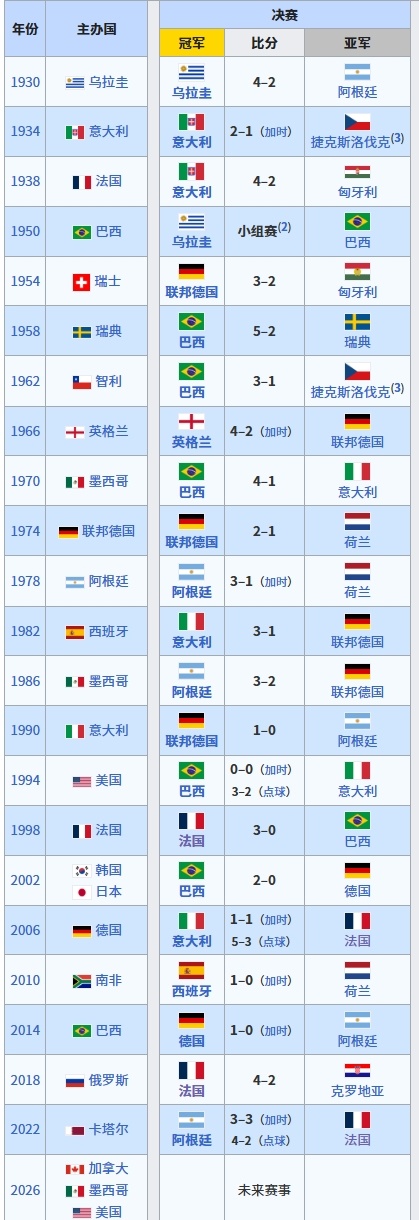 注1:1950年世界杯未举行单场的冠军决赛。而是由四支球队进行循环赛,根据各队总积分排定名次。最终乌拉圭第1,巴西第2。