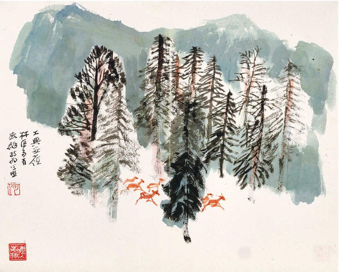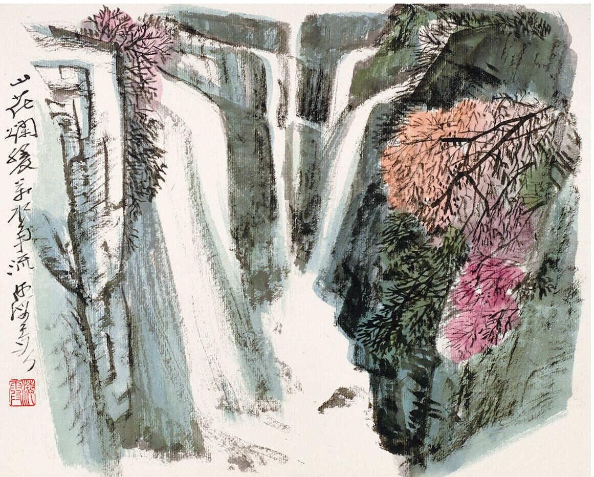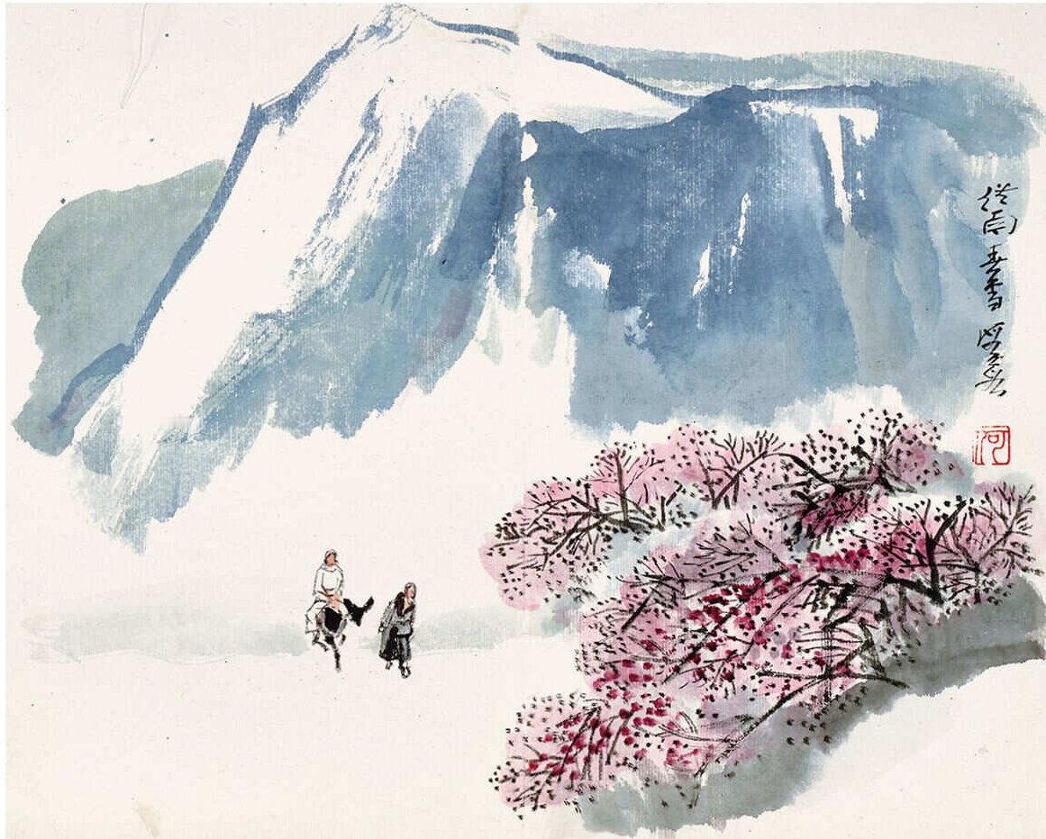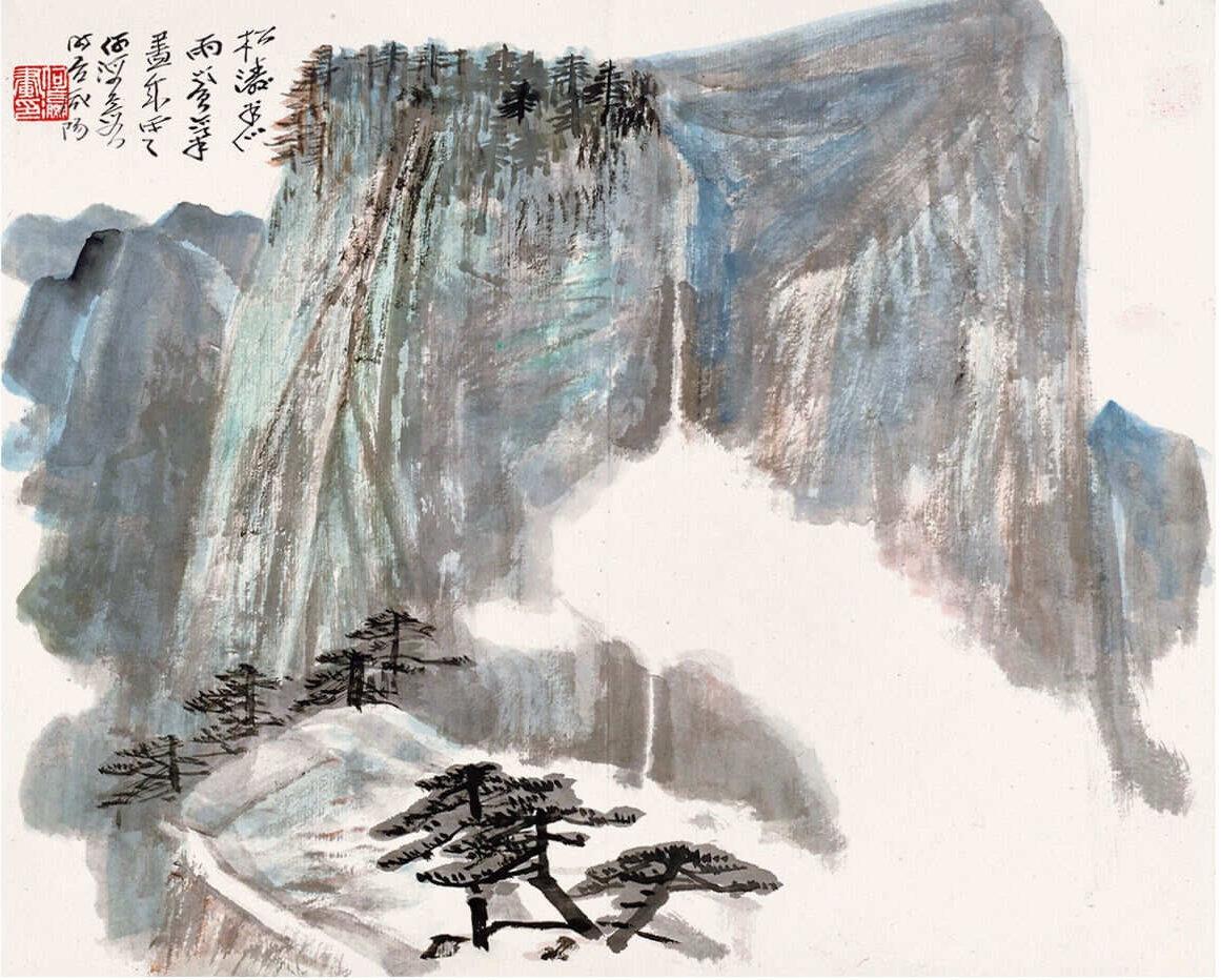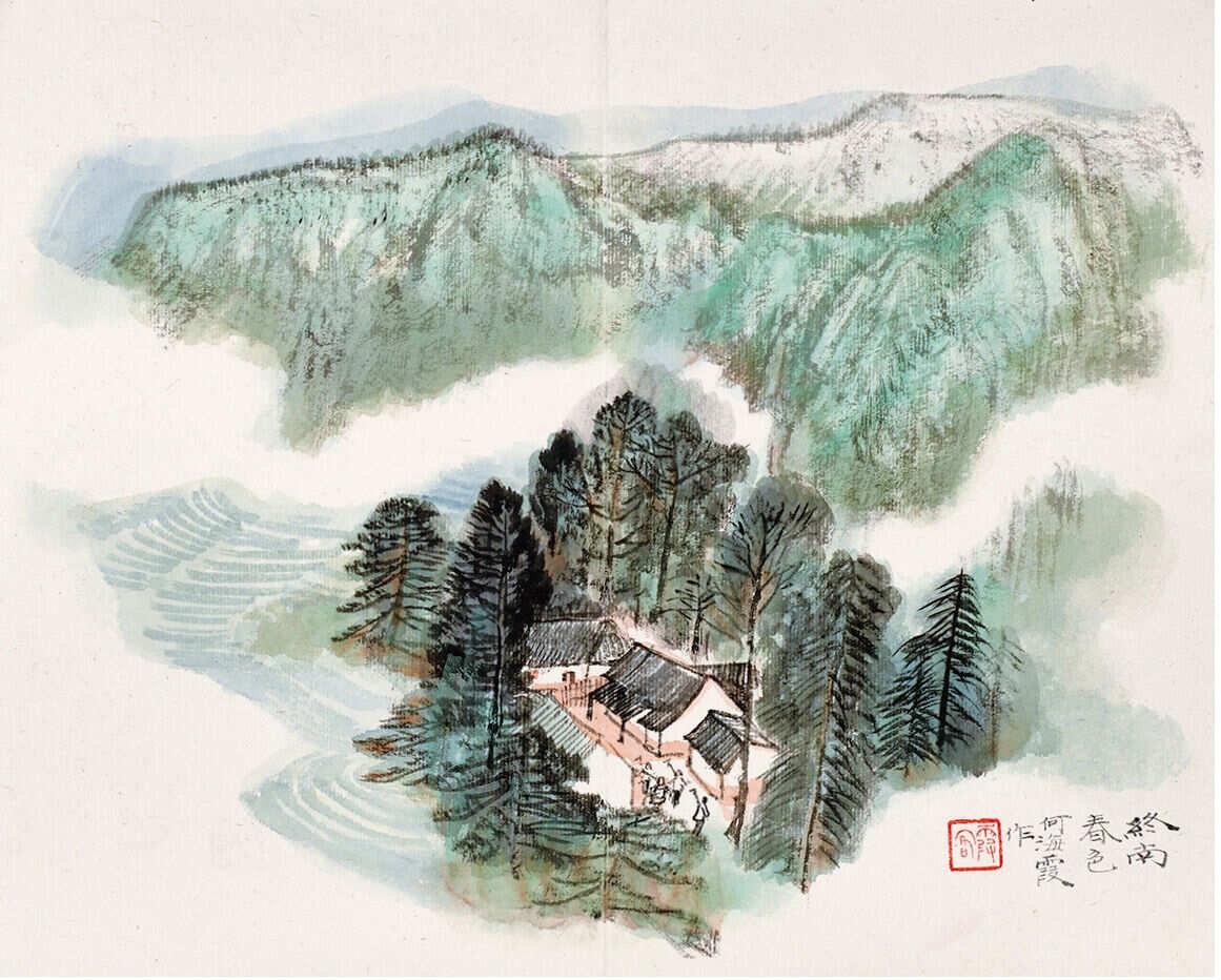 何海霞早年师从张大千,深得宋元以来北宗山水精髓。后融入写生观察与时代气息,形成了雄浑中见秀润、工致中富写意的艺术特点。他的《山水册》十二开便是典型代表,每幅虽尺幅不大,却以小见大,凝聚了对南北山川、四时景致的精炼表达。如“终南春色”以青绿点染山峦,色墨交融间透出温润生机;“松涛半似雨”运用渴笔皴擦,营造出岚气氤氲的朦胧意境,尽显意趣。 作为长安画派的重要画家,何海霞将北方画派的雄健有力与南方画派的温润秀美完美融合。他还善于将小青绿、大青绿、金碧、泼彩等多种技法融为一体,所绘金碧华山,使千山万壑金光闪闪,清雅富贵,极具风姿。其作品不仅有传统笔墨的严谨法度,又透露出对自然真景的深刻体悟,无论是气势恢宏的巨幅山水,还是精致入微的小型佳作,都能让人感受到其中蕴含的独特韵味和蓬勃生机。