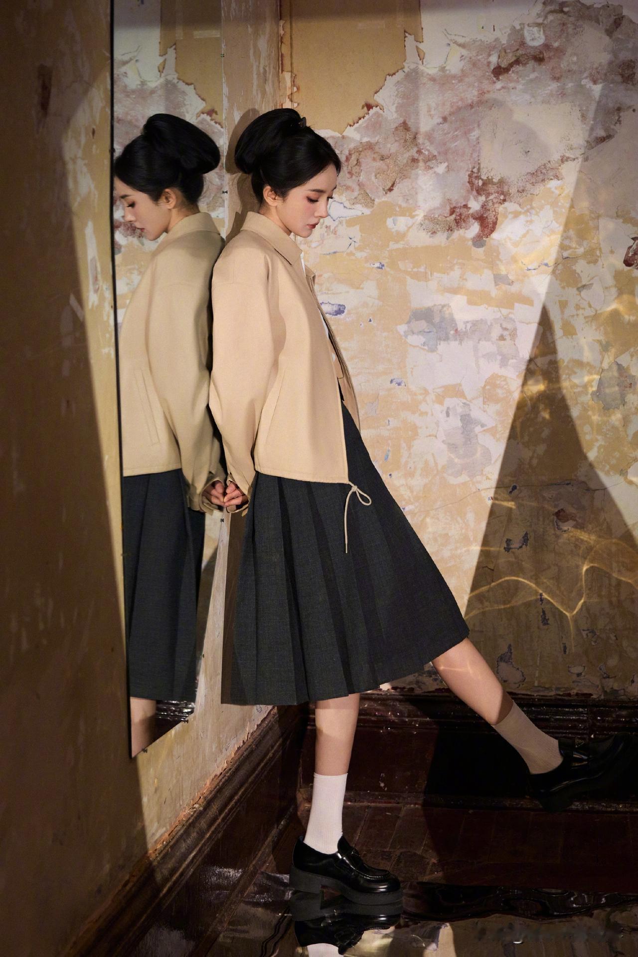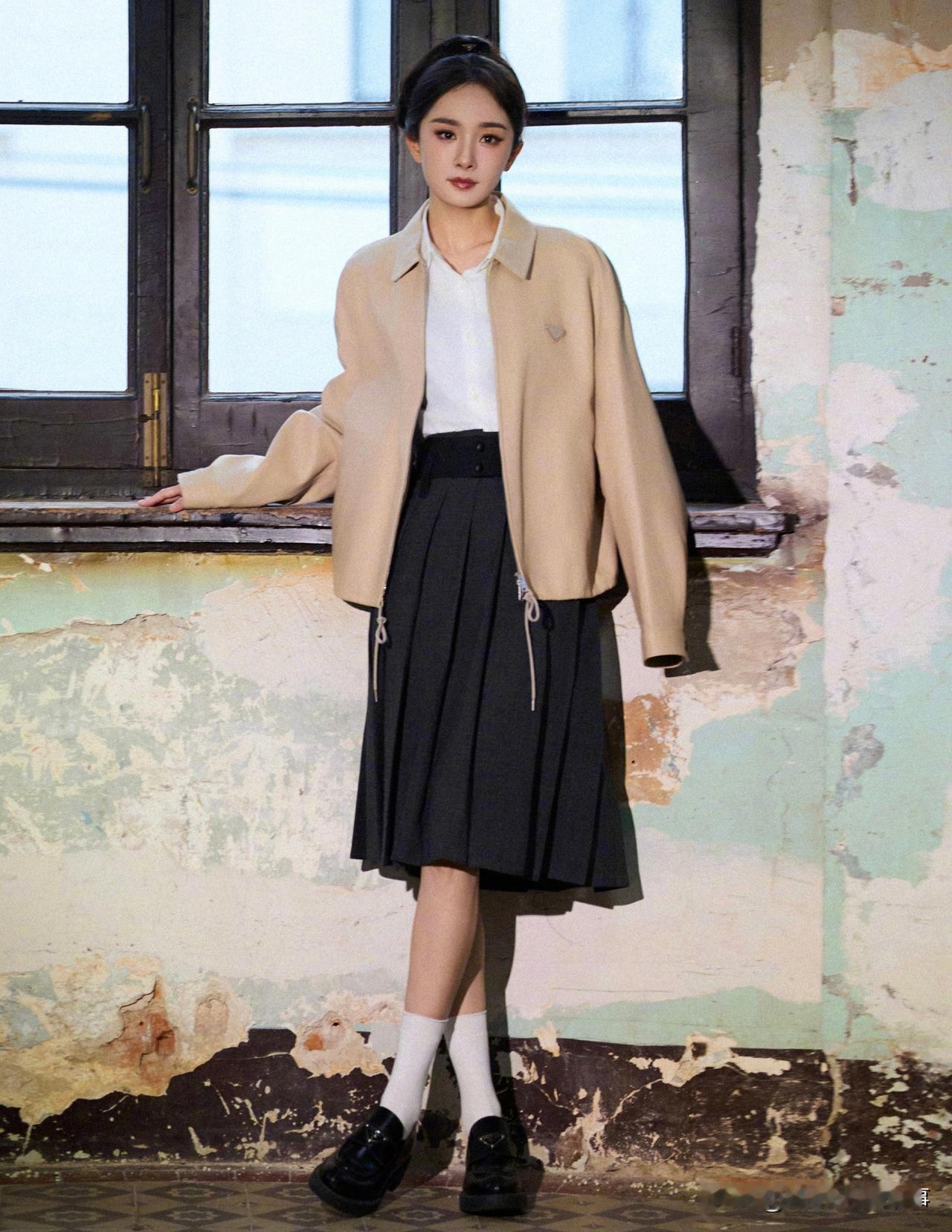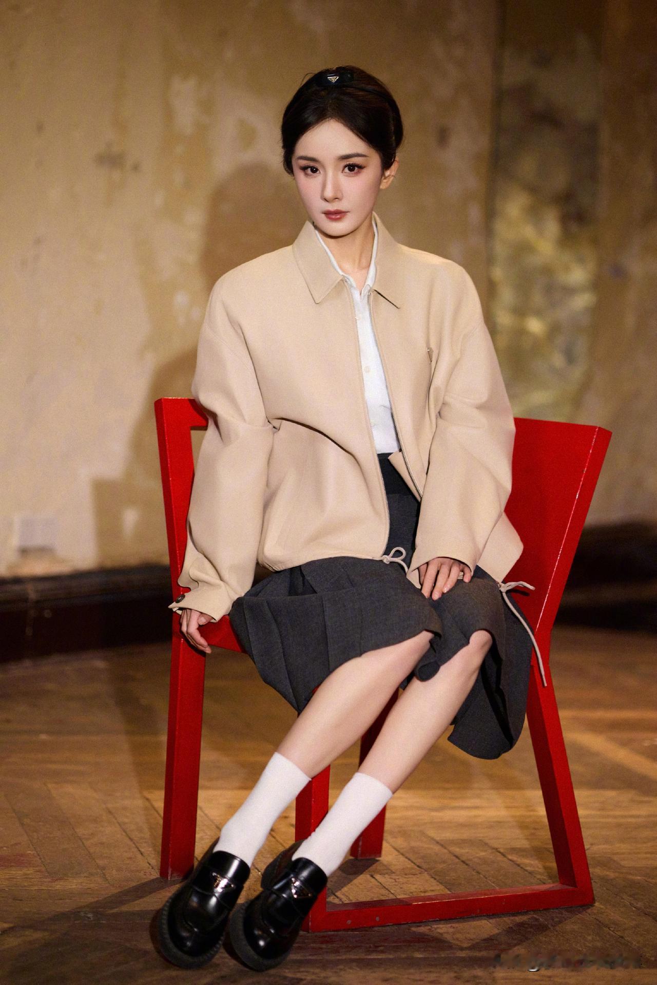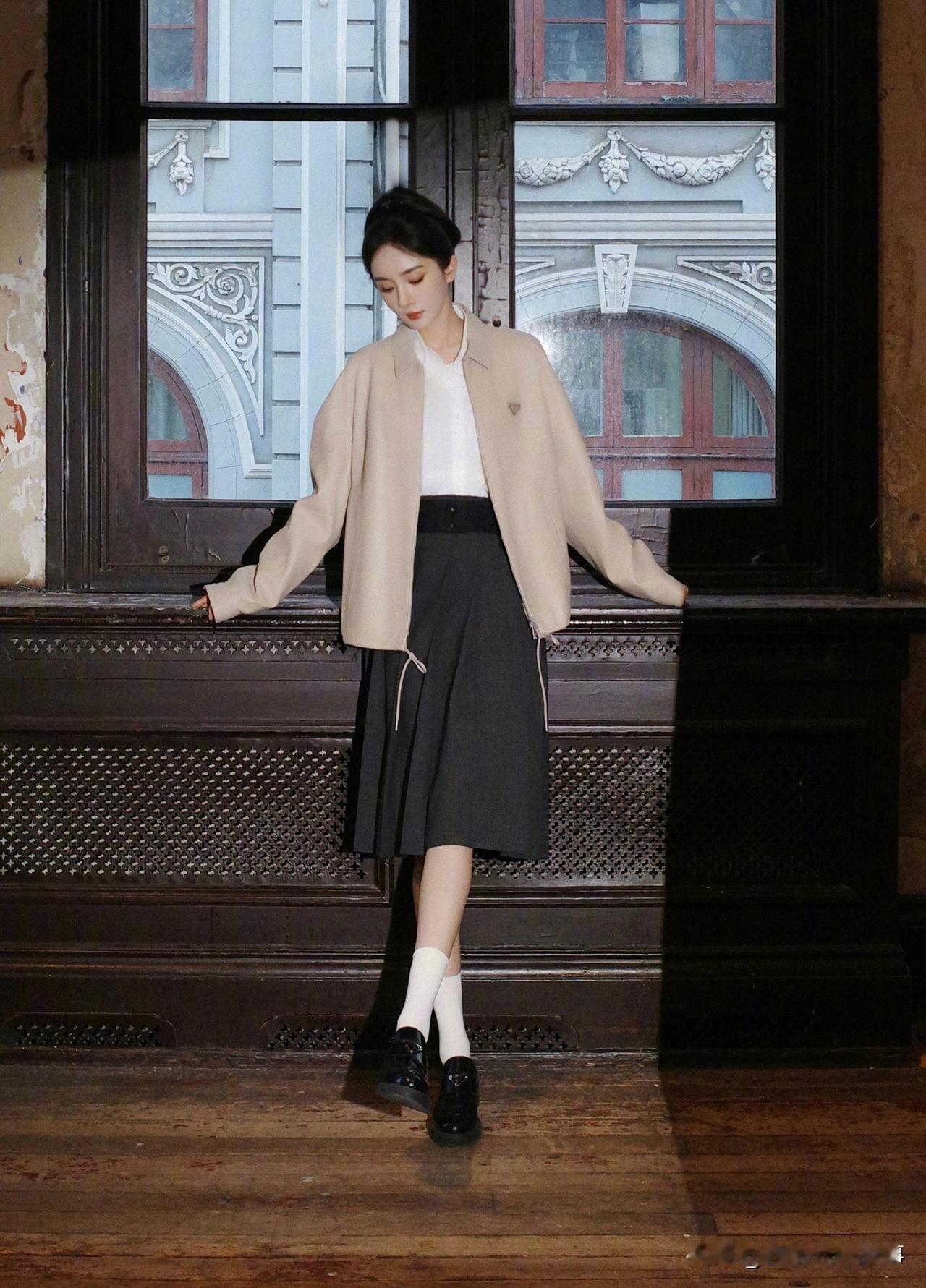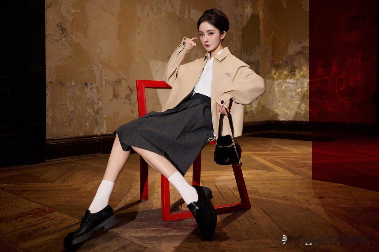 杨幂Prada学院风造型:柔飒氛围感教科书 杨幂新造型以卡其+白+灰的低饱和配色,搭Prada宽肩夹克与百褶裙,利落版型衬出温柔飒爽的气质,三角标配饰点睛品牌质感。简约色系叠搭学院风元素,既契合高奢调性,又把“文艺大小姐”的松弛氛围感拉满,穿搭适配度与时尚表现力双在线。
