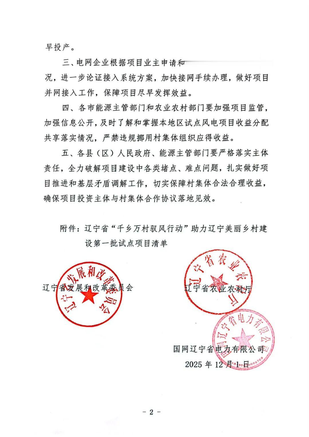 风芒能源获悉,12月1日,辽宁省发改委、辽宁省农业农村厅、国网辽宁省电力有限公司发布《关于下达辽宁省“千乡万村驭风行动”助力辽宁美丽乡村建设第一批试点项目的通知》。