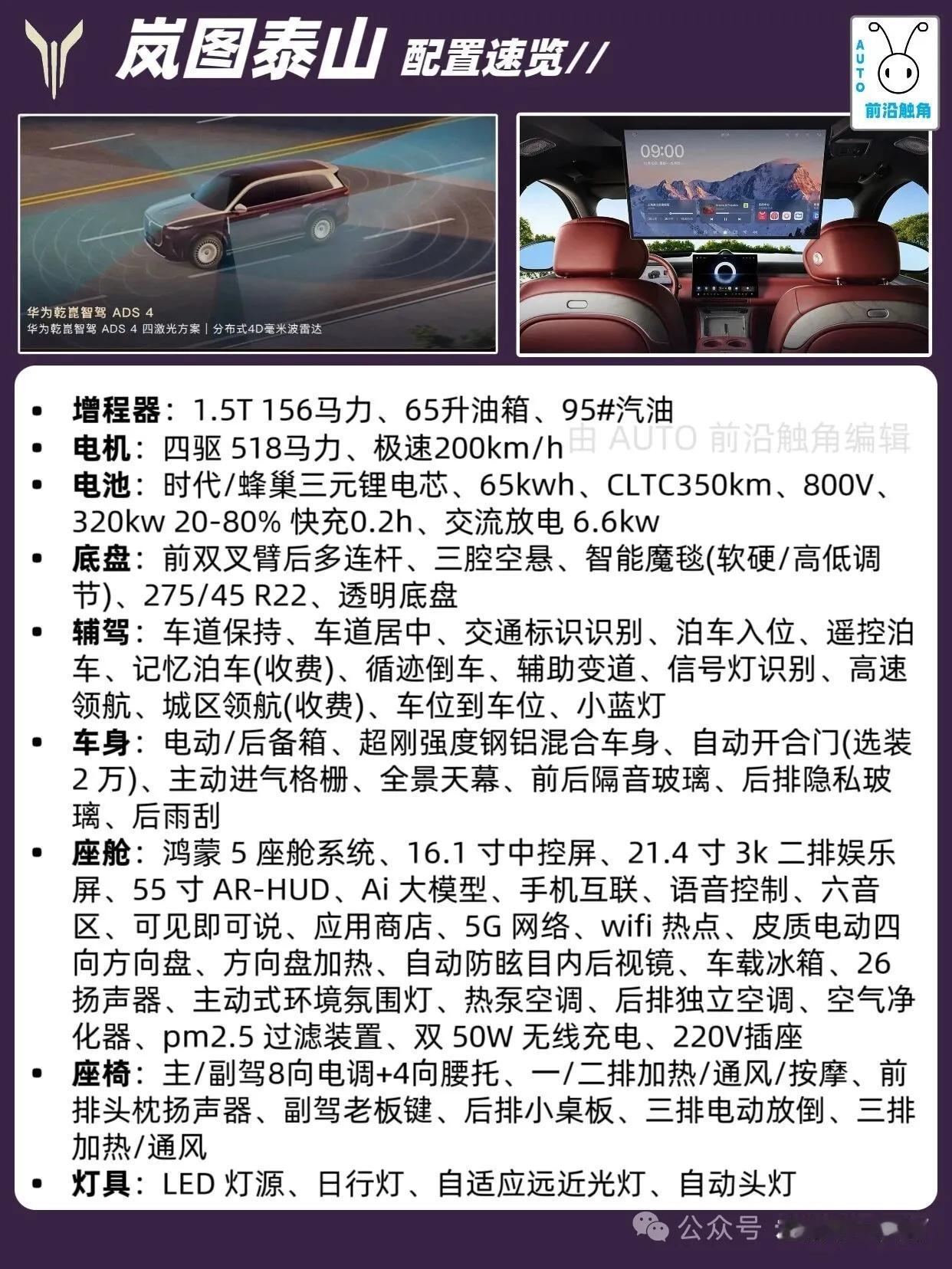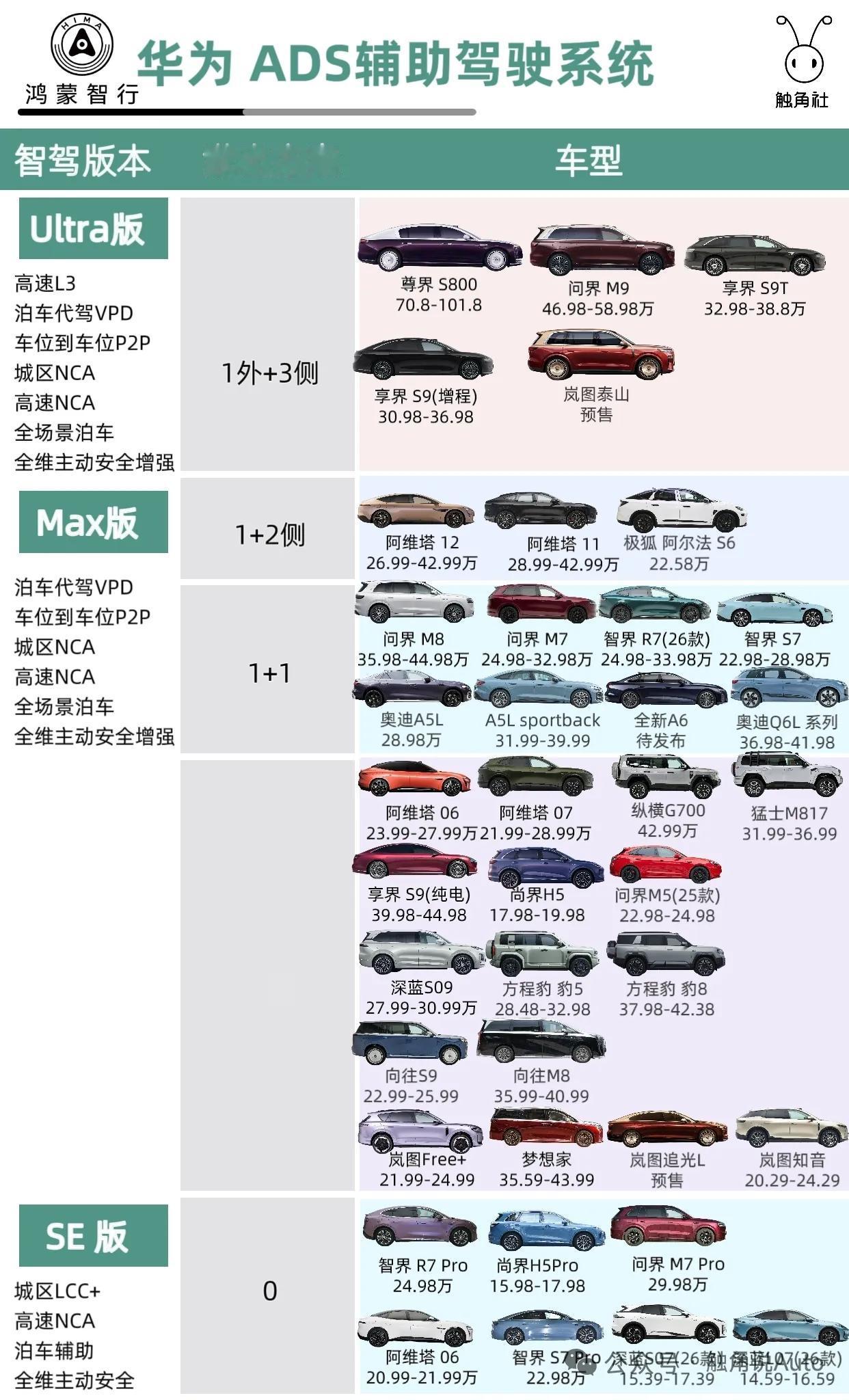 搭载华为乾崑ADS Ultra版的车型有哪些? 1岚图泰山 2问界M9 3尊界S800 4享界S9T 5享界S9增程 其中岚图泰山是五界之外唯一的高配品牌,也是华为乾崑合作车型最多的品牌。目前岚图与华为有5款合作车型。