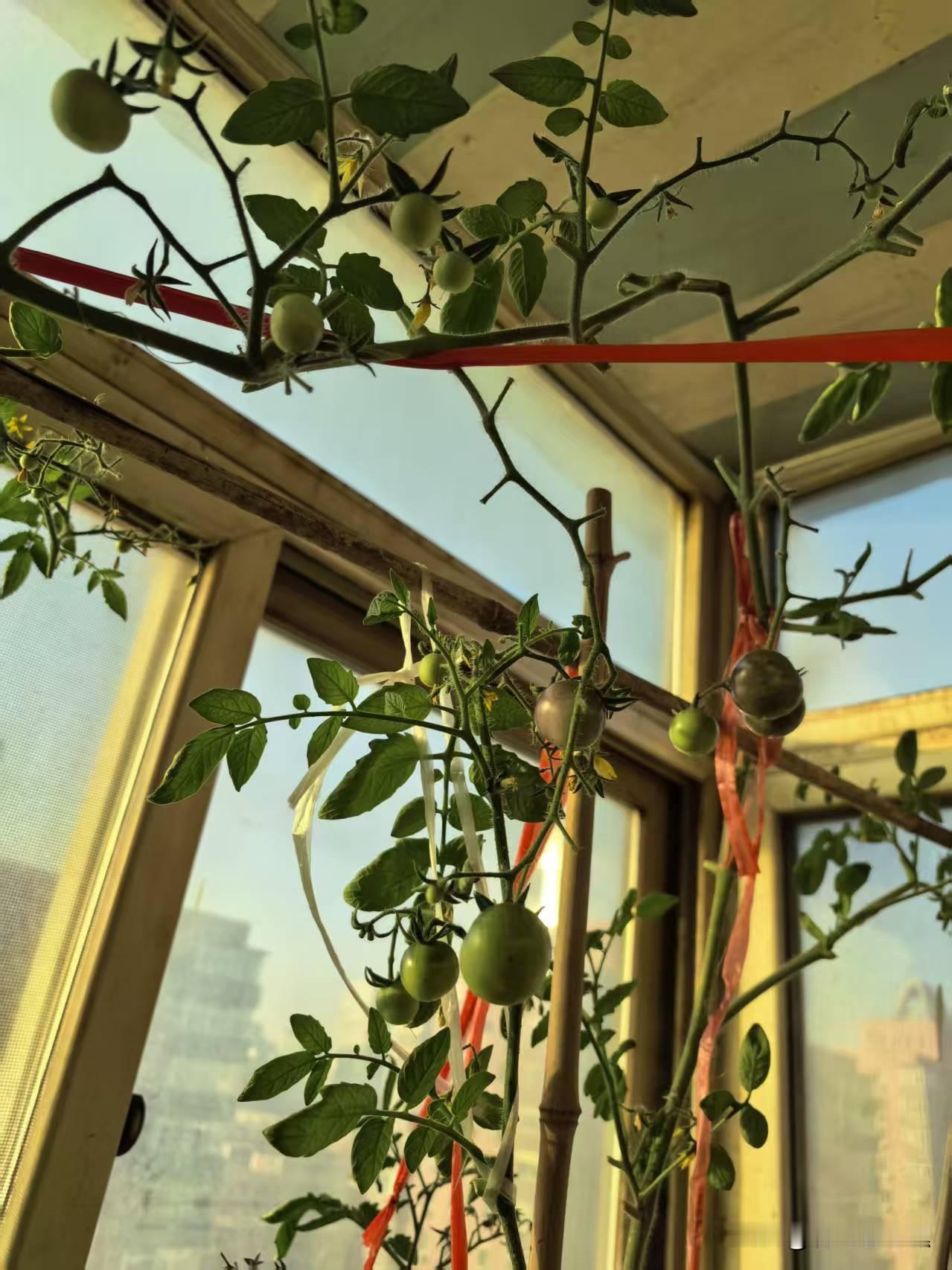 前段日子买了几斤小番茄,有几个还带着枝子,顺手就插在花盆里了。 将近一个月过去了,没想到,居然开枝散叶了,还接了三十多个小番茄,问题是我当时买的是红色小番茄,怎么长出来却是紫色的呢? 看来现在连番茄都不正经了啊,这世道,还能信谁? ——————