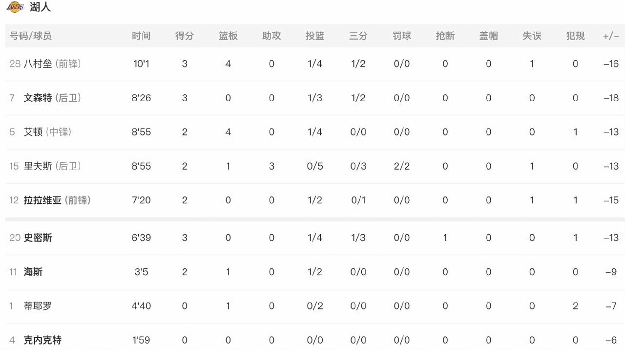 真的没想到!第一节结束,湖人17-39落后凯尔特人22分。比赛难打了…… 詹姆斯缺阵,东契奇不在,里夫斯单核带队打凯尔特人,首节小里仅得2分。