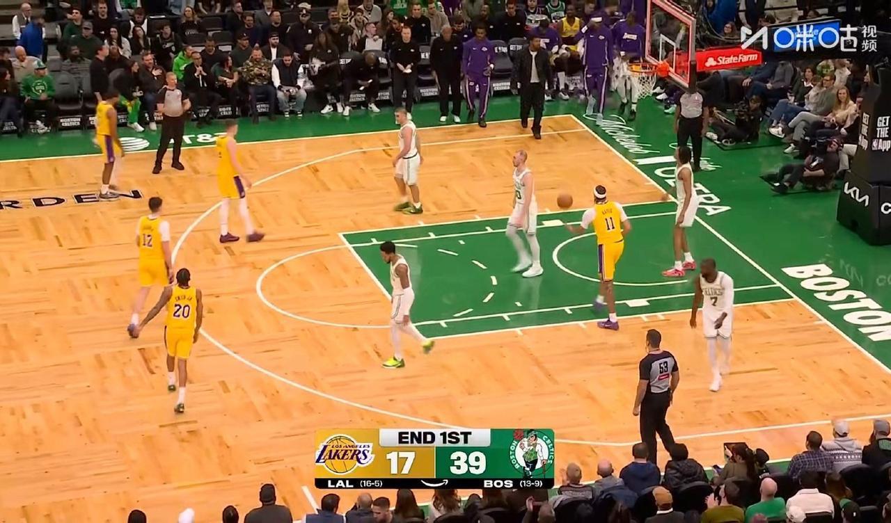 真的没想到!第一节结束,湖人17-39落后凯尔特人22分。比赛难打了…… 詹姆斯