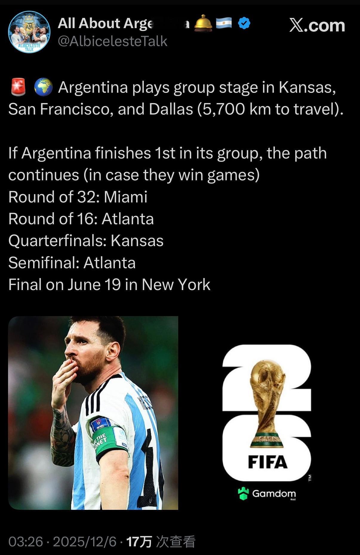 🇦🇷阿根廷2026年世界杯征程路线小组赛:• 堪萨斯州• 旧金山• 达拉斯➡️总行程:约5700公里如果阿根廷最终获得第一名,他们的晋级之路大致如下(假设他们一路获胜):• 32强:迈阿密• 16强:亚特兰大• 四分之一决赛:堪萨斯州• 半决赛:亚特兰大• 决赛:7月19日——纽约🏆梅西