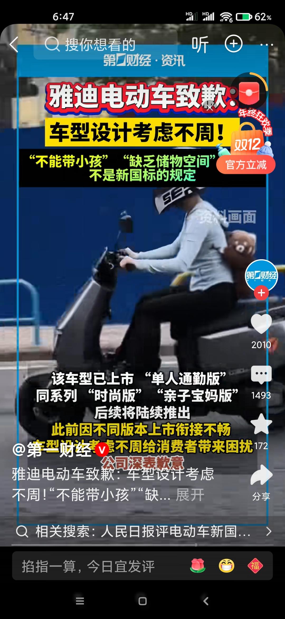 中国青年报客户端北京12月5日电(中青报·中青网记者 贾骥业)今天中午,雅迪科技集团有限公司(简称“雅迪电动车”)发布《关于新国标车型的说明》,表示该公司生产的“毛豆”电动车(“单人通勤版”)在车型设计上有一些考虑不周的地方,给一直期待不同需求的消费者带来了不便与困扰,对此深表歉意。 然而,这一道歉声明背后,却折射出一个更深层次的社会现象——我们对“便利”的不断追求,是否正逐渐侵蚀着我们对安全与责任的底线? 作为一款被无数年轻人期待的“单人通勤”电动车,“毛豆”曾被寄予厚望,代表了都市快节奏生活中对绿色出行的渴望。谁曾想,一款小小的“毛豆”,却因为设计上的疏忽,带来如此大的困扰和隐患?这让我们不得不反思:在追求创新和便捷的同时,我们是否忽略了对细节的把控与责任感的坚守? 其实,这不只是雅迪的问题,而是整个行业乃至社会的缩影。当“快”成为唯一目标,安全与责任是否还被放在心中的优先位置?从消费者的期待到厂商的责任,似乎都在不断地被“效率”所绑架,最终让我们陷入一个充满矛盾的漩涡:一边是对新奇的渴望,一边却是对安全的担忧。 更令人深思的是,面对问题,企业的第一反应还是“道歉+整改”,这是否说明我们对“责任”这一概念的理解还不够深刻?还是说,整个行业的“责任感”早已被利益所稀释?每一次“道歉”,都像是在告诉我们:出了问题,先认错,再解决,然后继续前行。这种模式,真的能让我们信服吗?还是只是一场短暂的“善意”表演? 在这个快速变化的时代,消费者的心声越发敏锐。我们不再满足于“快”的满足,更渴望“安全”“责任”“品质”的保障。毕竟,没有什么比生命安全更重要。我们希望看到企业不仅仅是在出现问题后“补救”,而是在设计之初就将安全放在第一位,用心打磨每一款产品,让“毛豆”不再只是一个名字,而是安全、可靠、值得信赖的代名词。 这场风波,也许只是行业的一个缩影,但它提醒我们:每一次的疏忽,都是对公众信任的考验。希望未来的每一辆电动车,都能在追求创新的同时,坚守责任的底线。只有这样,我们才能真正实现绿色出行的梦想,让“毛豆”成为安全与品质的象征,而非遗憾的符号。 读到这里,你是不是也在心里暗暗叹气?我们期待的不仅仅是“道歉”,更是一份责任与担当。毕竟,安全和信任,才是真正的“毛豆”价值所在。雅迪两轮车 九号雅迪