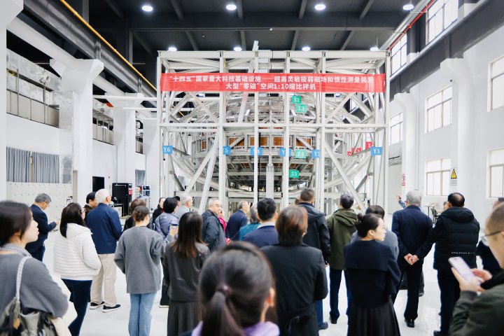 院士团重点考察了“十四五”国家重大科技基础设施——超高灵敏极弱磁场和惯性测量装置及大型“零磁”空间1:10缩比样机。该设施建成后,将挑战极弱磁场测量世界纪录,为前沿基础物理学(如EDM、CPT、第五种力研究)提供极端实验条件,开辟“零磁科学”新方向。