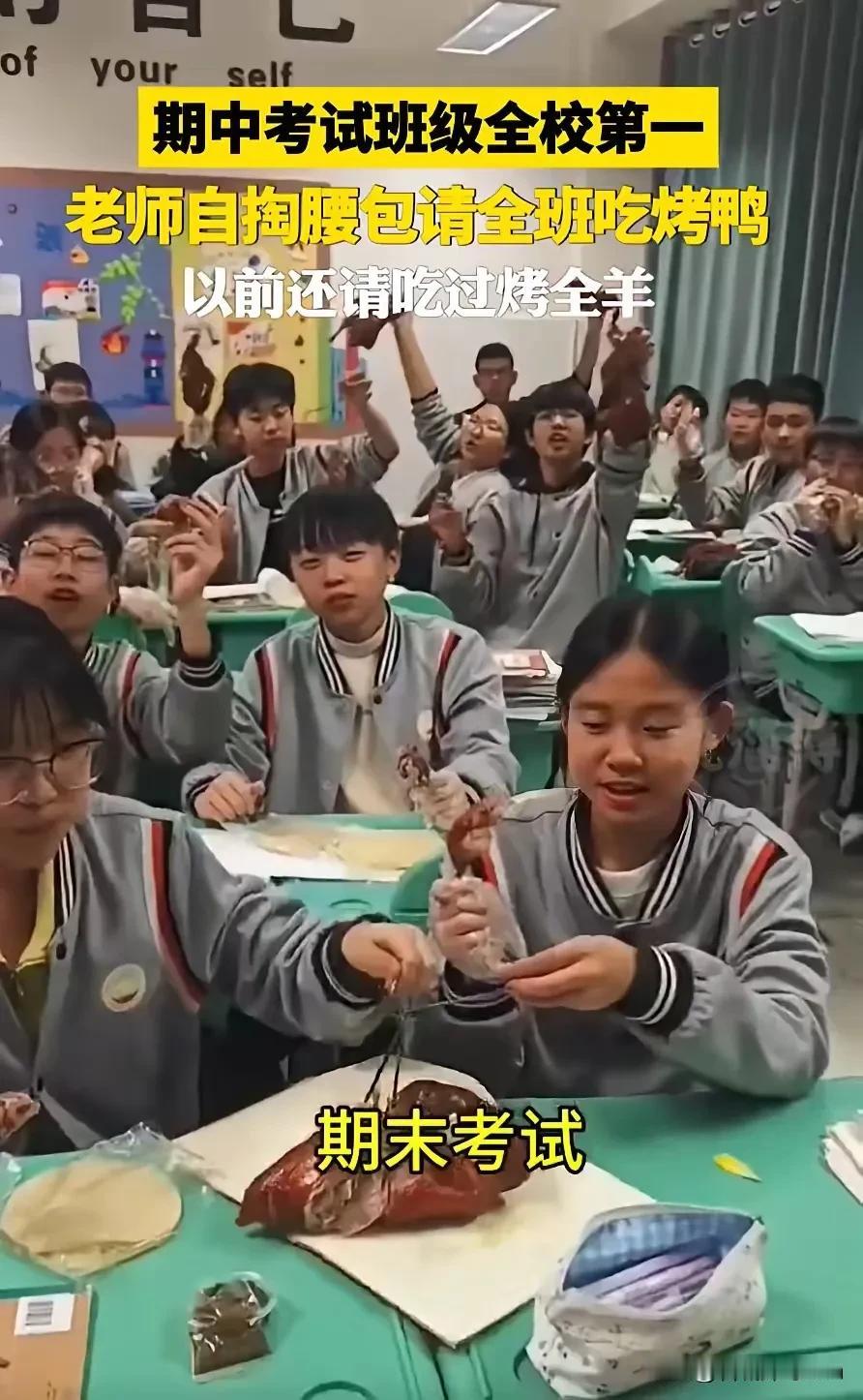 “这位老师火了!” 山东,一位男老师在期中考试成绩公布后,严肃的来到班级讲台前开会,同学们都以为是考得不好要挨批评了,结果却突然反转,原来这次班级考到了全校第一,老师一高兴,直接自掏腰包请全班同学吃烤鸭 教室的空气里,前一秒还绷着的紧张劲儿,下一秒就炸成了欢呼——有人把笔往桌上一摔,站起来拍巴掌;有人凑到同桌耳边喊“我没听错吧”;还有人已经探头往门口望,等着烤鸭送进来。 没人想到,这不是这位老师第一次掏腰包给学生买吃的。之前班级从年级中游冲到前三,他就自掏腰包订了整只烤全羊,让全班在教室里围坐着分着吃,油乎乎的手往校服上蹭两下,又笑着去抢下一块肉。 这次的烤鸭刚拎进教室,焦香的味儿就裹着热气飘满了每个角落。老师没站在讲台边端着架子,而是蹲在过道里,看着学生们戴着手套扯下油亮的鸭腿,有人递给他一块最肥的,他摆着手推回去,说“你们吃,你们考得好,该你们吃”,眼角的笑纹挤在一起,藏都藏不住。 他不是不知道,自己的工资扣掉房贷和家里的日常开销,剩下的也不算宽裕,但他总觉得,学生们早自习顶着黑眼圈背书,晚自习熬到教室只剩最后一盏灯,那些熬出来的分数,不该只换一张印着字的奖状。得是咬一口能爆出油香的烤鸭,是抢食时的笑闹,是实实在在的甜,才能配得上那些熬透的夜。 以前班里的学生见了他,总低着头往走廊边上躲,怕他查未交的作业、说没考好的试卷。现在不一样了,有人会在课间追着他问“老师,下次考好了能吃火锅不”,他笑着回“你要是能把数学选择题再对两道,火锅管够”。 那种隔着讲台的疏离感,早被一口口热乎的美食磨没了,剩下的是凑在一起的热乎气儿——学生知道,这位老师不是站在成绩那一头盯着他们,是站在他们这一头,陪着他们一起往前赶。 没人逼着谁熬夜刷题,可自从上次分吃了烤全羊,课间抱着练习册围到讲台边的人多了一倍。不是怕考差了挨训,是想着“这次再进步点,就能让老师再请吃好吃的”。 这种动力里没有压力的憋闷,只有带着甜头儿的盼头,反倒让成绩涨得更稳。有学生后来偷偷说,以前觉得考高分是为了应付家长和老师,现在觉得考高分能让老师笑,还能和全班一起抢着吃好吃的,这种劲儿比什么都管用。 现在总说教育要“有温度”,可好多时候,这温度都落在了标语里、会议上,没真落到学生身上。这位老师没说过什么宏大的教育理念,只是把自己的工资换成了烤全羊和烤鸭,把关心放进了递到学生手里的那块肉里。 他知道,十几岁的孩子记不住太多说教,但会记着教室⾥飘着烤鸭香的下午,记着老师蹲在过道里看他们吃饭时的笑,记着那种“我们一起变好”的踏实劲儿。 分数是教育的一部分,但从来不是全部。那些藏在烤鸭香里的在意,那些不用多说的心疼,才是能跟着学生走很远的东西——等他们长大,想起中学时代,不会只记得试卷上的红勾和密密麻麻的公式,更会记得满教室的焦香,记得油乎乎的手套,记得那个愿意把钱花在他们身上的老师。那种被实实在在爱着的感觉,会变成他们后来面对生活的底气,让他们知道,努力是会被看见、被珍惜的。 好的教育,从来不是单向的成绩要求,而是双向的温柔回应。这位老师的烤鸭,烤的是学生的努力,暖的是教育该有的温度。 各位读者你们怎么看?欢迎在评论区讨论。