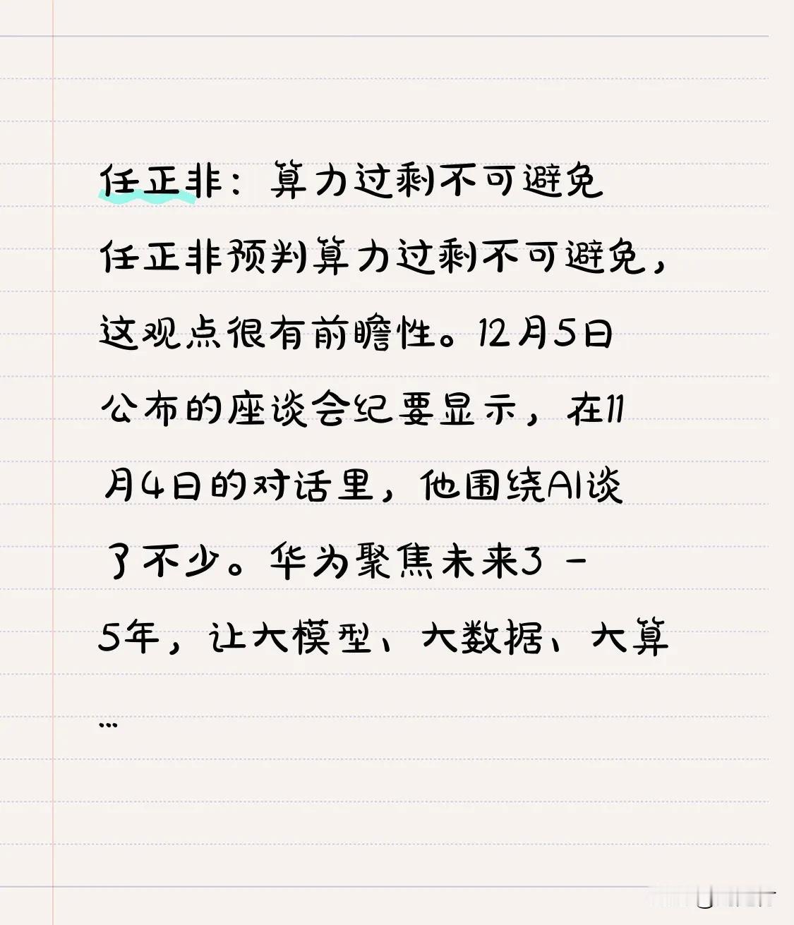 任正非:算力过剩不可避免 任正非:算力过剩不可避免 任正非预判算力过剩不可避免 此观点颇具前瞻性 12月5日公布的座谈会纪要显示 11月4日的对话中 他围绕AI谈了不少 华为聚焦未来3 - 5年 让大模型、大数据、大算力 在工农业、科技产业应用 高炉炼铁、无人挖煤领域皆有实践 他还举例瑞金医院病理大模型助力诊断 乘用车自动驾驶模型等 同时他指出 算力过剩时代会来 建众多大模型是正确探索 另外 中美在人工智能追求方向不同 美国探索通用和超级人工智能 华为更注重解决实际问题 AI算力 华为算力芯片 华为算力大会 AI算力差距
