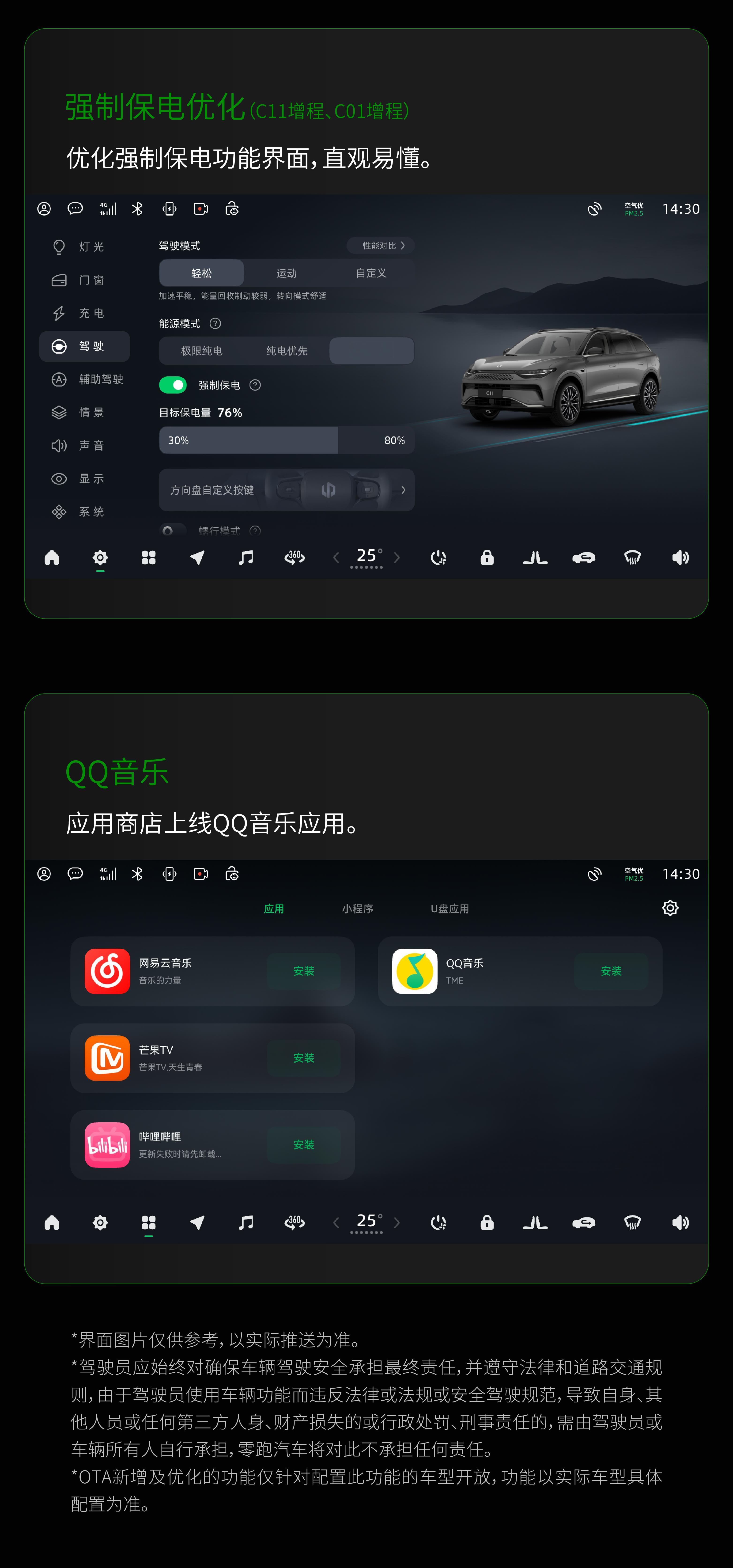 让你的出行生活多点“新鲜感”👀零跑C11/C01 OTA升级来啦!🎉新增发动机温度显示、自定义壁纸桌面卡片优化、QQ音乐等6项功能操作更直观,用车更个性,一键升级,无需等待~😆速戳图片,解锁你的全新体验吧!🎁转发+关注,抽100位幸运儿,送上QQ音乐超级会员年卡1张零跑C11零跑C01 抽奖详情