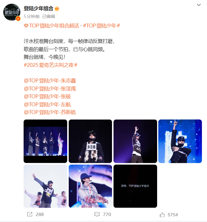 围绕团体动态,登陆少年爱奇艺尖叫之夜彩排出图释出,成员状态专注且配合默契,整齐造