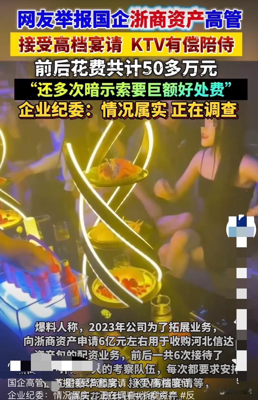 浙江,一公司为了拿下6亿元的国企项目,前前后后接待了3位国企高管6次。在此期间,3位国企高管喝酒必须要喝飞天茅台,抽烟也必须要高档烟,吃饭、住所也不能落下,必须是五星级的,不仅如此,饭后还要进行第2场,到KTV叫美女陪侍。 公司前前后后花了50多万元,本以为项目十拿九稳,结果其中一名国企高管还不满足,暗示索要巨额好处,而因为公司拒绝,项目最终流产。 6亿项目黄了,50多万元的招待费也打了水漂,公司不愿意了直接将此事捅了出来。还将3名国企高管接受宴请的相关视频晒了出来。 视频显示,在一家KTV的包厢内,三名国企高管均左搂右抱,围坐着2名年轻陪酒女性。 该事一时间引起热议,网友纷纷表态。有网友要求严惩严惩! 但也有网友表示,这很现实,6个亿的项目不是小数目,花100万元都不多。公司这么做,以后很难再接到国企项目。 那从法律上该如何看待此事呢? 首先,《党政机关厉行节约反对浪费条例》,明确严禁利用公款进行不必要的宴请、高档消费,禁止在公务活动中大吃大喝、铺张浪费。 《中国共产党纪律处分条例》第101条也明确规定了,对接受、提供可能影响公正执行公务的宴请、违规出入私人会所吃喝等行为的处分规定。 具体到本案,单纯从接受有利害关系的公司吃喝来说,涉案3名国企高管已经是违规违纪! 其次,《治安管理处罚法》第66条规定,卖淫、嫖娼的,处10-15日拘留,可以并处5000元以下罚款;情节较轻的,处5日以下拘留或者500元以下罚款。 涉案3名国企高管接受有偿陪侍,还可能涉嫌违法,面临罚款、拘留。 利用职务上的便利,主动向他人索要或勒索并收受财物的行为,其实就是索贿。 而即便未成功,最终未拿到钱,也不影响行为的定性!只是说属于未遂,可以比照既遂犯从轻或者减轻处罚。 根据《刑法》第382条及相关司法解释的规定,国家工作人员受贿数额在3万元以上不满20万元的,就属于“数额较大”,依法判处3年以下有期徒刑或者拘役,并处罚金;在20万元以上不满300万元的,属于“数额巨大”,依法判处3-10年有期徒刑,并处罚金或者没收财产;在300万以上的,处10年以上有期徒刑或者无期徒刑,并处罚金或者没收财产;数额在300万以上,并使国家和人民利益遭受特别重大损失的,处无期徒刑或者死刑,并处没收财产。 权力是公器,不是用来换取声色与利益的筹码。 据悉,目前3名涉事国企高管已经被单位停职,且已经向纪委承认违规吃喝等问题。等待涉事3名国企高管的将是法律的严惩! 最后,应当注意的是,3名国企高管需要面临严查严惩,但是公司也不能侥幸! 涉事公司面对涉案国企高管的无理要求,可以明确拒绝,而为拿下国有项目,安排五星级酒店、高档宴请和有偿陪侍,本质上是对国企高管的“围猎”! 既违反了政府采购的公平竞争原则,其实也是变相地在向国企高管行贿,不仅已经花的钱不能追回,同样需要承担法律责任。 因而,也再次提醒企业,牢记靠实力争取业务才是长久之计,“心存侥幸”靠走“旁门左道”争取业务,不仅可能会鸡飞蛋打,还有可能引火烧身! 这事您怎么看?欢迎在评论区留言,与大家一起交流您的看法! ------ 关注@安律说法 案例中看人生百态,法律中寻破局之法!
