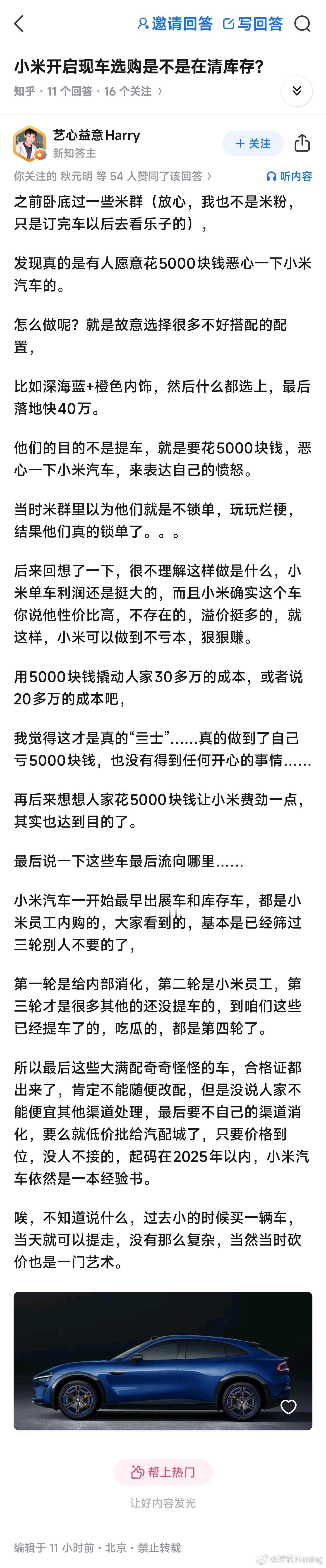 还记得su7刚出来那会儿,有人说打算锁单但是不要车,用5000块撬动小米几十万成本。当时大家都把这当笑话来看,但是最近小米YU7现车配置放出来之后,各种稀奇古怪的选配,大家发现,好像真的有人在这么干,太恐怖了,什么样的思想才会让人做出这种事